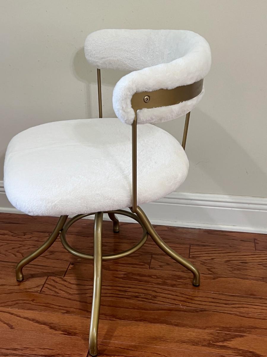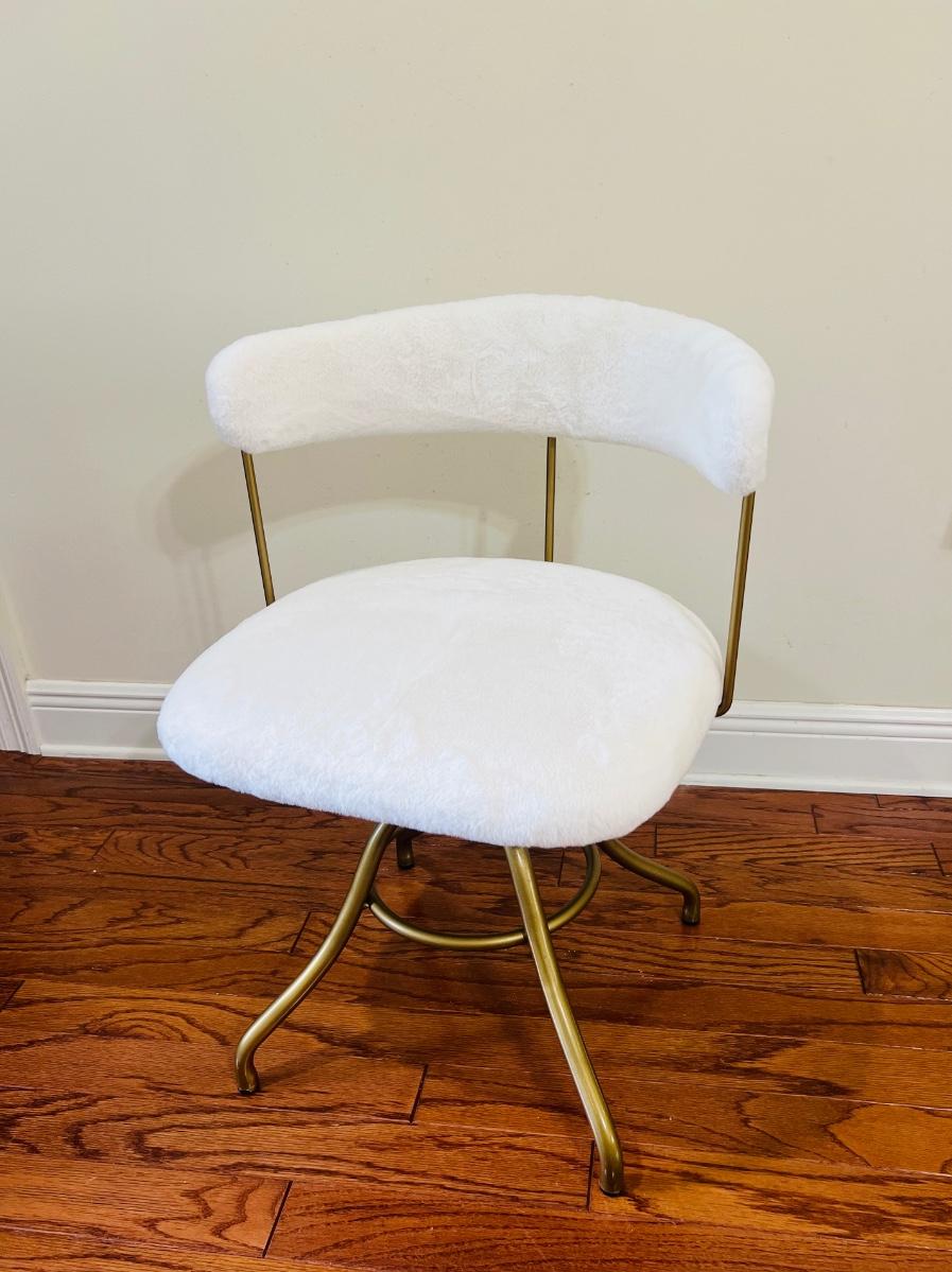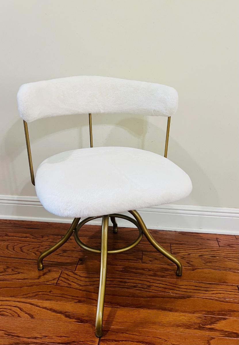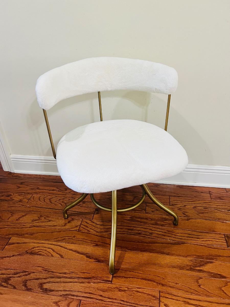 Like New, White and Gold Faux Fur Task adjustable Chair. As pictured measures 29 inches tall, 20 inches wide and 20 inches deep. Seat cushion measures 19 inches deep by 19 inches wide.