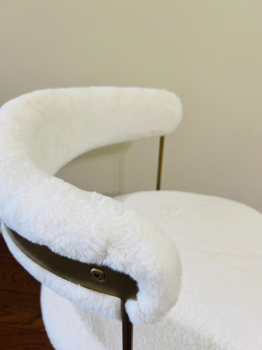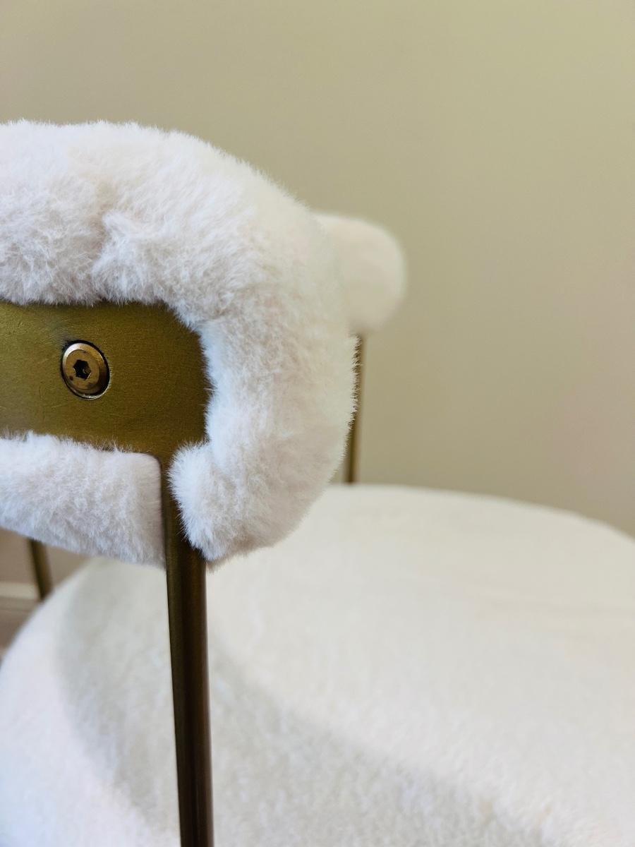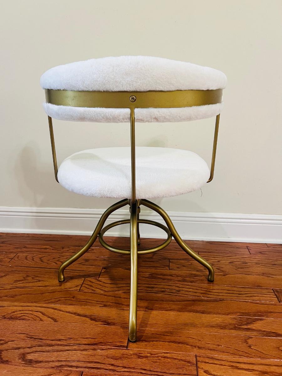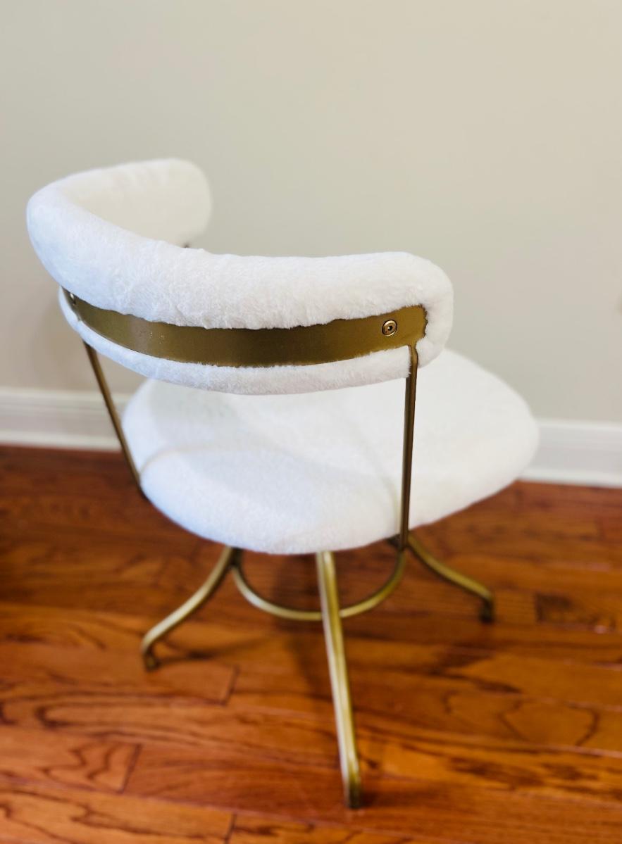 Like New, White and Gold Faux Fur Task adjustable Chair. As pictured measures 29 inches tall, 20 inches wide and 20 inches deep. Seat cushion measures 19 inches deep by 19 inches wide.