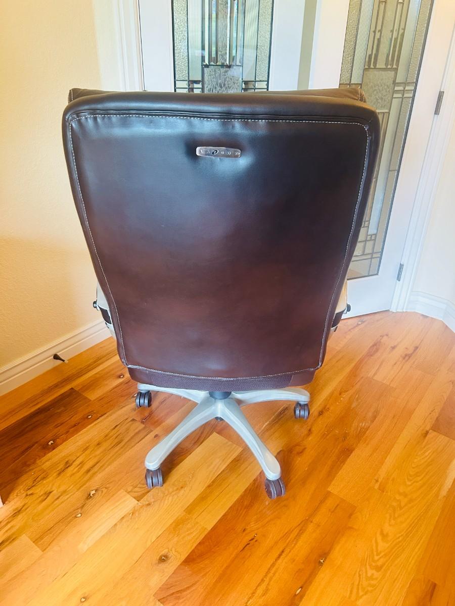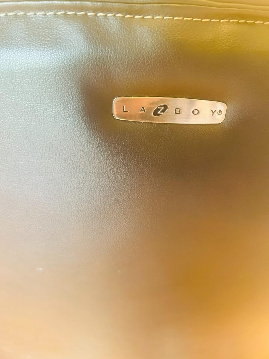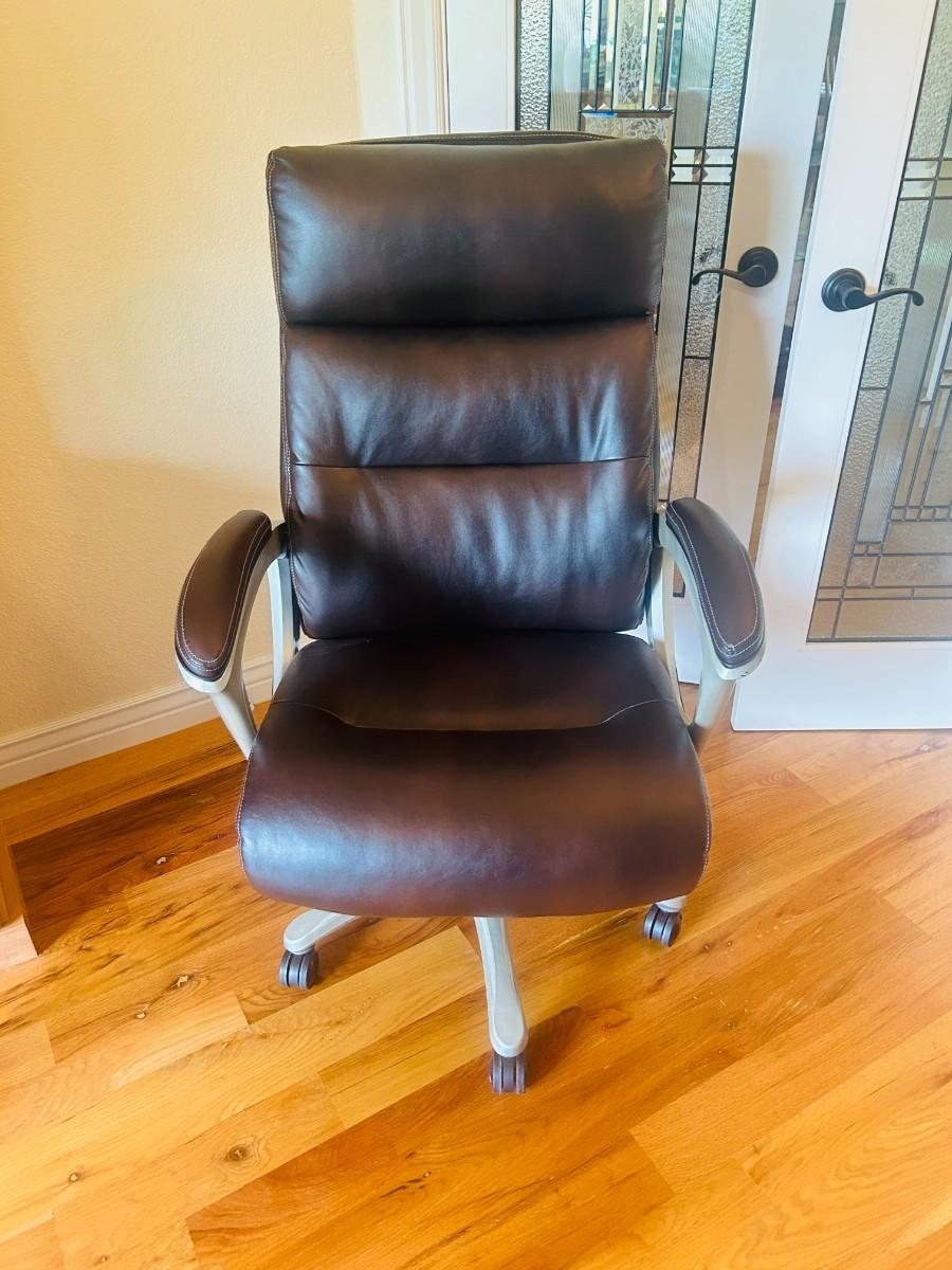 LIKE NEW LEATHER LAZYBOY DESK CHAIR WITH COMFORT CORE AND CHAIR ROLLING MAT