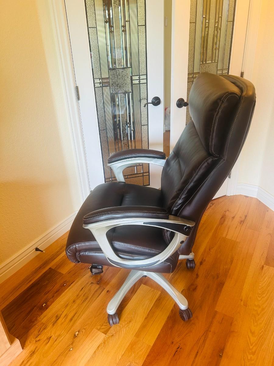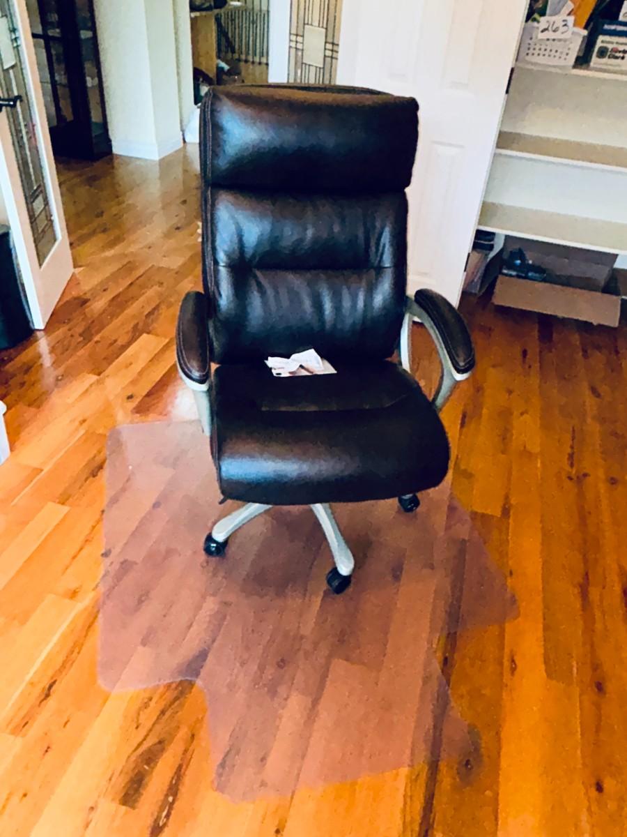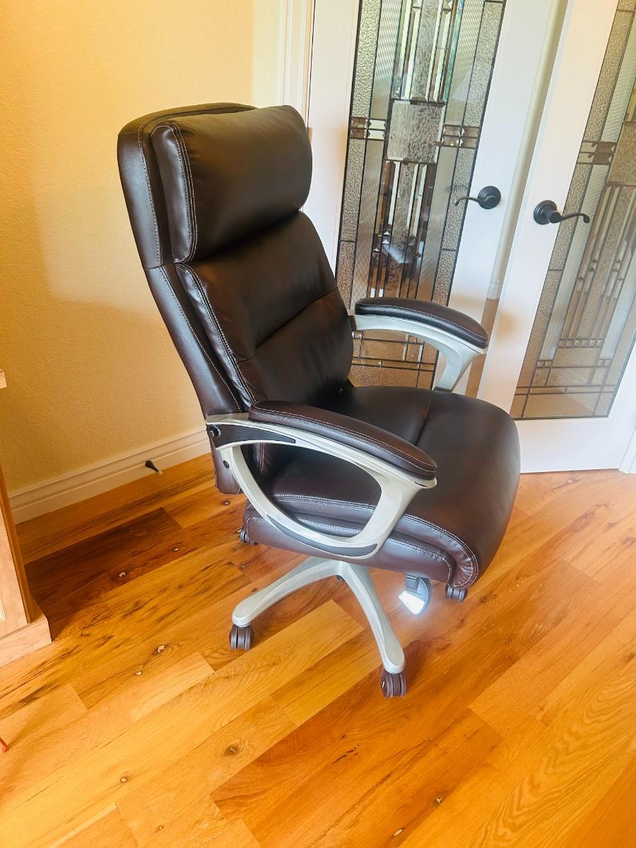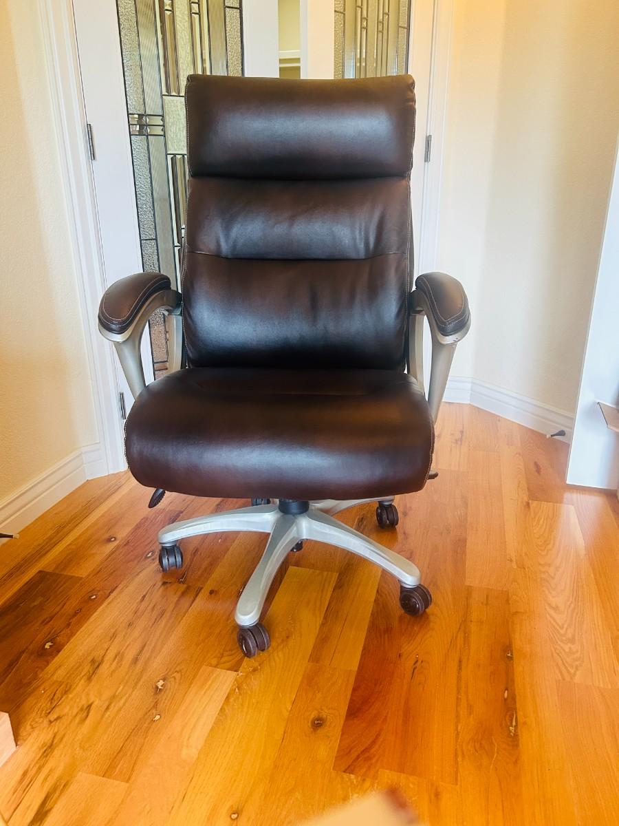 LIKE NEW LEATHER LAZYBOY DESK CHAIR WITH COMFORT CORE AND CHAIR ROLLING MAT