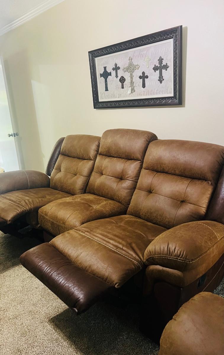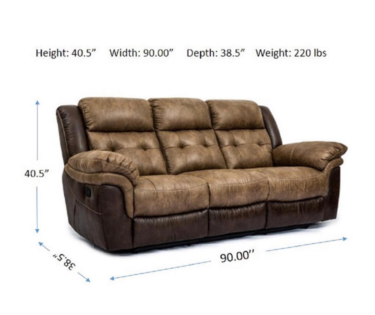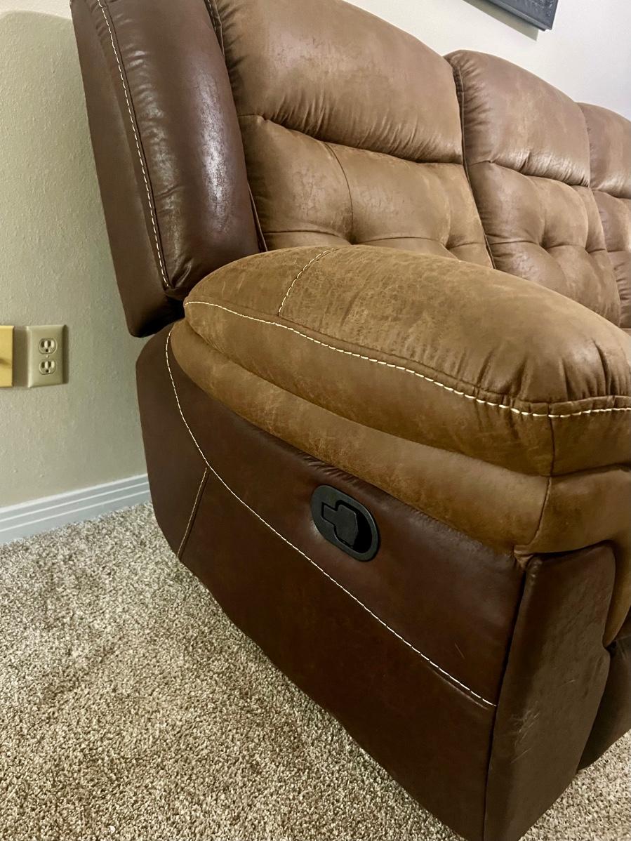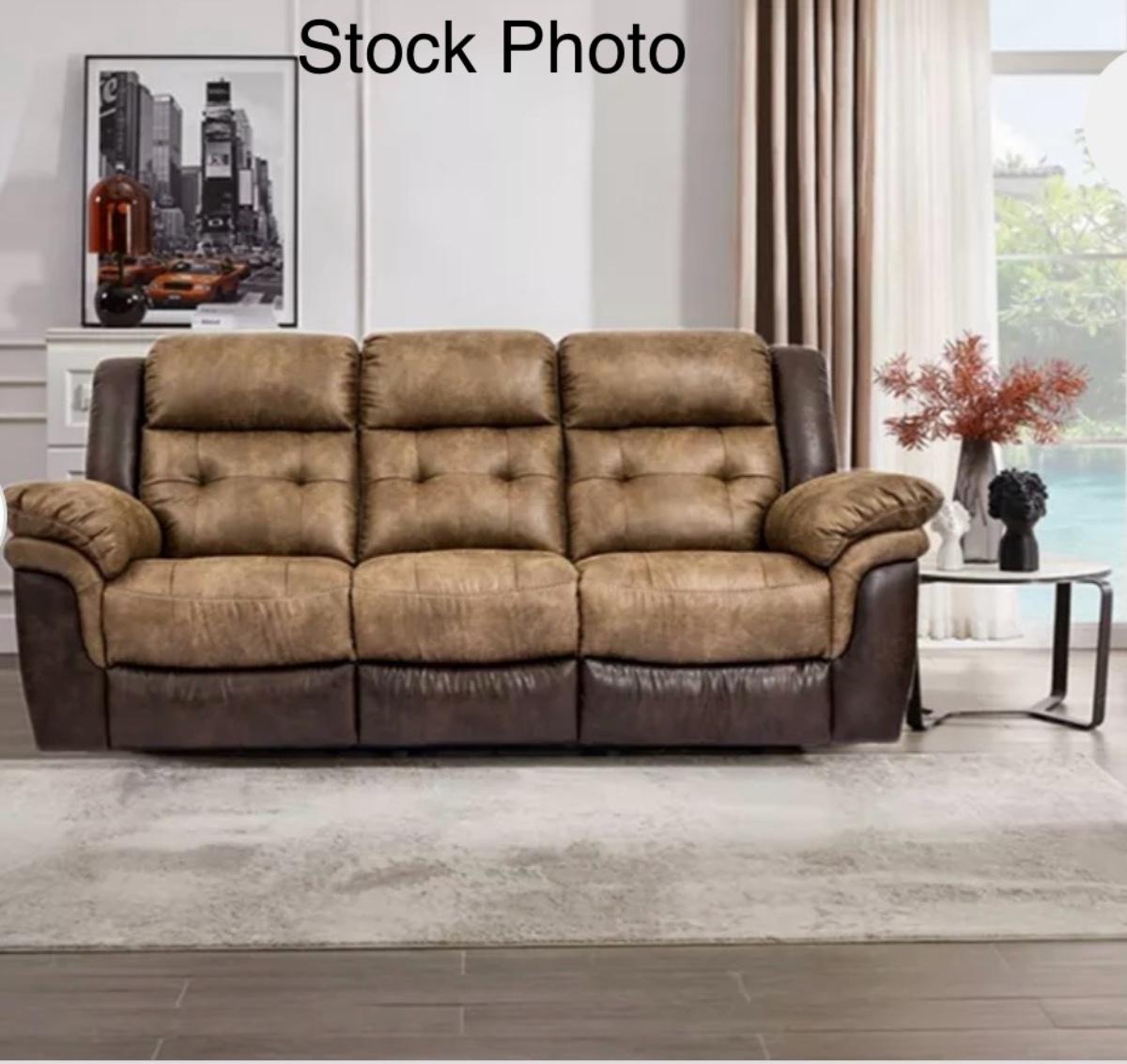 LIKE NEW MESSA Dual Reclining Sofa Two Tone Brown Reclines on both ends.