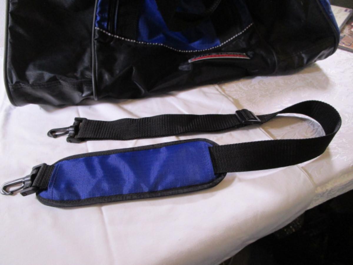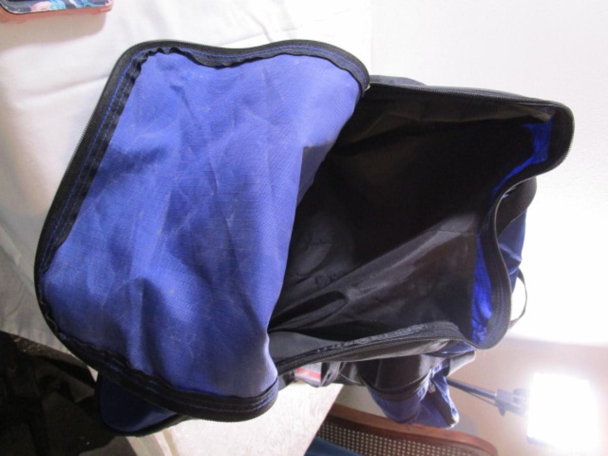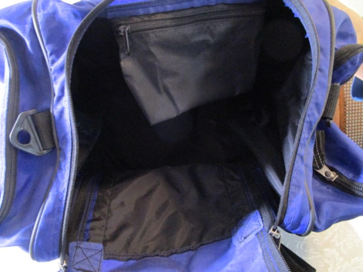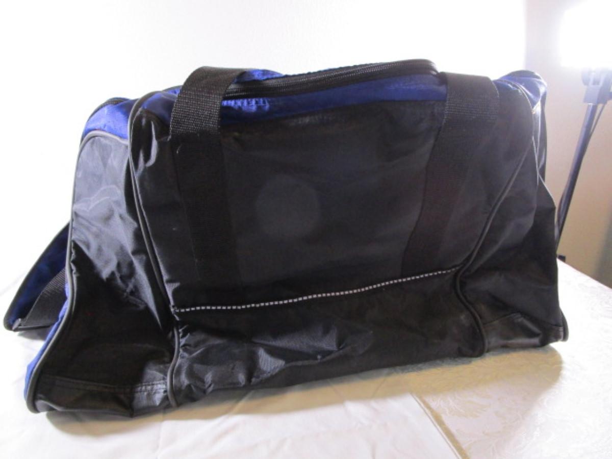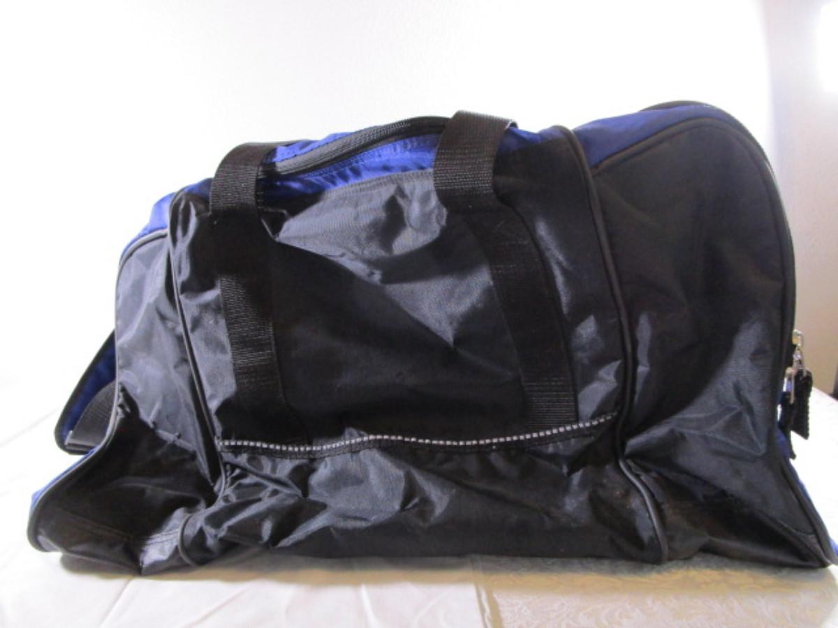 Blue & black, has zippered side pockets, shoulder strap, large main compartment, ID tag, 24" long x 14" wide x 15" tall