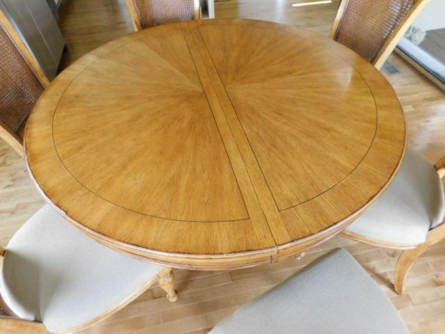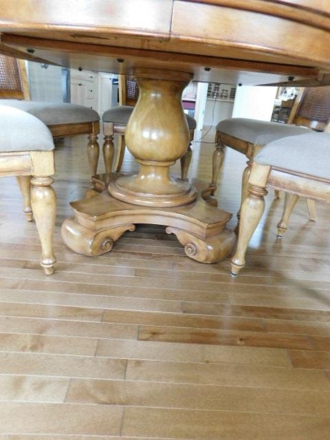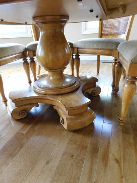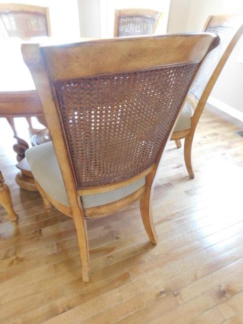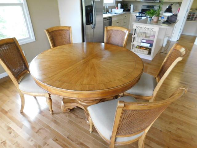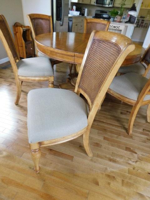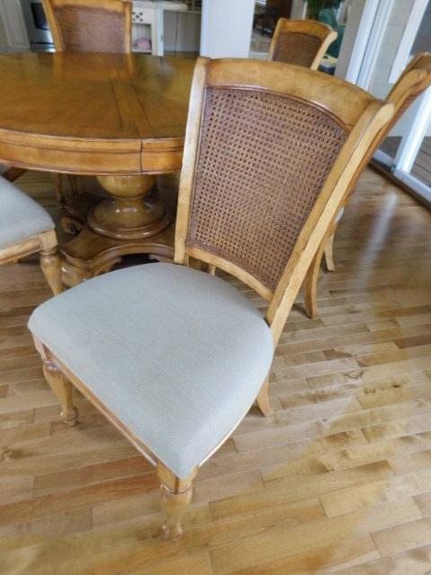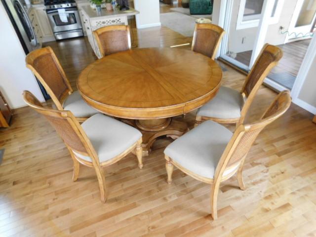 Like New Sandalwood Table and Six Cane Back and Upholstered Seat Chair Set 53"dia. Includes One 22"w Leaf. Main floor