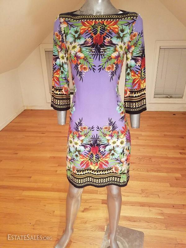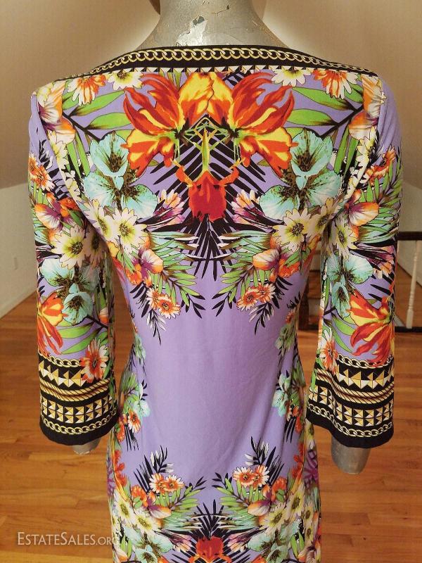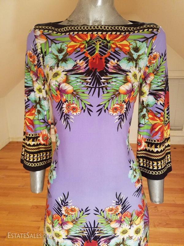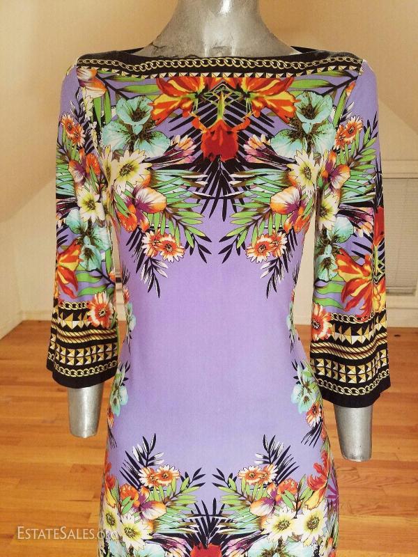 and so is the floral design kind of reminder of Maurice style dresses of the 1960's or Versace. In amazing condition and a stunner