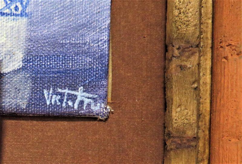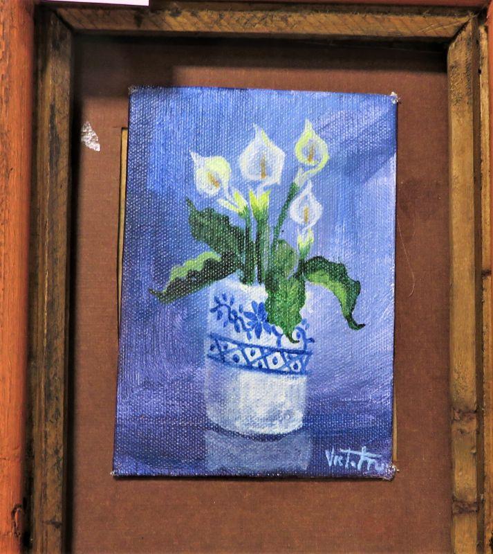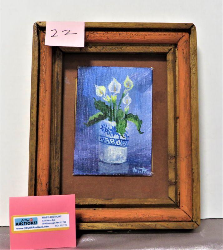 Vintage Calla Lily Flowers in Pot - Oil on Canvas panel Signed by Vict. Martiner. Vintage Wood Frame Measures 11" x 8.5". Please preview and email questions / concerns prior to bidding.