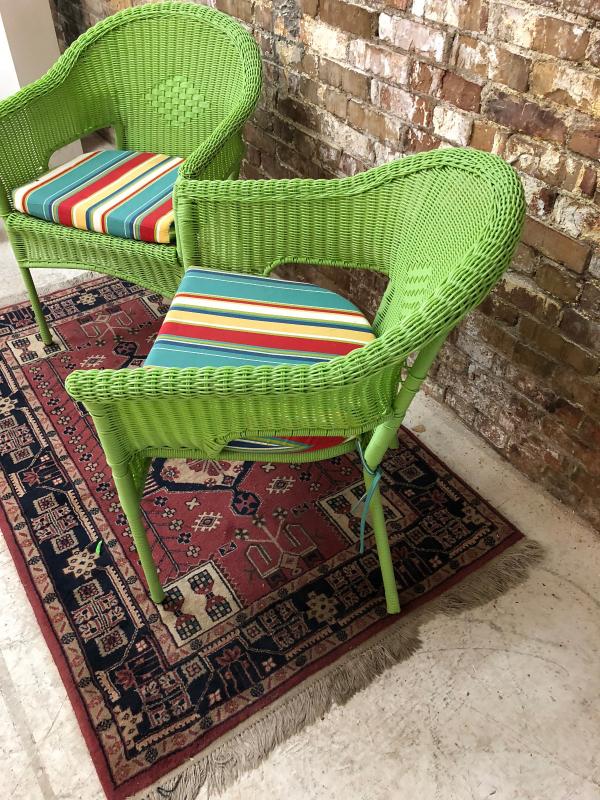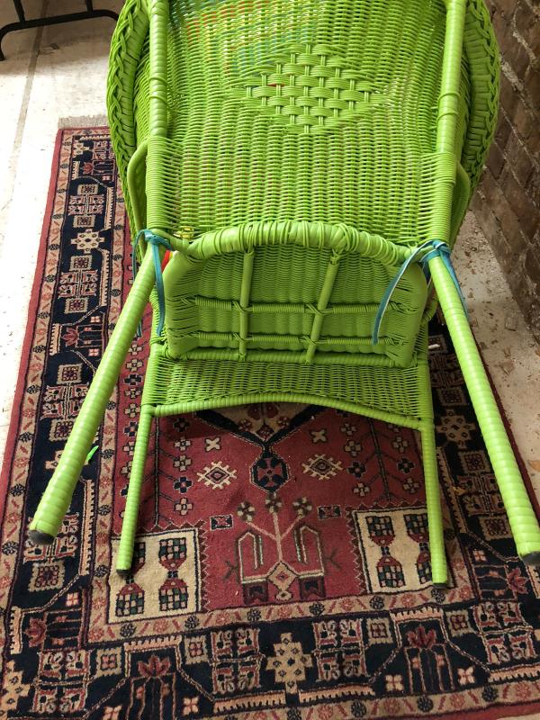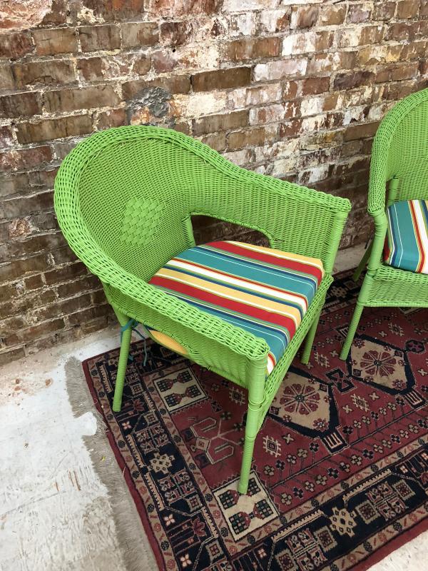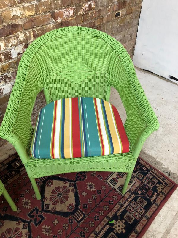 Good condtion, sturdy and clean, hole in one cushion. Plastic wicker.
