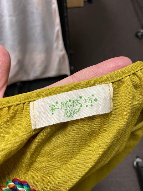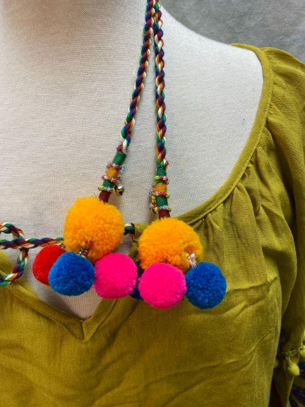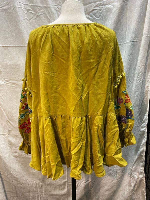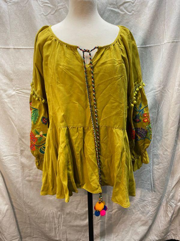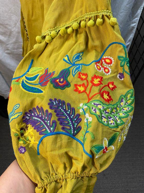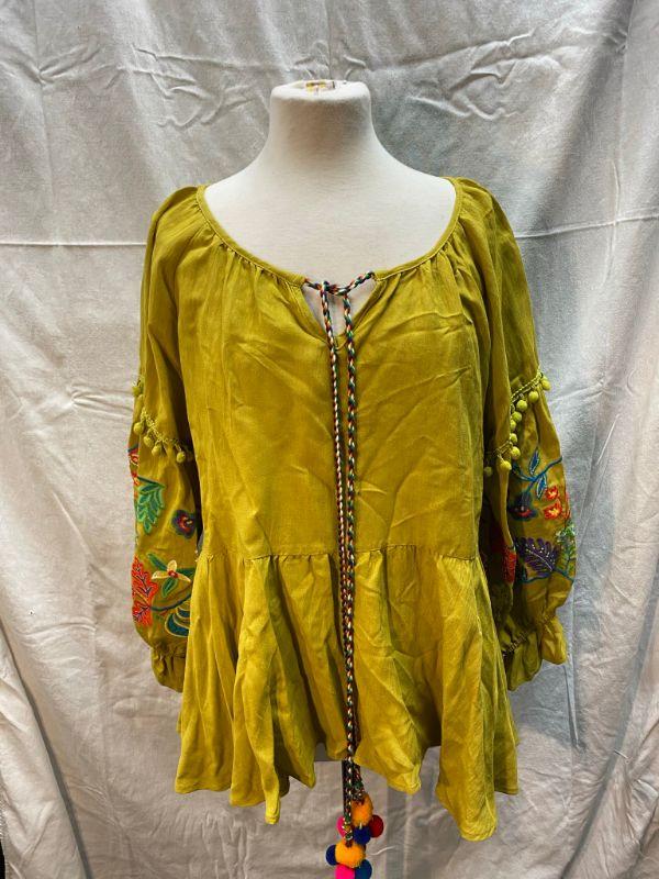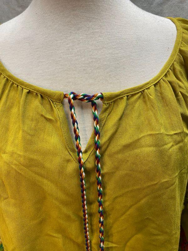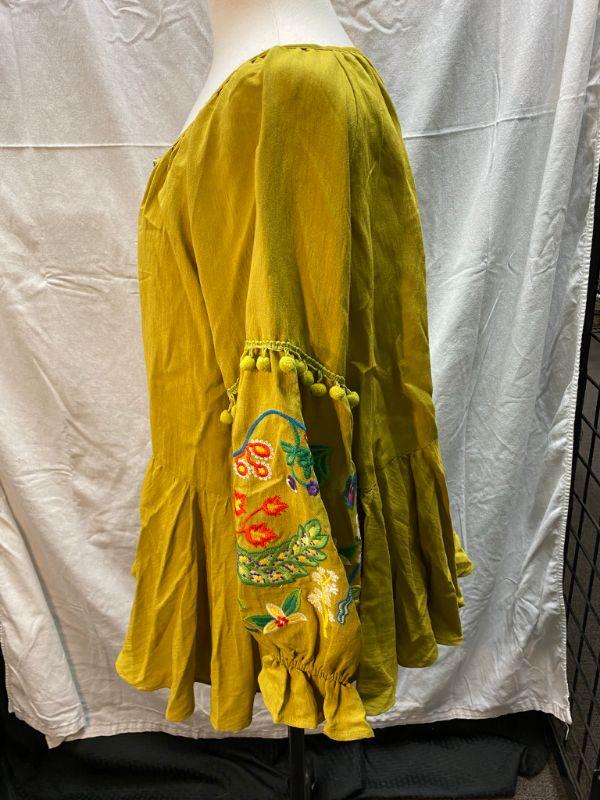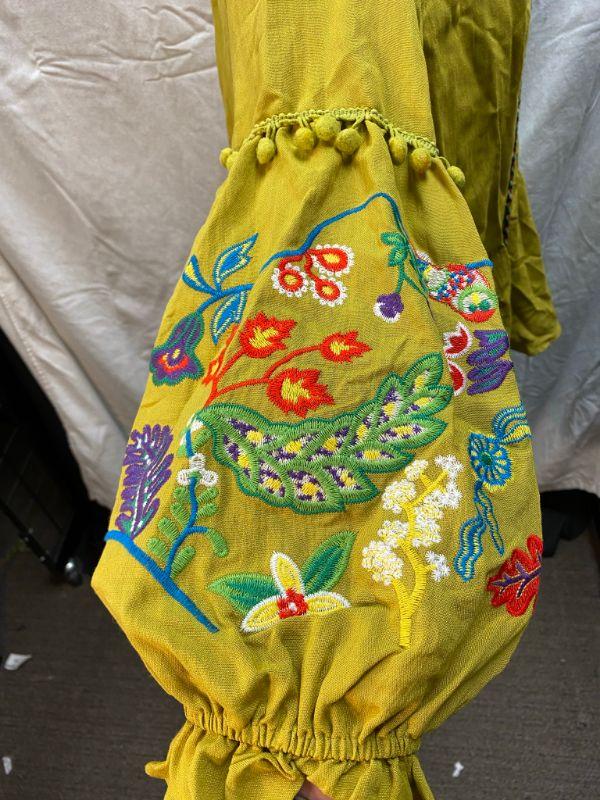 Lime green peasant style blouse. Tie neck, elastic at the cuff. Arms have colorful floral pattern embroidered on them. Did not have a size tag, but most clothes in this estate were size large/xl. Good condition.
