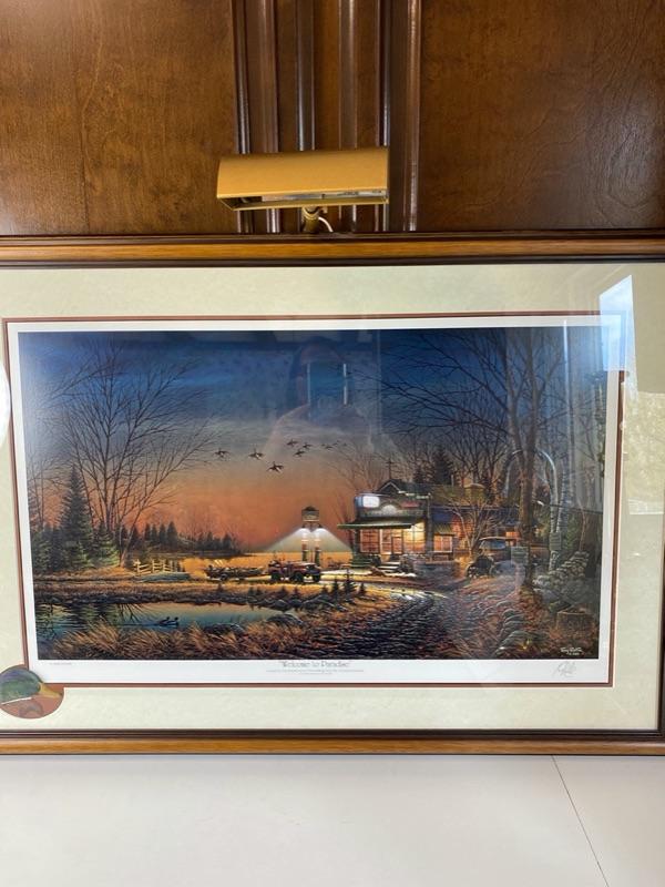 Terry Redlin, "Welcome Paradise" limited edition print in wood frame with certificate of authenticity included. Fine art attatched lamp included.