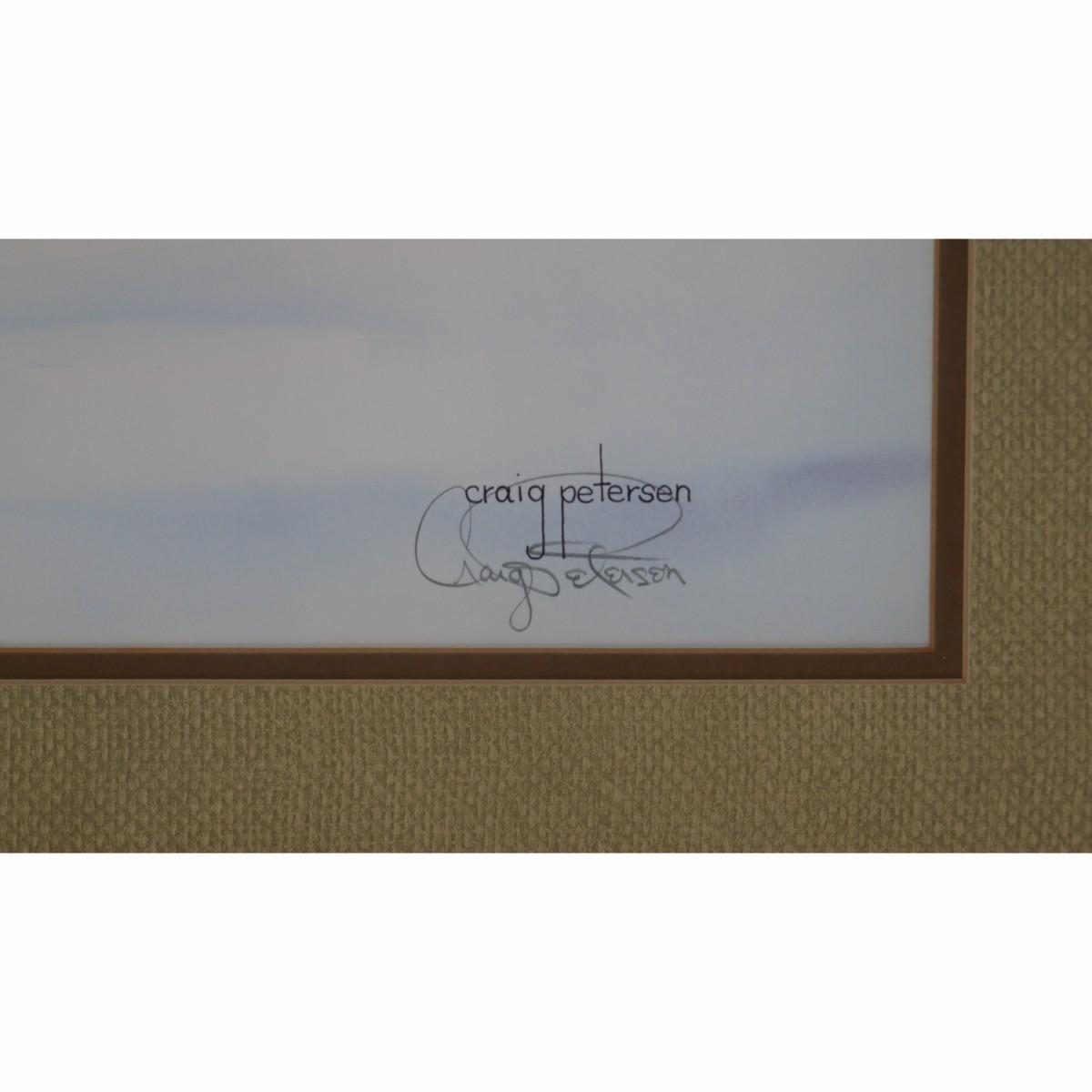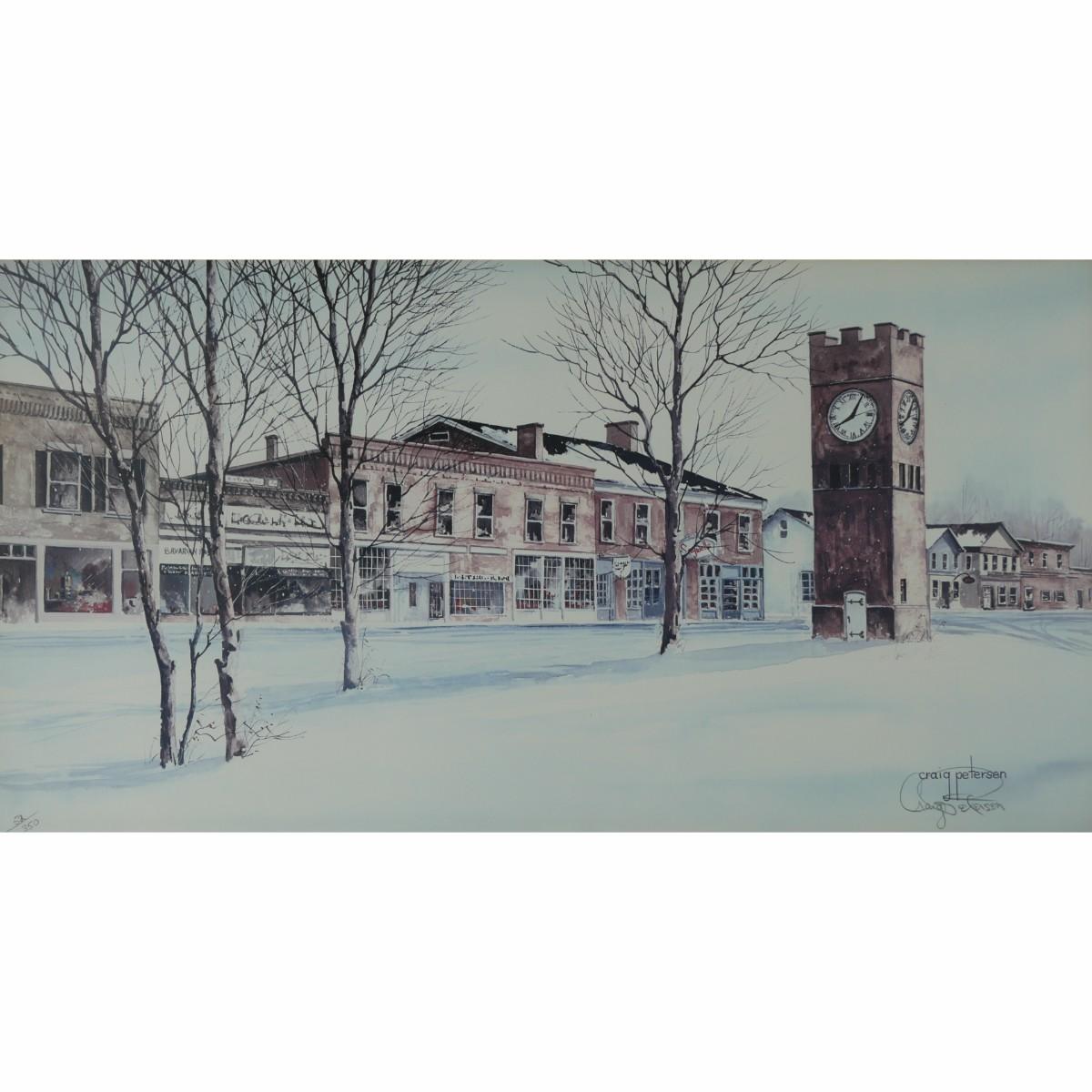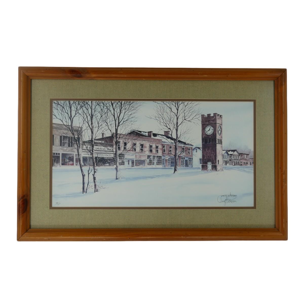 "Main Street Hudson Ohio" watercolor print by Craig Peterson. Double-signed by artist, one print and one pencil signature in bottom right corner. Beautiful snowy winter's day in Ohio with beautiful buildings and clock tower. Limited edition, numbered 52/350. Framed and matted. Art is in excellent condition, wood frame has wear. Art measures 22.5" x 11.75", total frame measures 30" x 19.5". (A29)