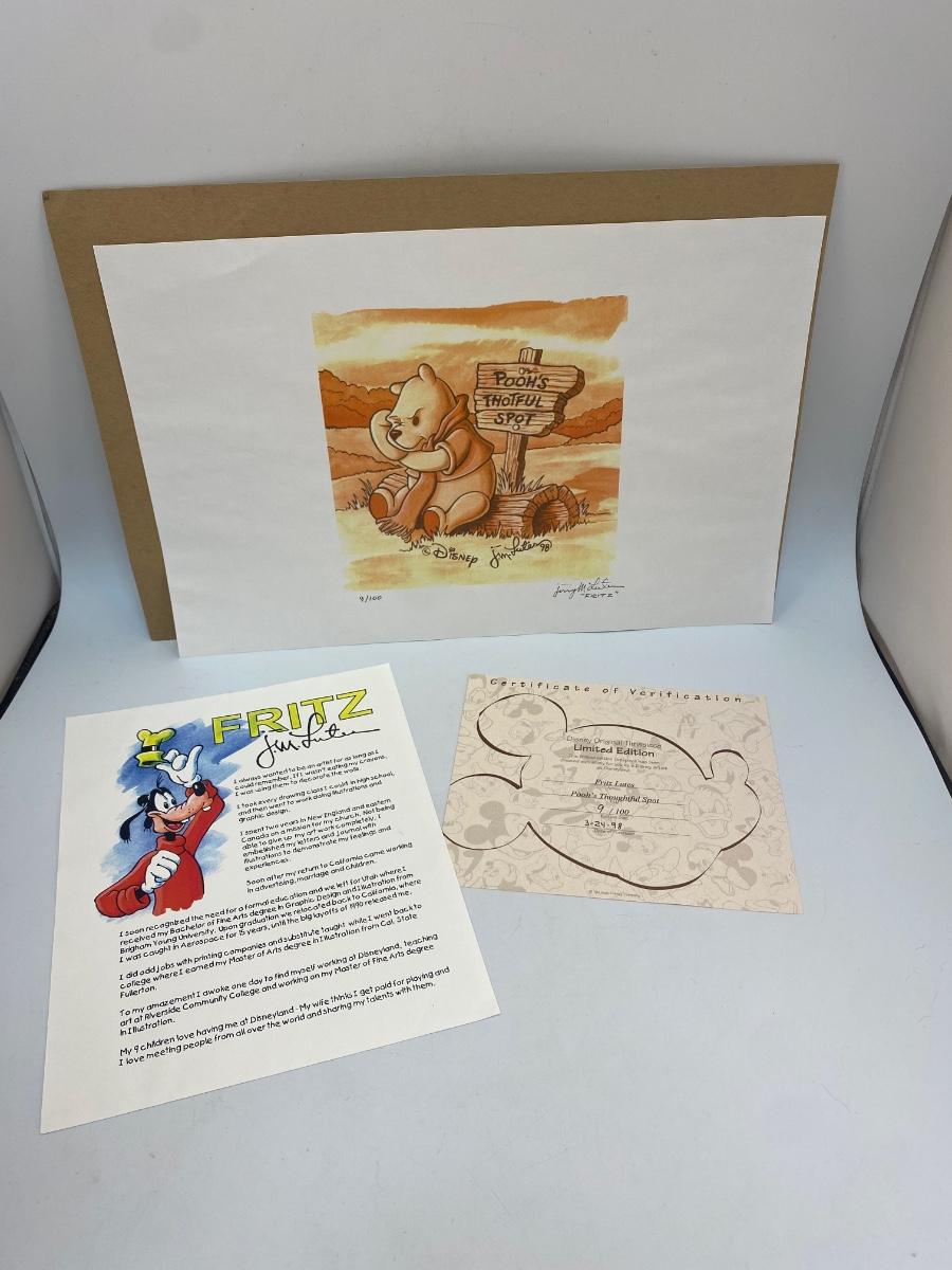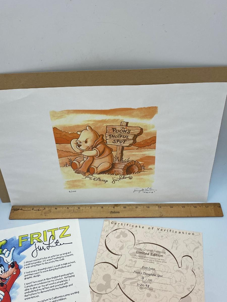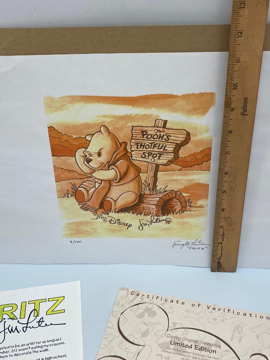 Limited Edition "Pooh's Thoughtful Spot" a Disney Original Timepiece Art by Fritz Lutes. Comes with COA and artist bio card. #9/100. Unframed. In good condition, dated 1998.