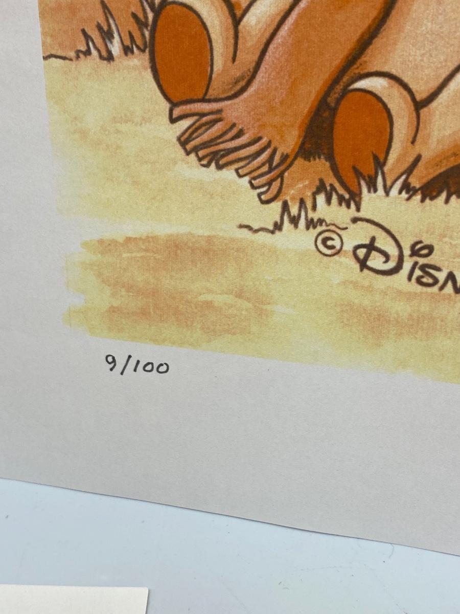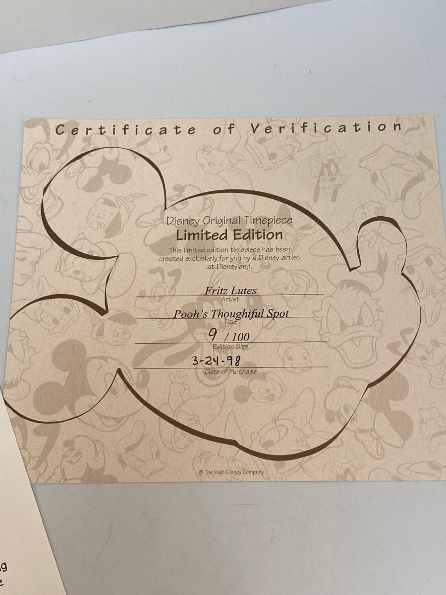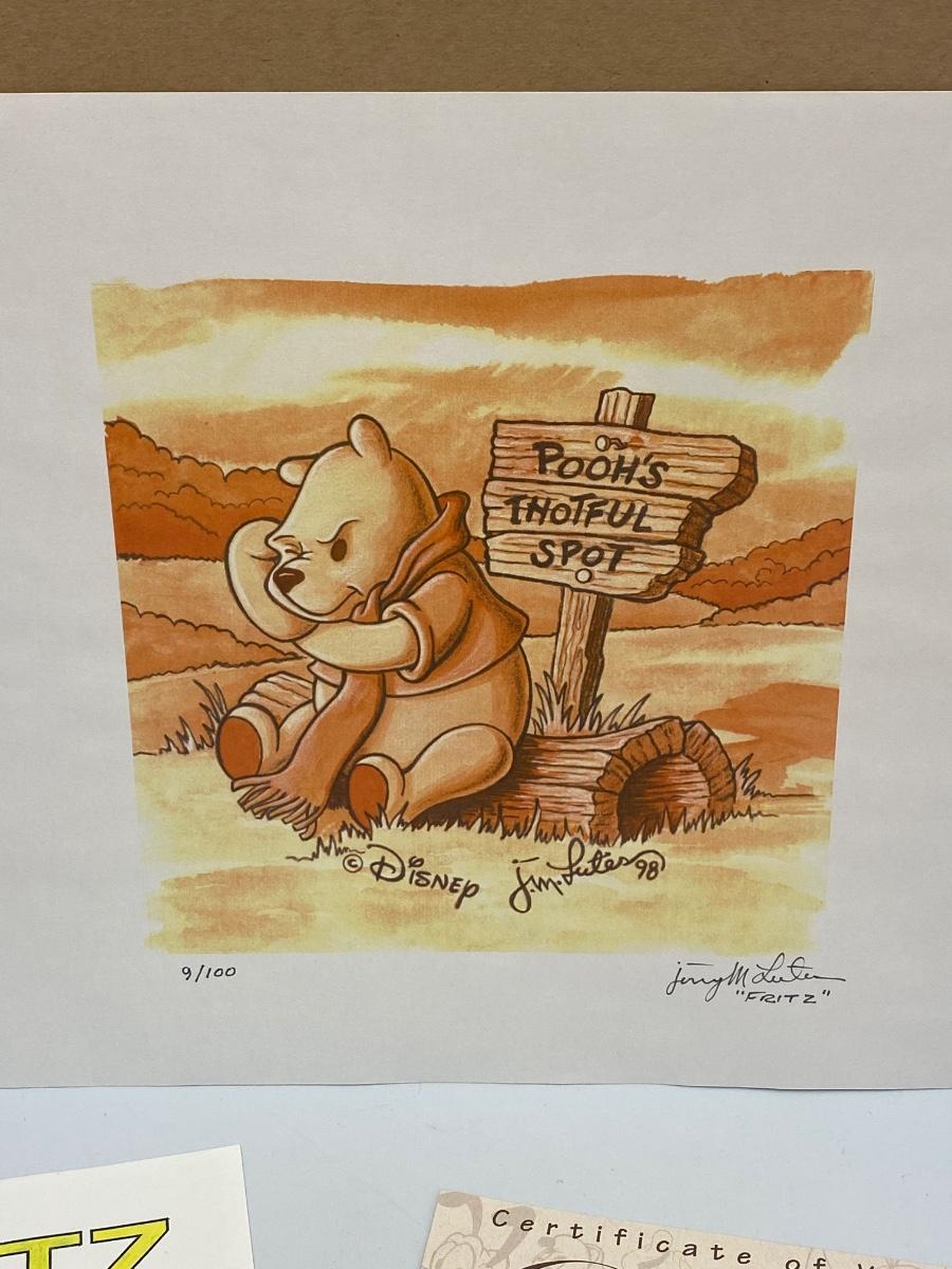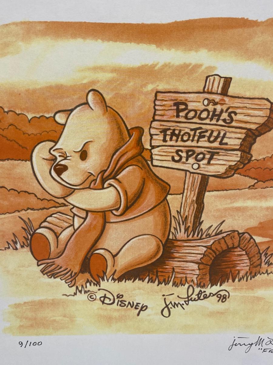 Limited Edition "Pooh's Thoughtful Spot" a Disney Original Timepiece Art by Fritz Lutes. Comes with COA and artist bio card. #9/100. Unframed. In good condition, dated 1998.