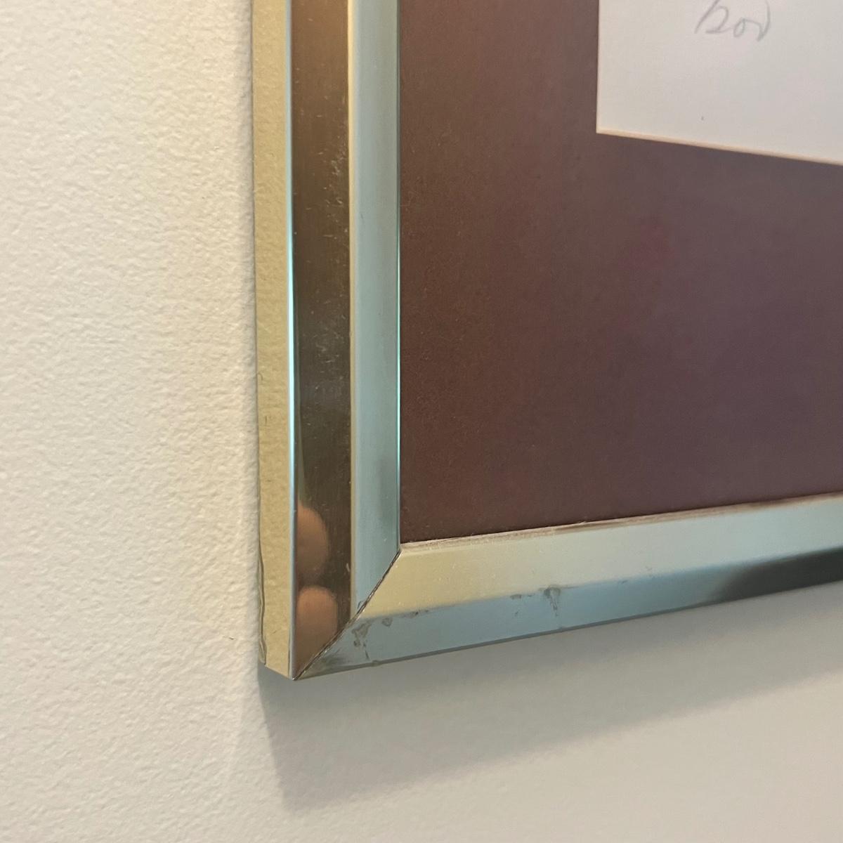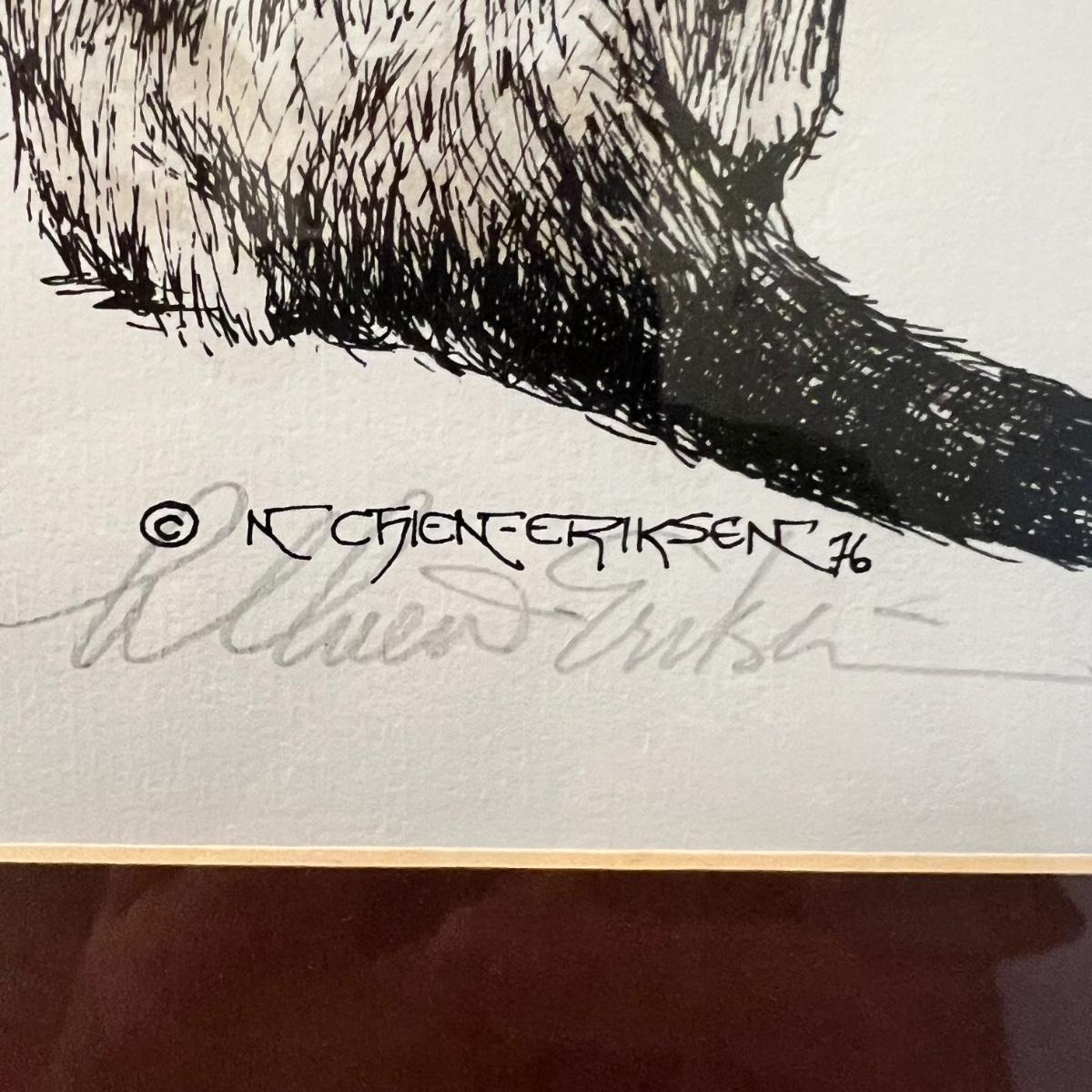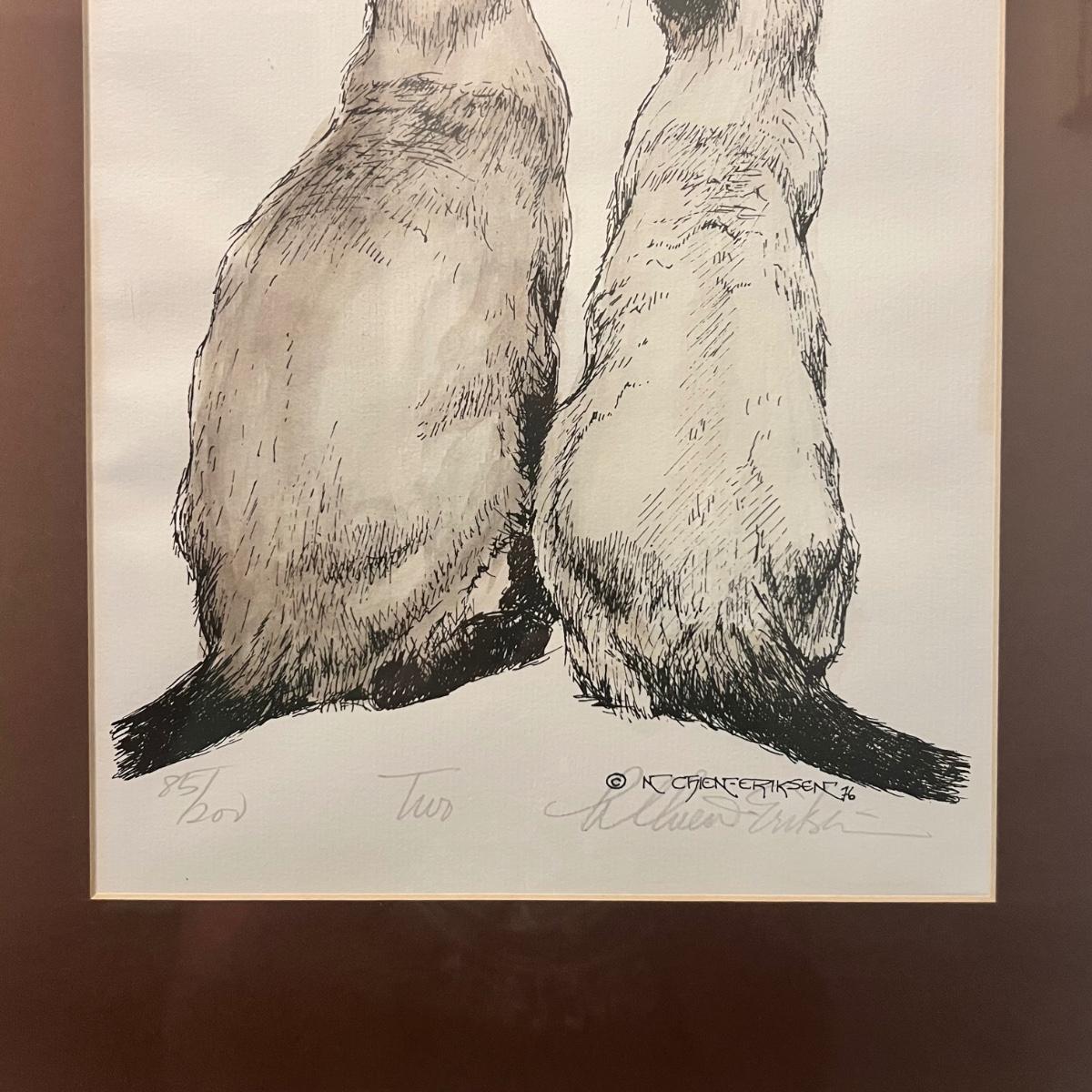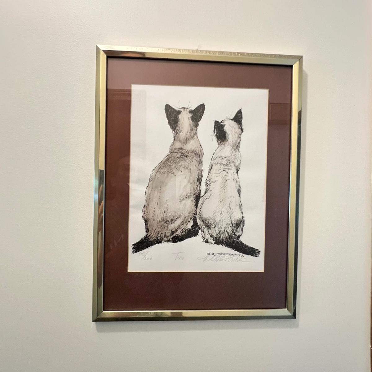 A lovely pair of Siamese cats by Nancy Chien Eriksen. Numbered 85/200, this print is both artist-stamped and pencil-signed. Matted and mounted under glass in a gold-colored metal frame. Frame has a small dent, see image.