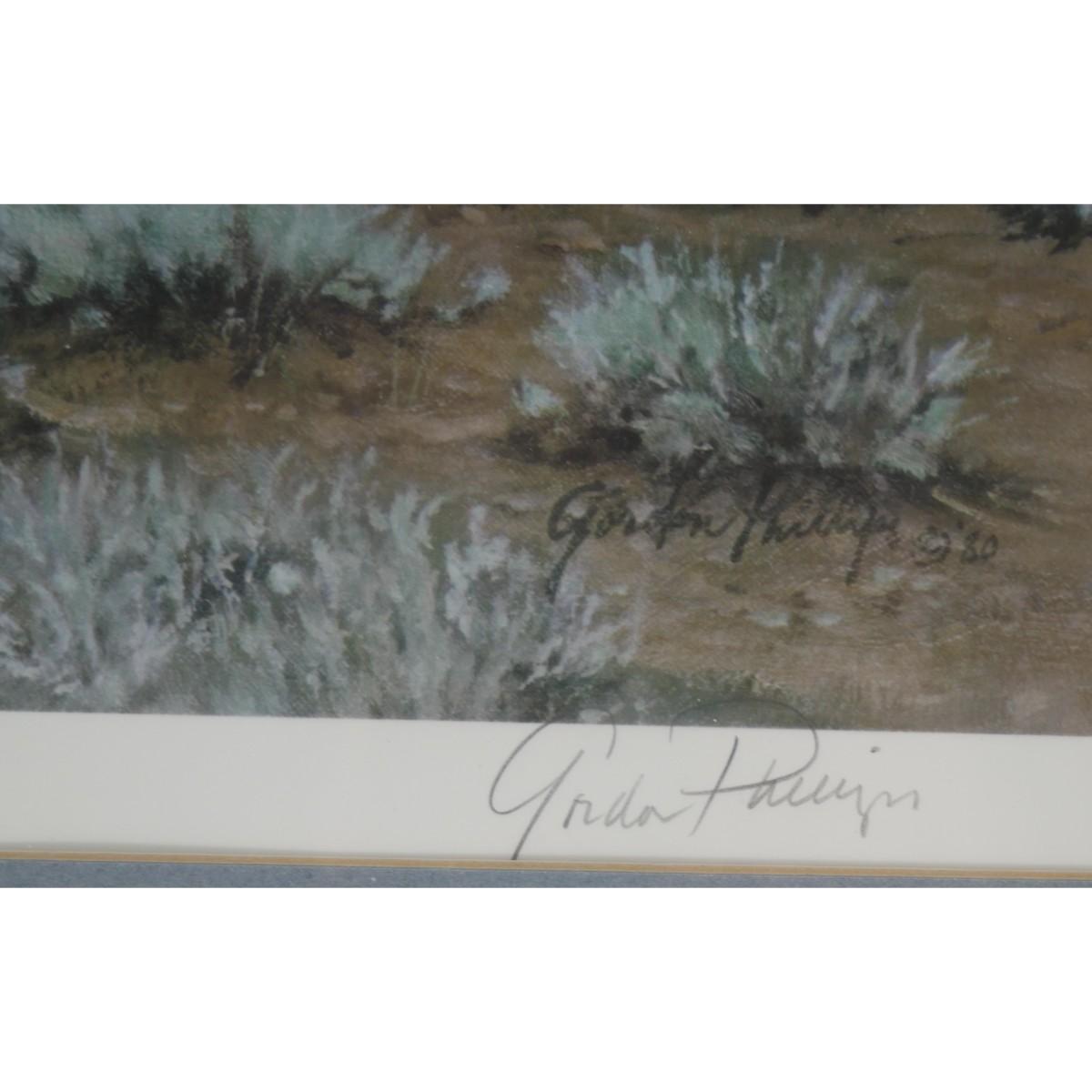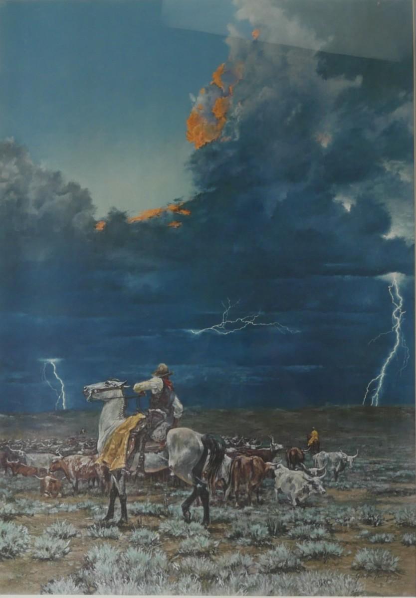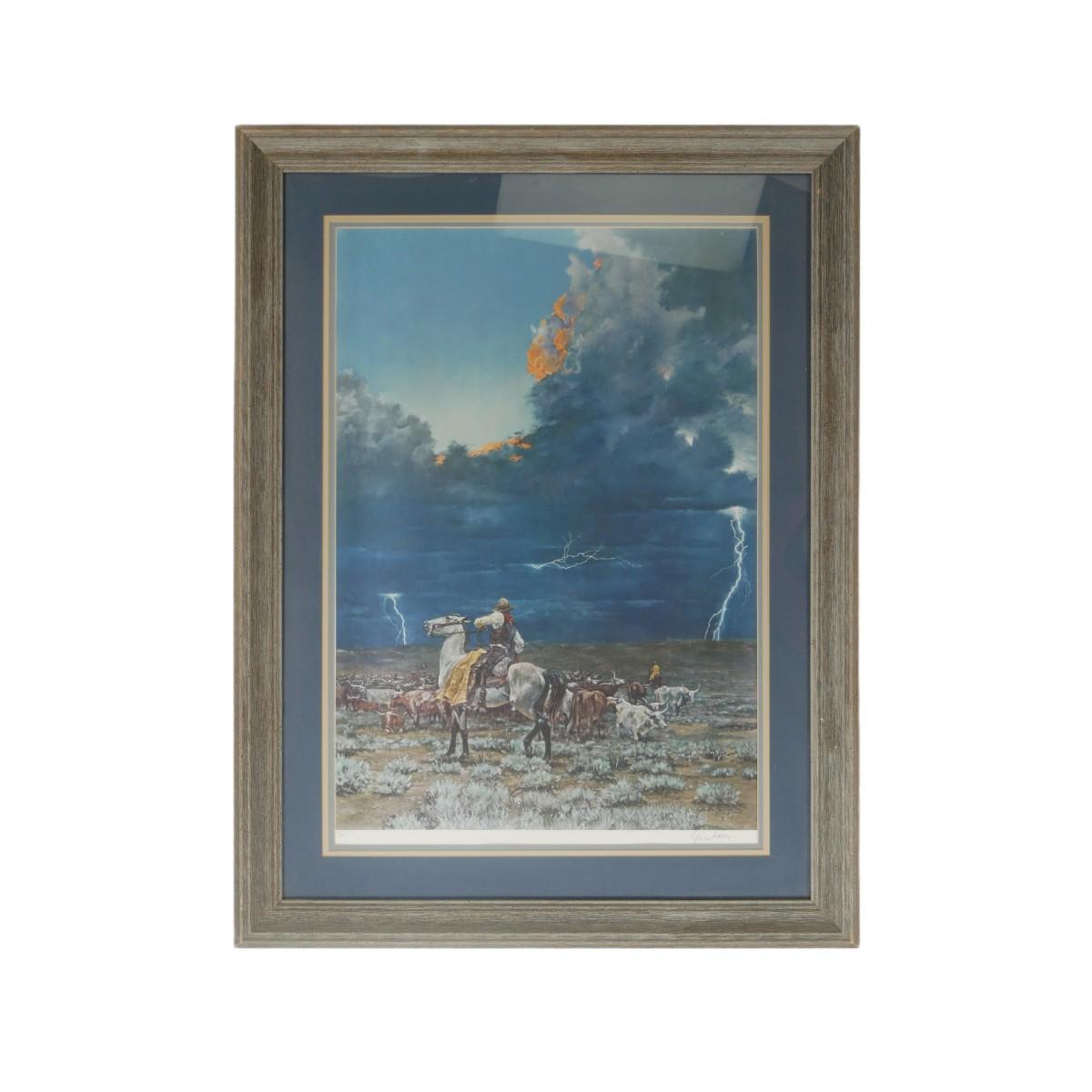 Limited edition "Ready to Run" double-signed framed print by Gordon Phillips. Print signed "Gordon Phillips '80" and hand-signed in bottom right. Numbered 38/950. Art depicts western scene of cowboys corralling cattle as a thunderstorm rolls in. Gorgeous piece and beautiful frame. Professionally matted and framed under glass. Frame has slightest wear from age. Art measures 18" x 27", total frame measures 27.25" x 36" x 1". (A59) *This is a large piece, reach out to us for a shipping quote prior to placing a bid*
