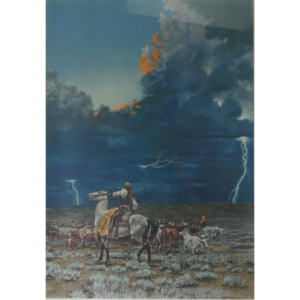 Limited edition "Ready to Run" double-signed framed print by Gordon Phillips. Print signed "Gordon Phillips '80" and hand-signed in bottom right. Numbered 38/950. Art depicts western scene of cowboys corralling cattle as a thunderstorm rolls in. Gorgeous piece and beautiful frame. Professionally matted and framed under glass. Frame has slightest wear from age. Art measures 18" x 27", total frame measures 27.25" x 36" x 1". (A59) *This is a large piece. For shipping, this lot will have a $30 boxing fee applied*