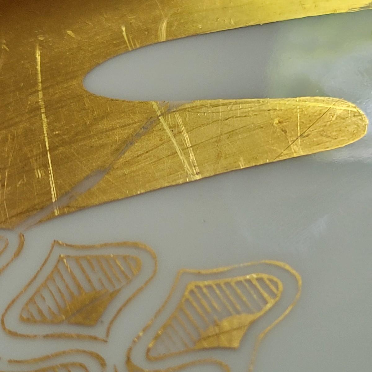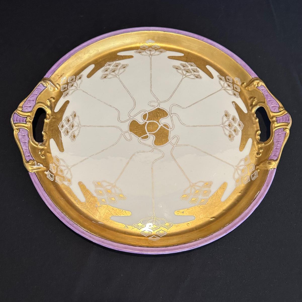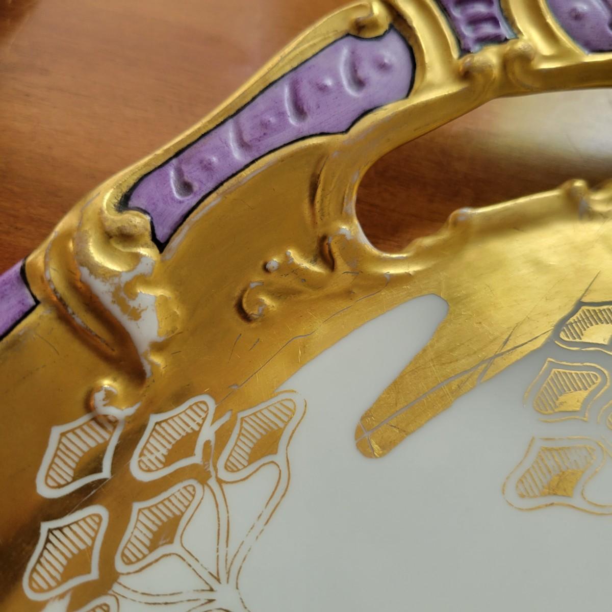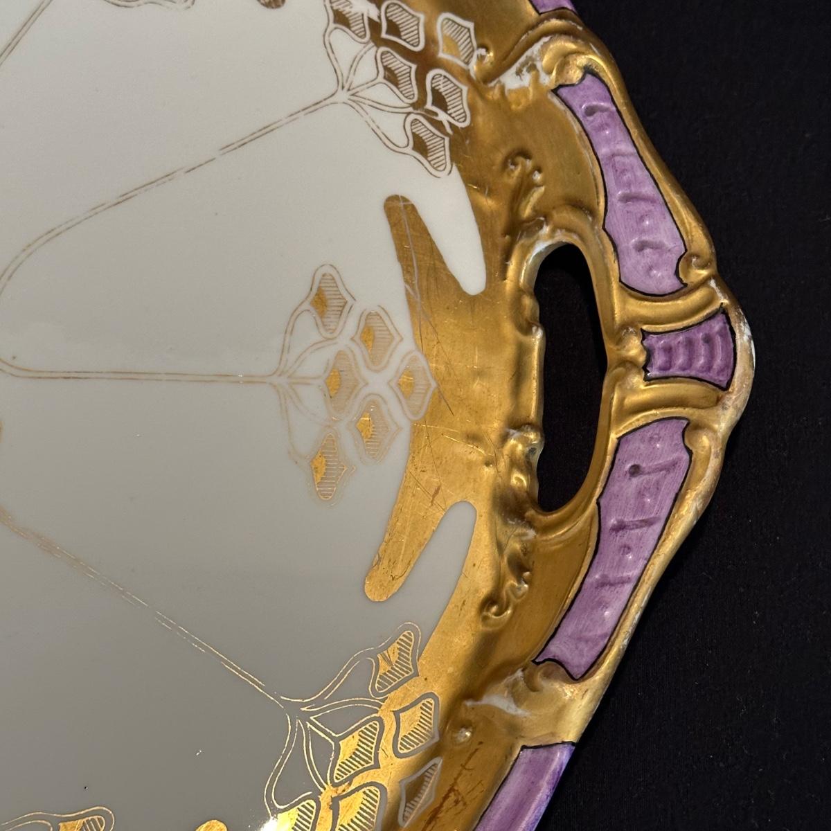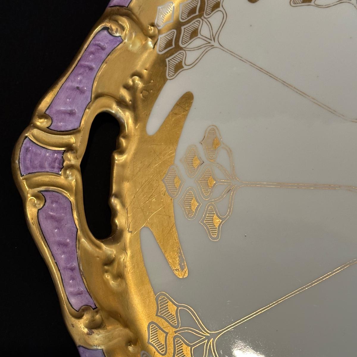 Limoges ceramic serving tray with gold, lavender and cream colored detail. Light scratches in gold colored leaf, see photos for additional information. Measures approximately 16.5"D. Shipping available
