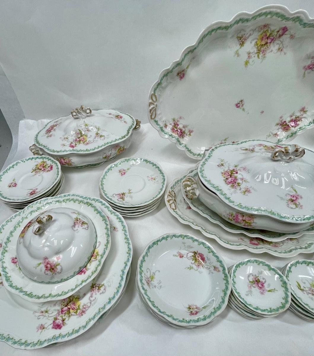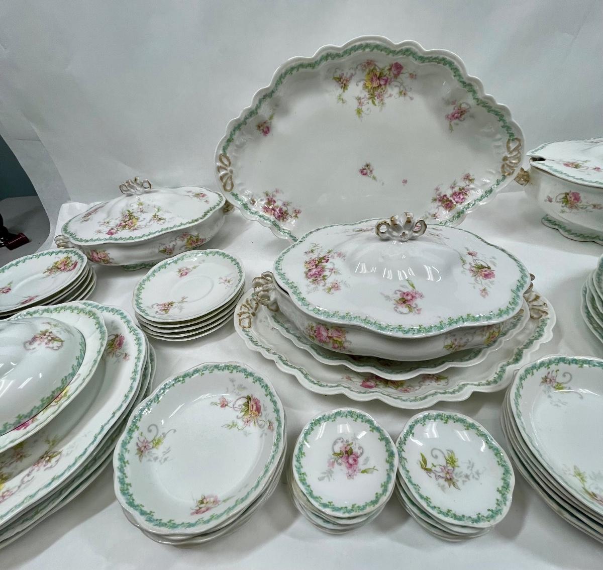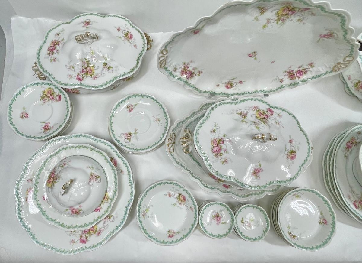 Pretty LIMOGES Rose Pattern on White with mint border print - large set, over 50 Pcs.