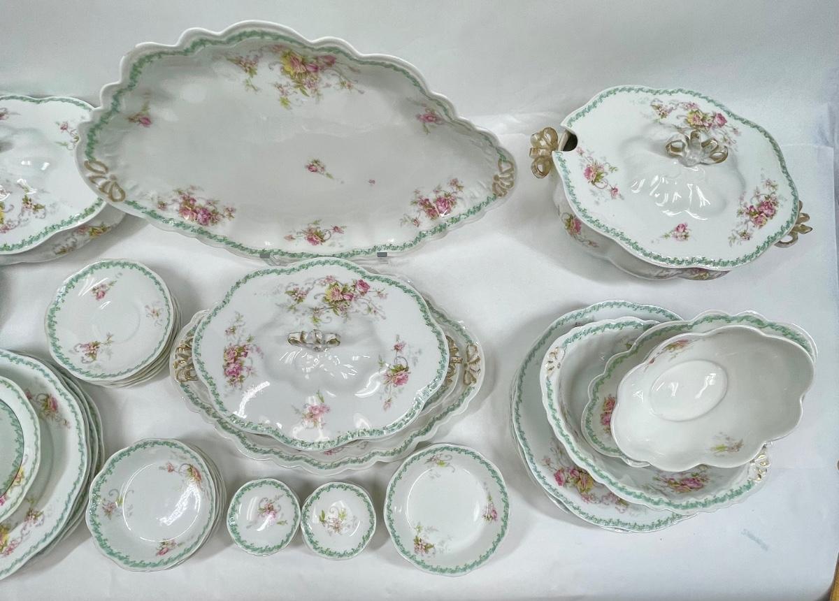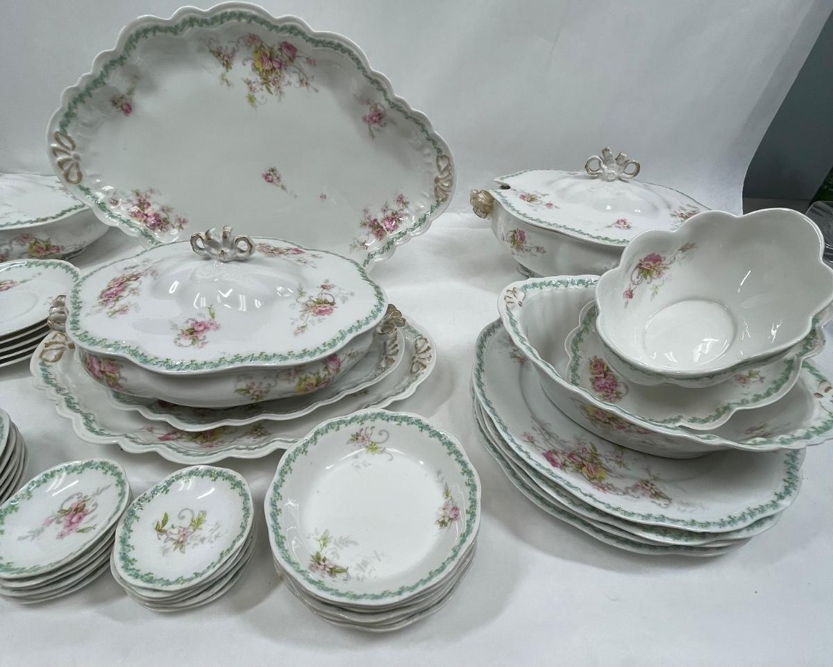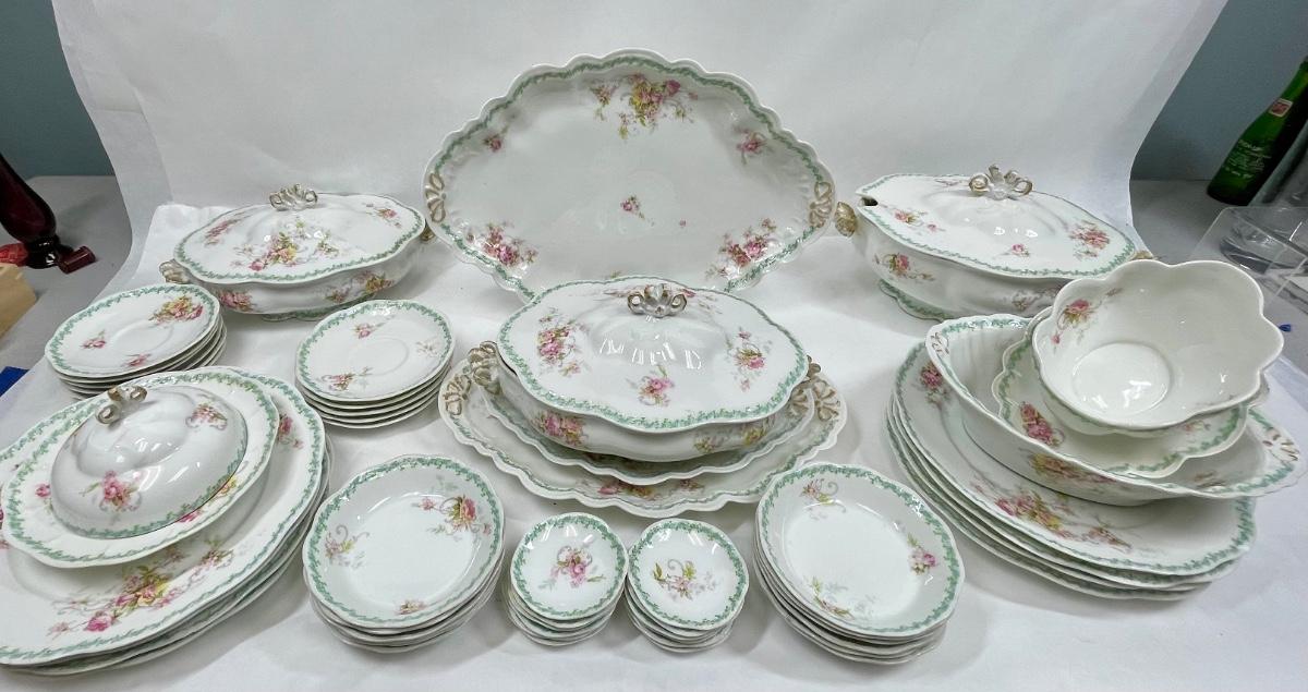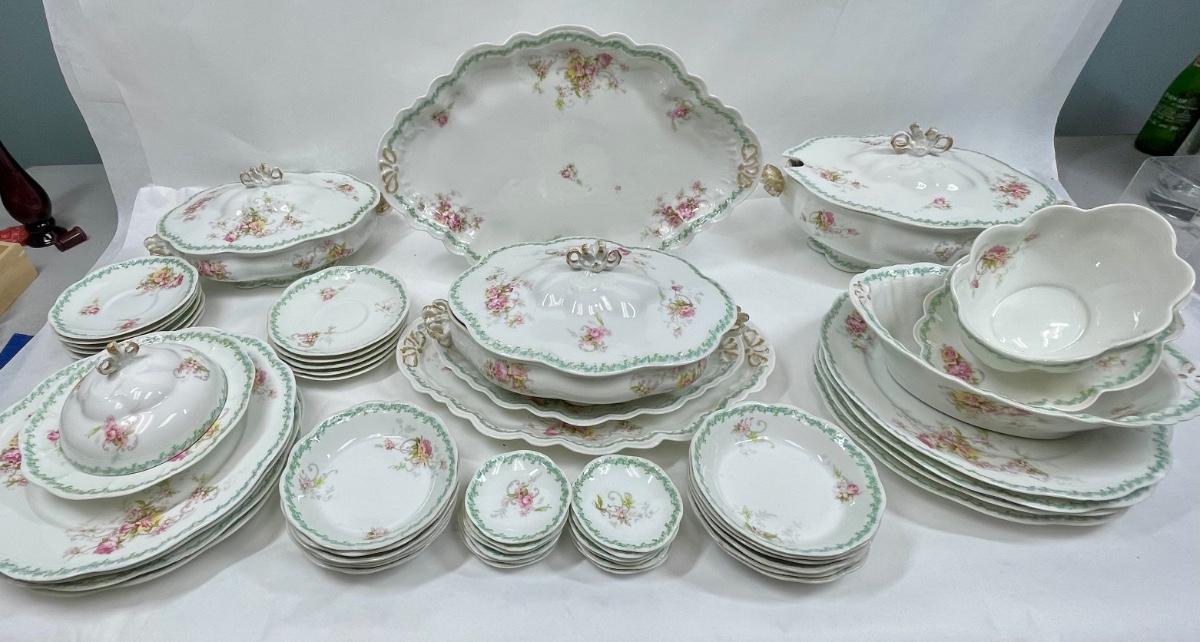 Pretty LIMOGES Rose Pattern on White with mint border print - large set, over 50 Pcs.