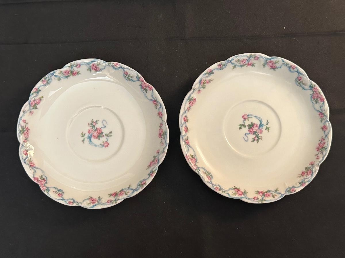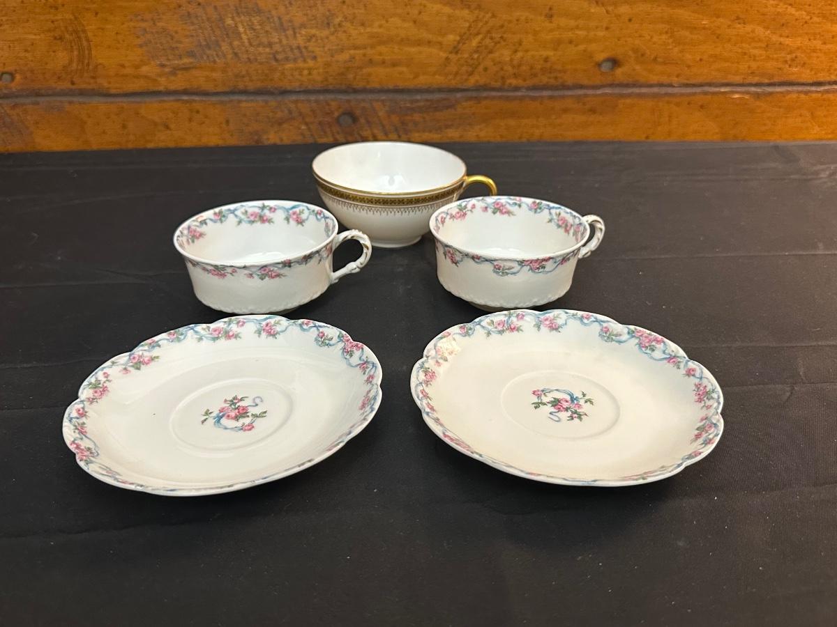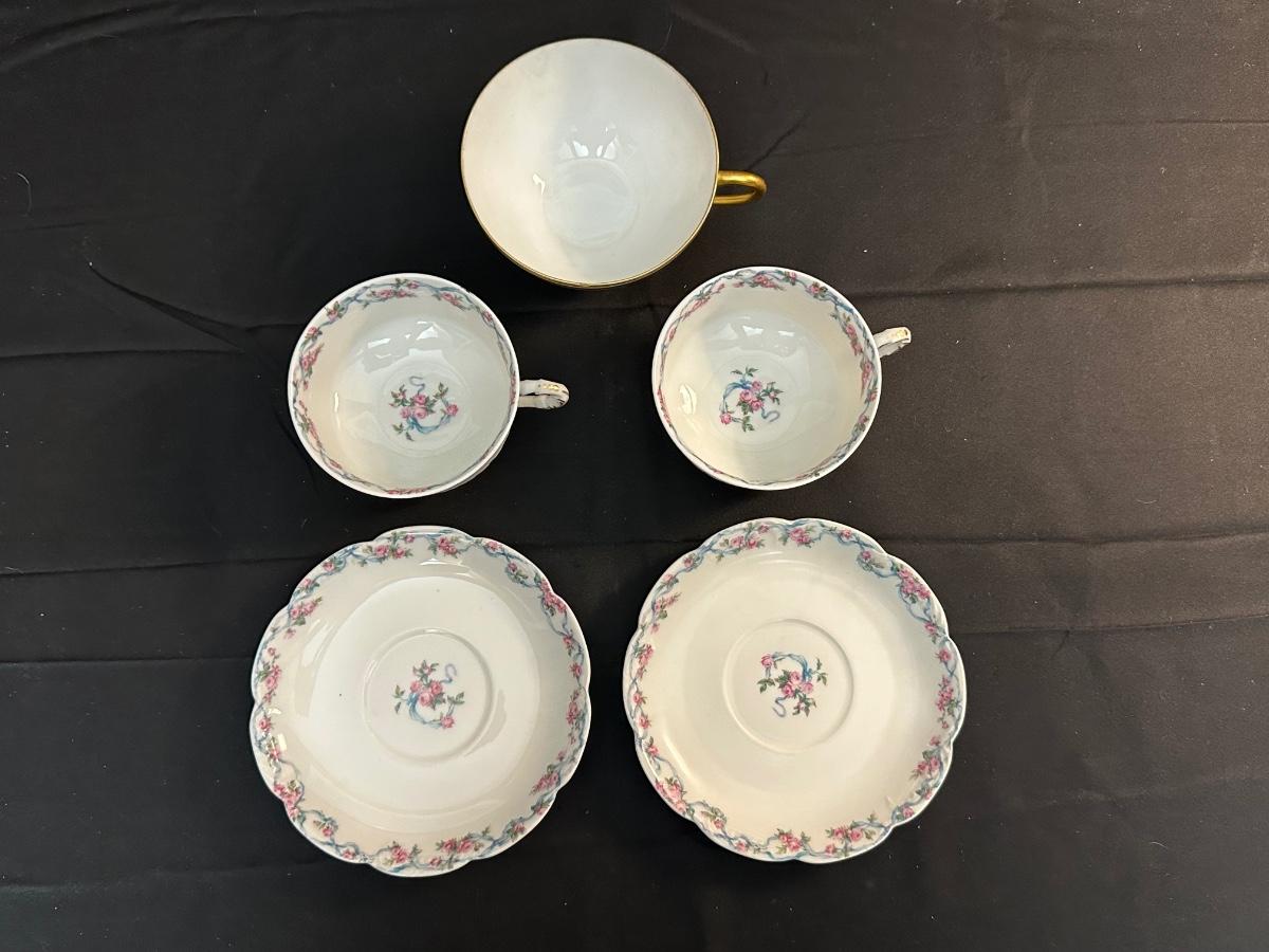 2 Tea cups & 2 plates match. The 3rd tea cup is Limoges as well. Please see photos for details.