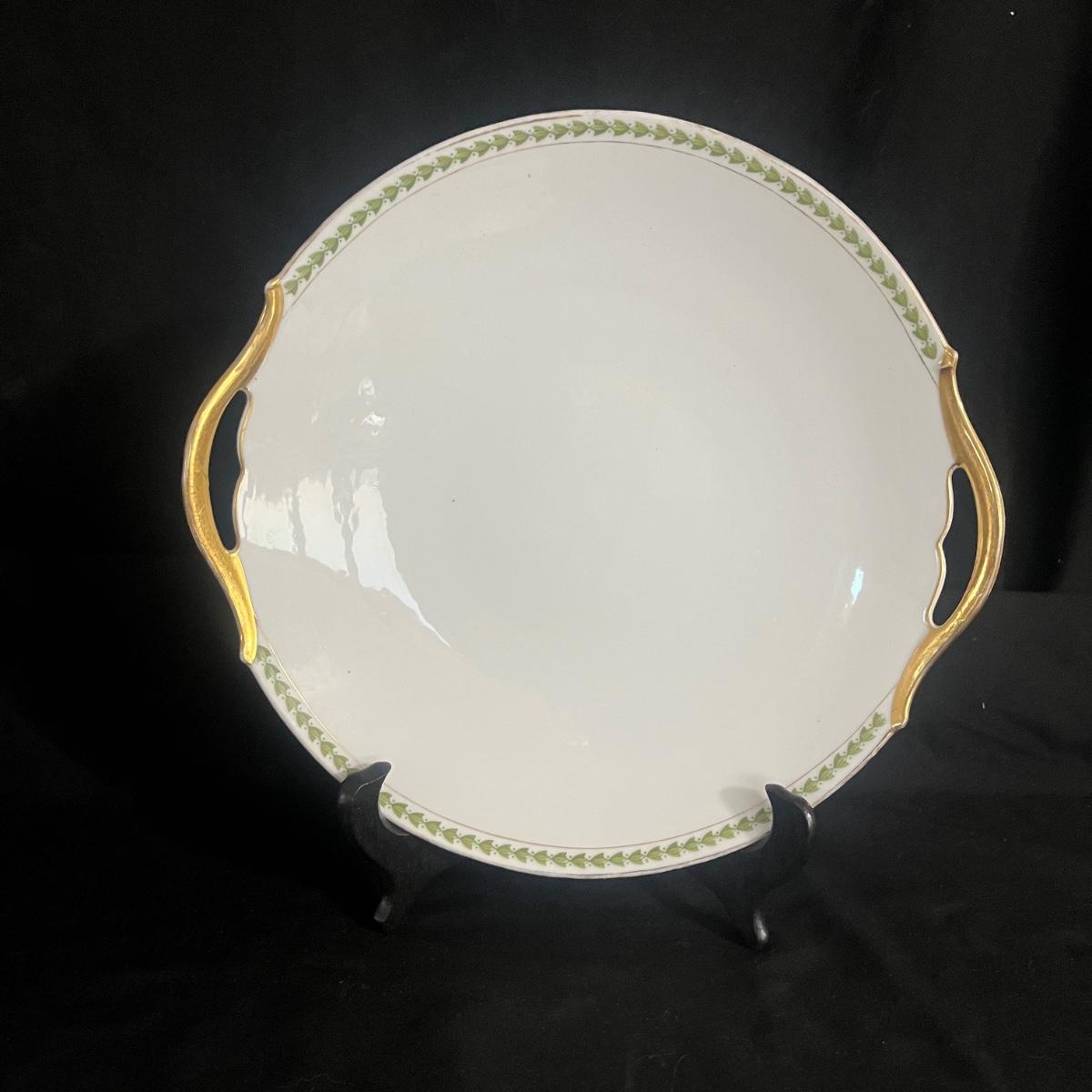 Lot includes a Limoges trio with matching plate, covered dish and a handled plate. Also includes two small serving forks stamped 800. Handled plate measures 10”D.