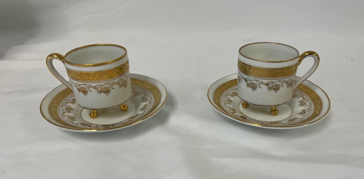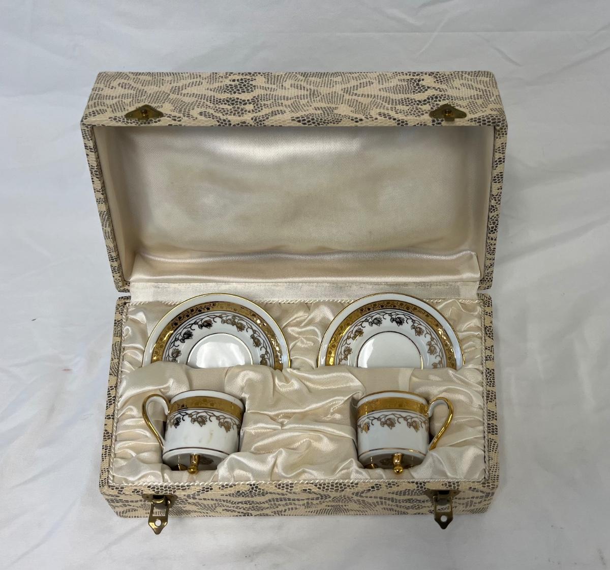 Includes two cups and two saucers. In original box. No obvious chips or cracks. Measurement of box: 12" x 7" x 4". [KA]