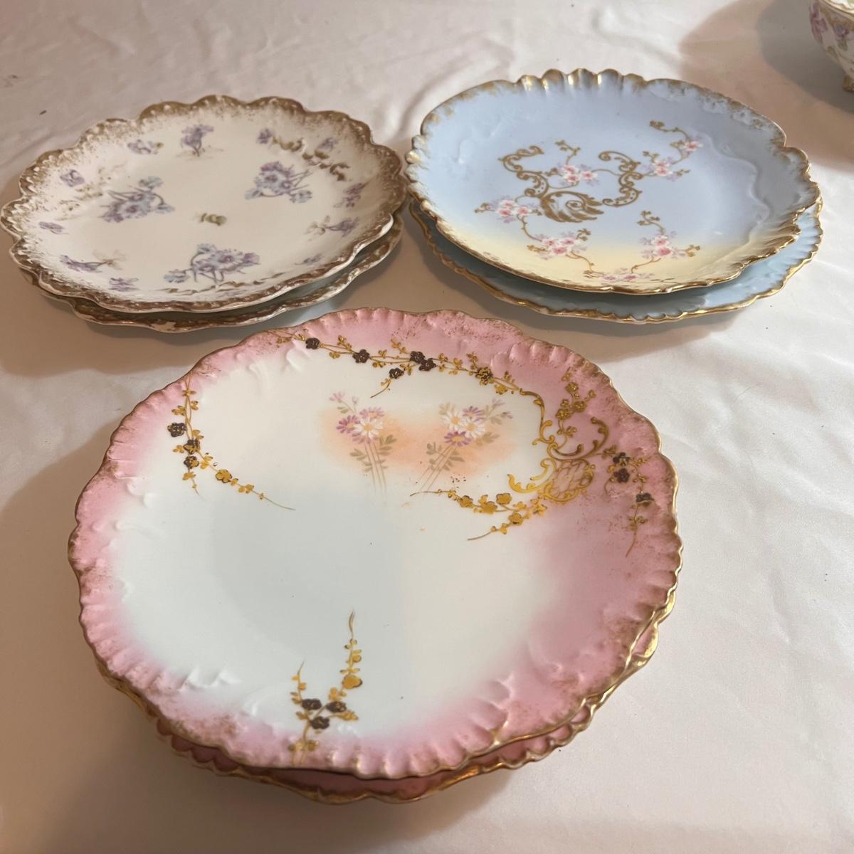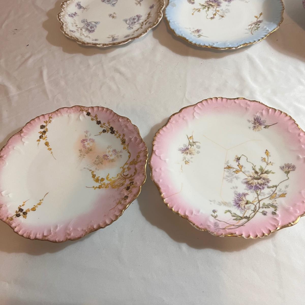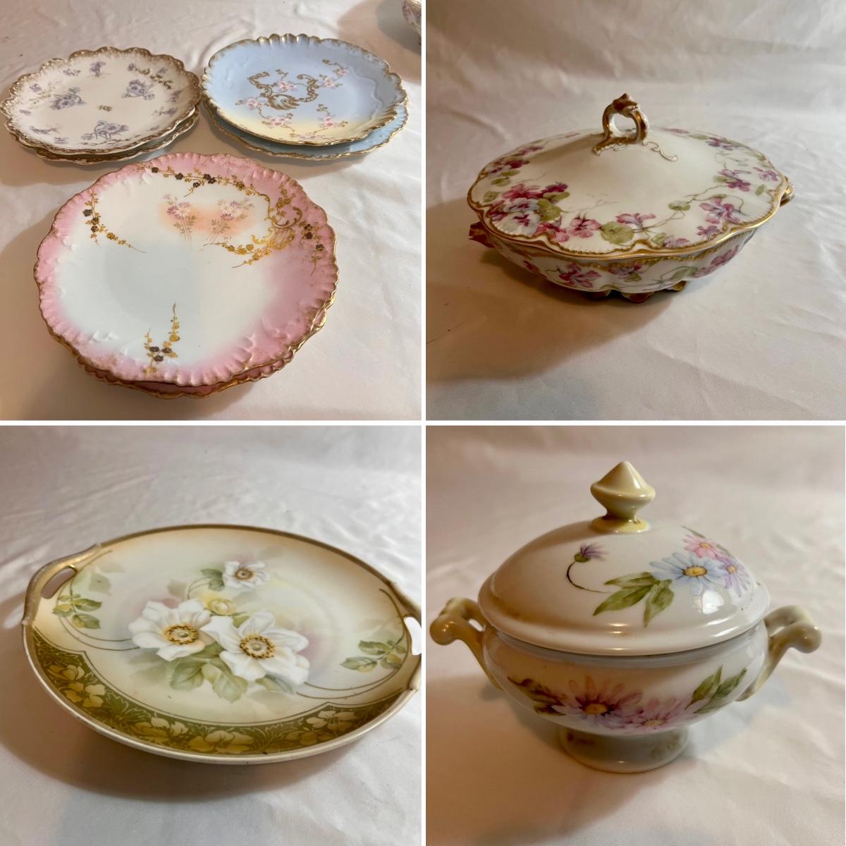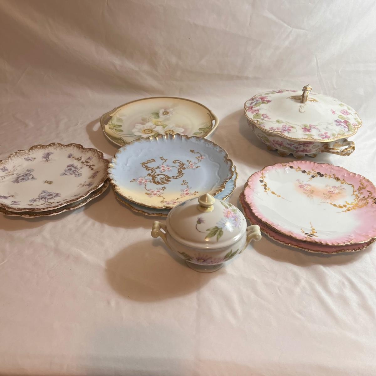 Lot includes six Limoges plates (two pink and two blue both marked Limoges and two white that are marked Depose), an RS white floral plate, Haviland lidded tureen and a small lidded potted with a signature that appears to read Ann Tukanouiez. A few pieces have damage - the tureen has a broken handle which could be glued back on, one pink plate has cracks, one white plate has a chip in the rim, see photos.