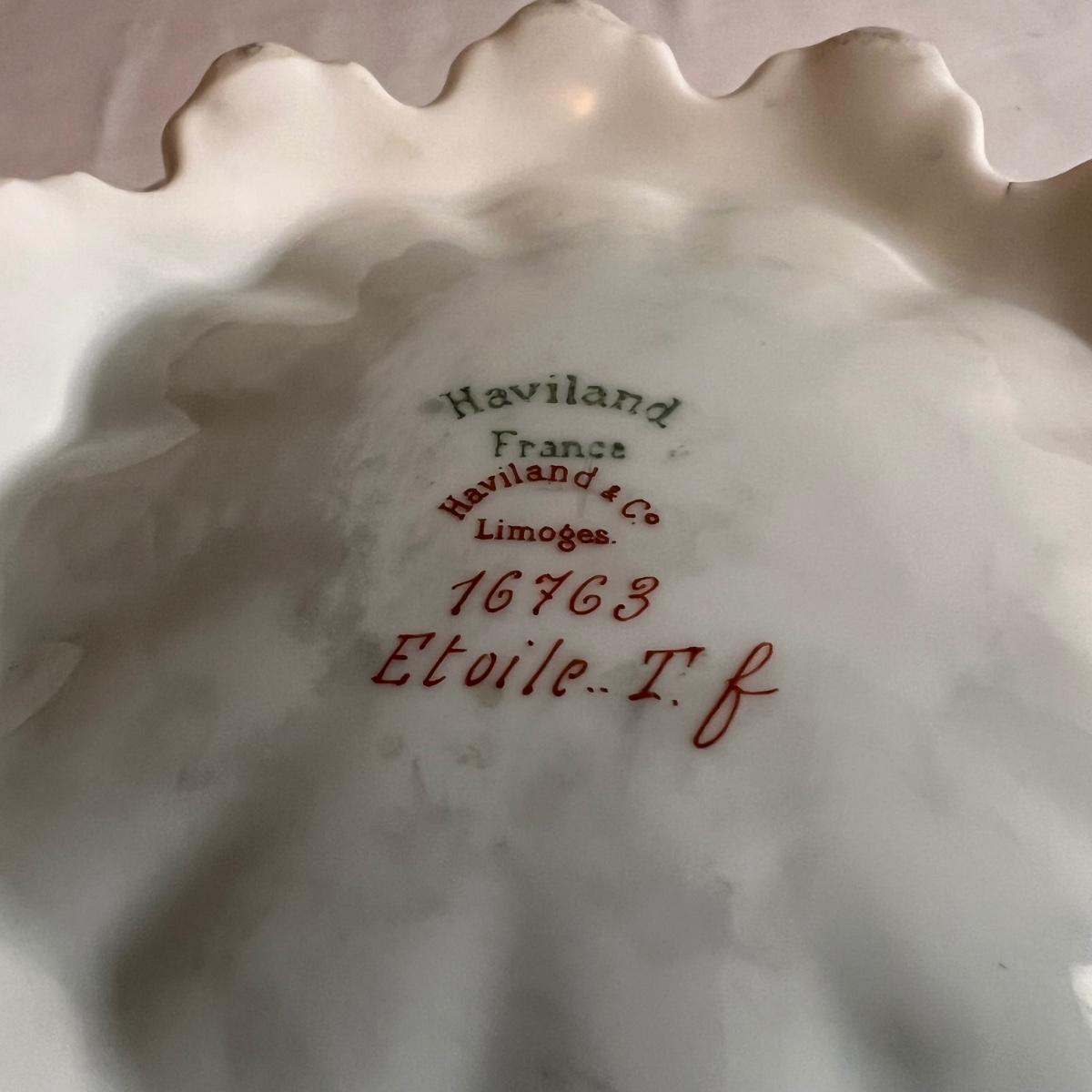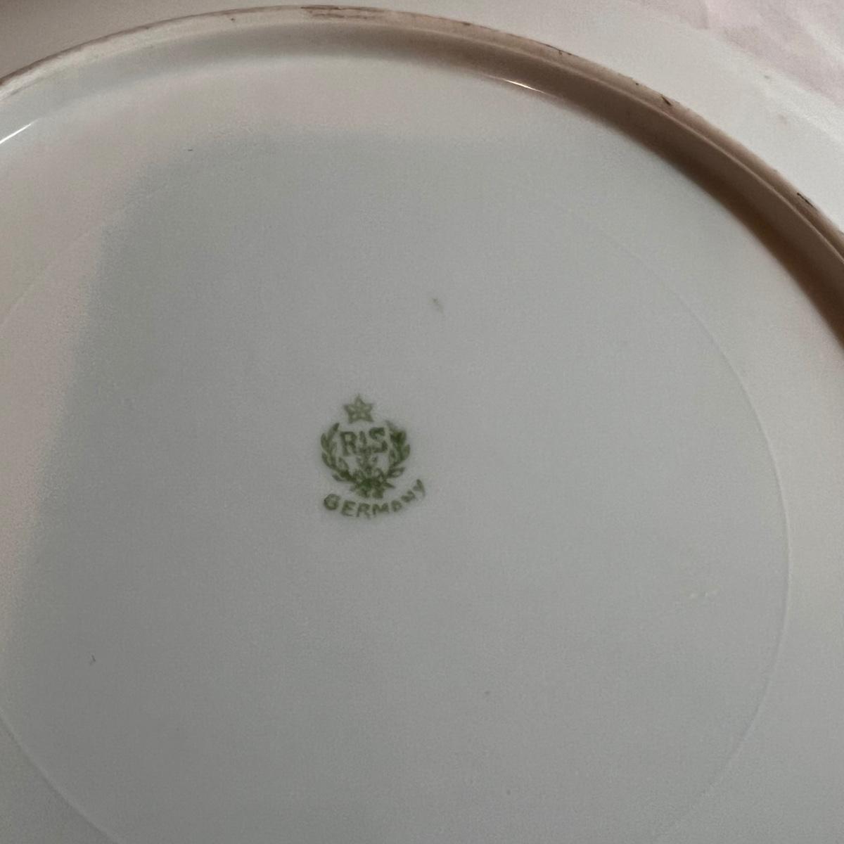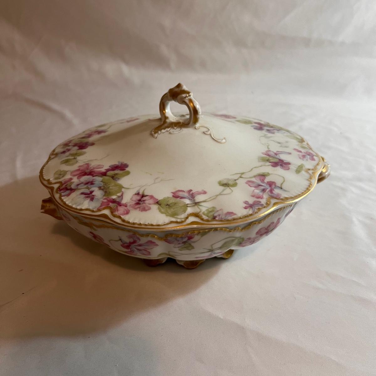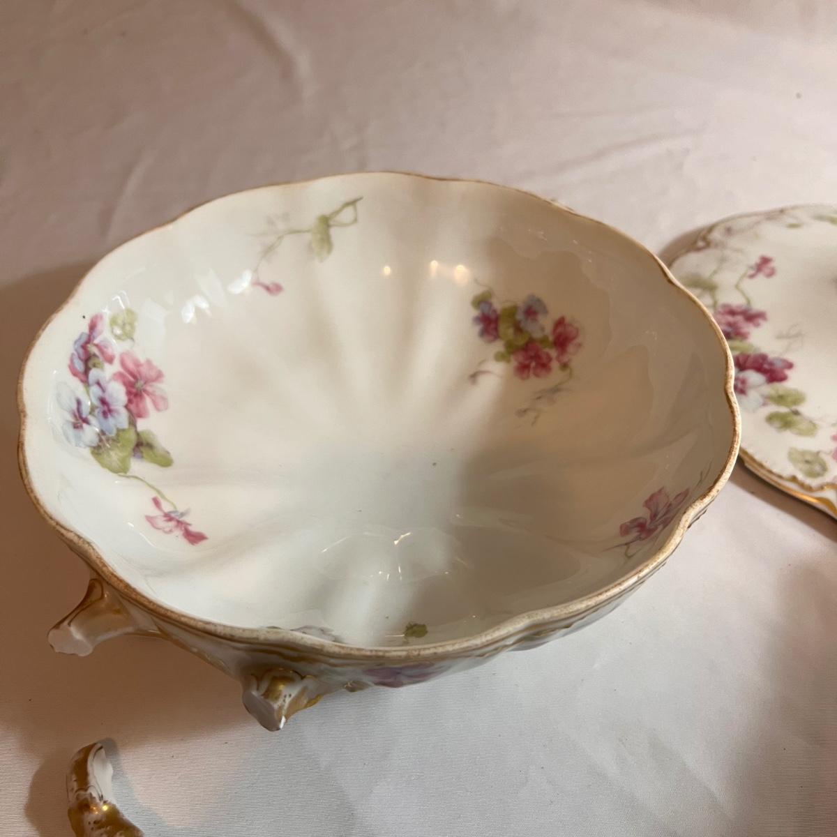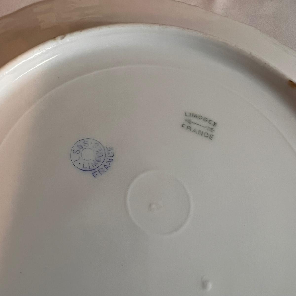 Lot includes six Limoges plates (two pink and two blue both marked Limoges and two white that are marked Depose), an RS white floral plate, Haviland lidded tureen and a small lidded potted with a signature that appears to read Ann Tukanouiez. A few pieces have damage - the tureen has a broken handle which could be glued back on, one pink plate has cracks, one white plate has a chip in the rim, see photos.