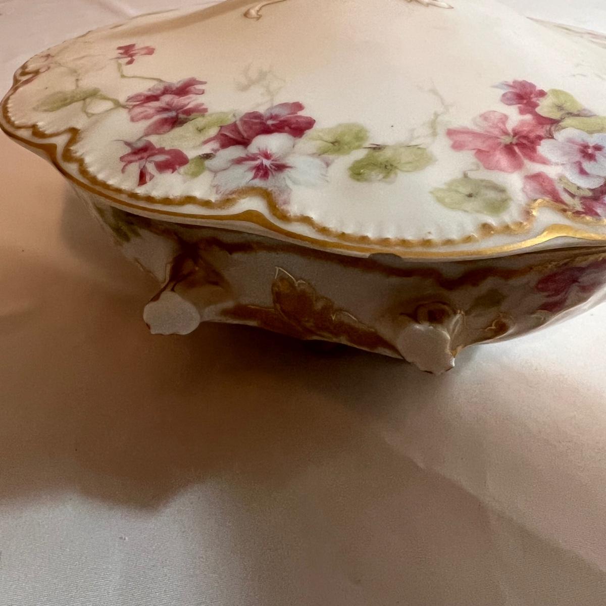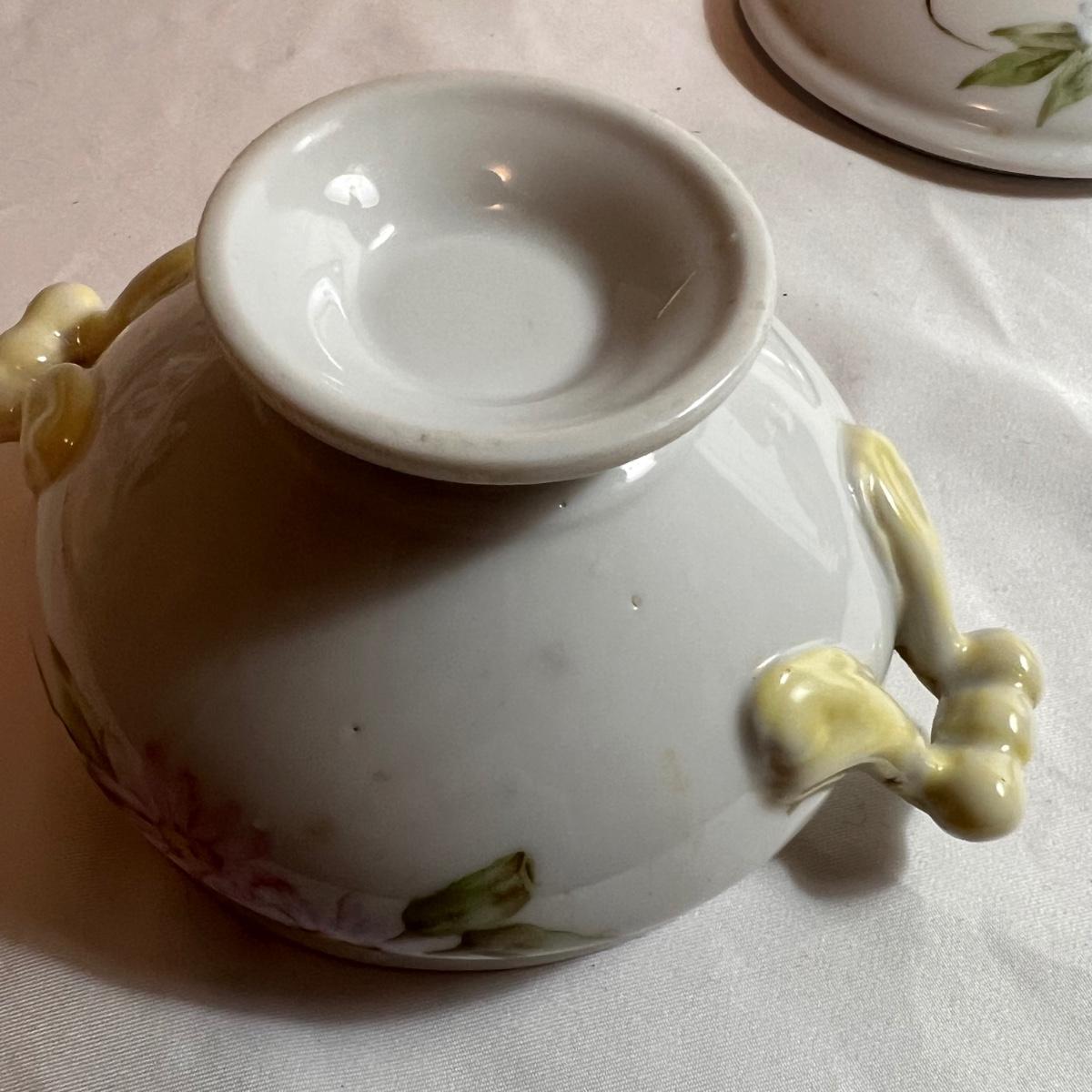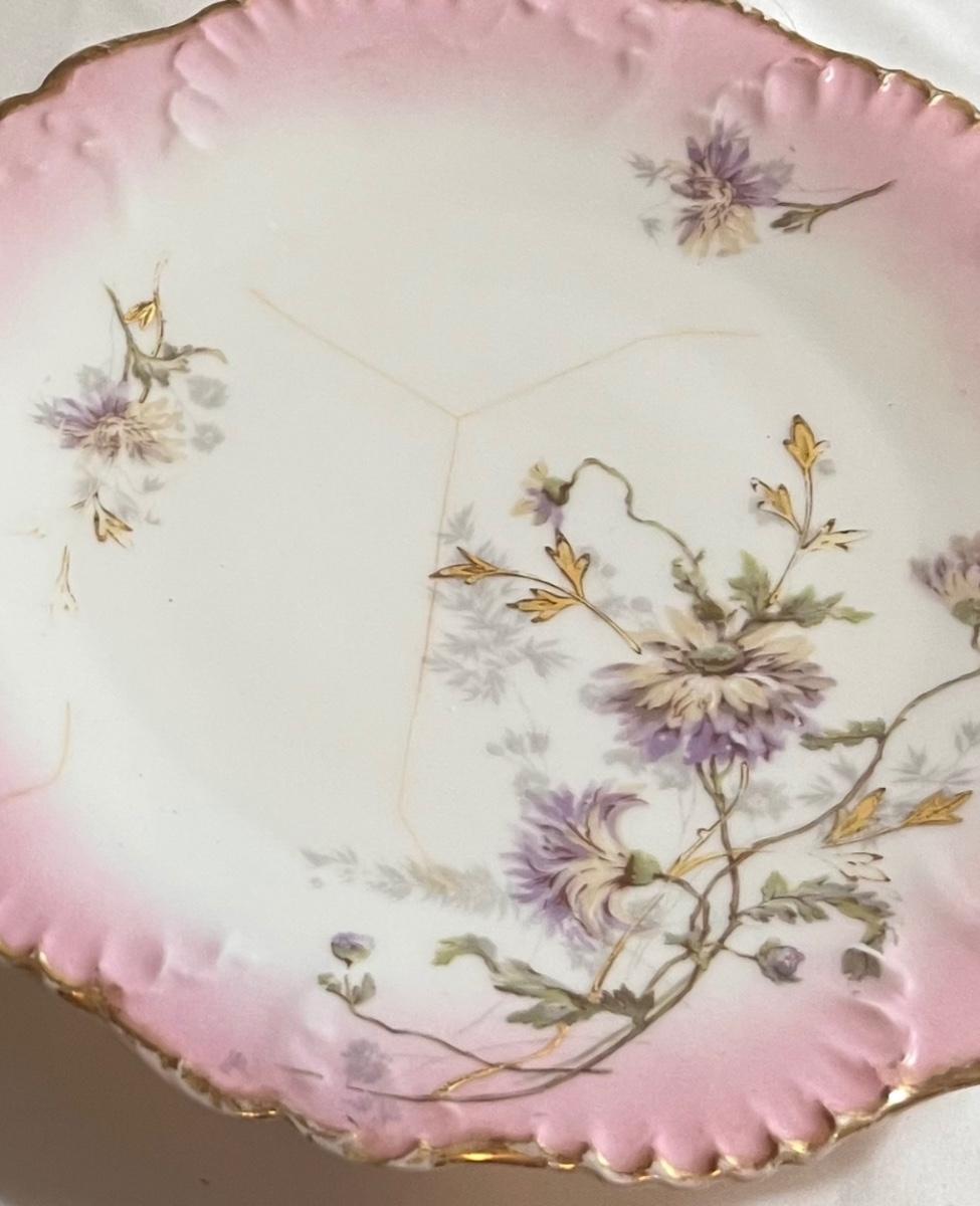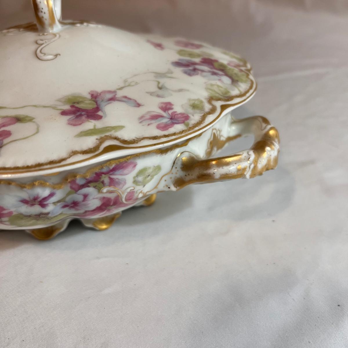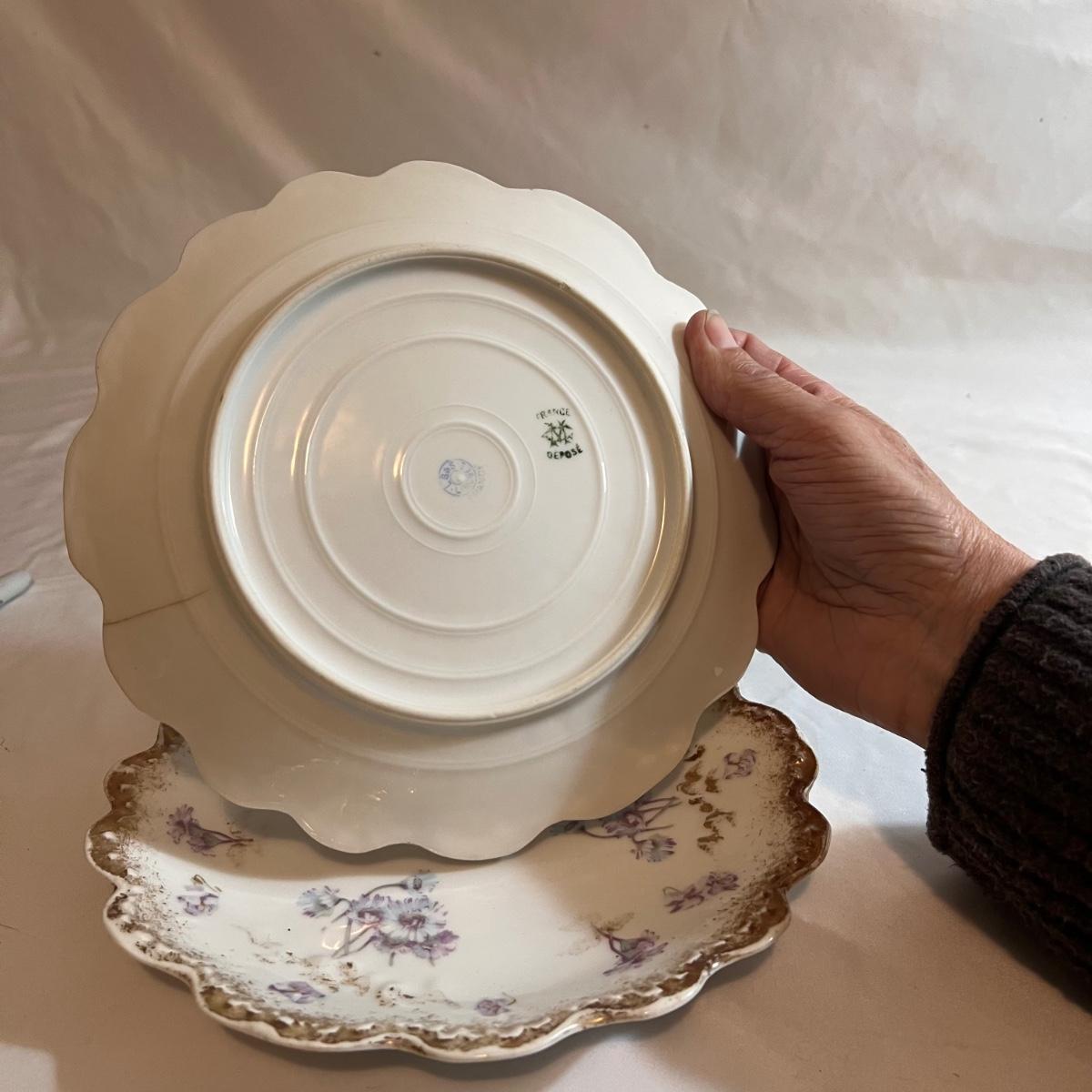 Lot includes six Limoges plates (two pink and two blue both marked Limoges and two white that are marked Depose), an RS white floral plate, Haviland lidded tureen and a small lidded potted with a signature that appears to read Ann Tukanouiez. A few pieces have damage - the tureen has a broken handle which could be glued back on, one pink plate has cracks, one white plate has a chip in the rim, see photos.