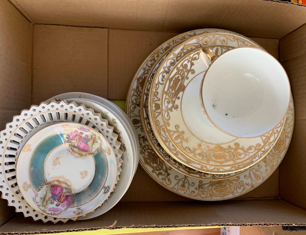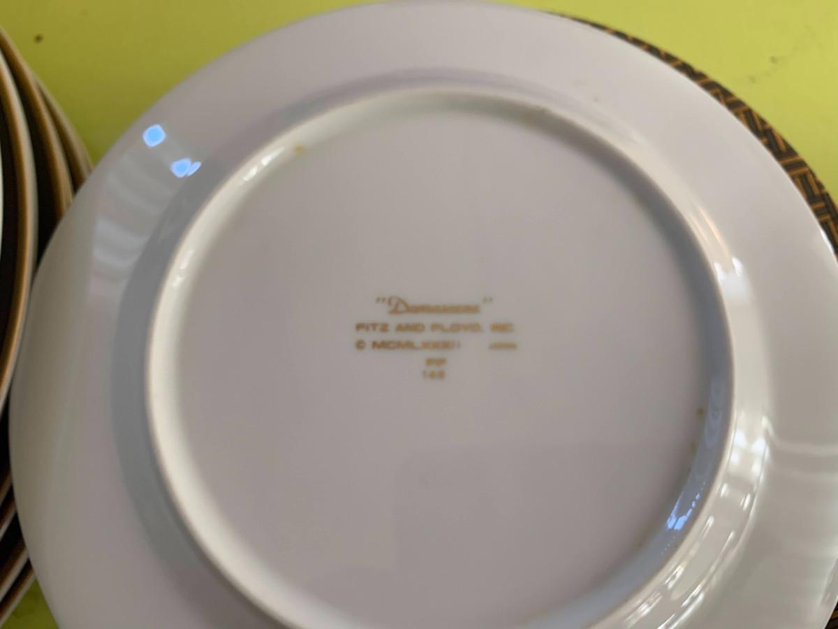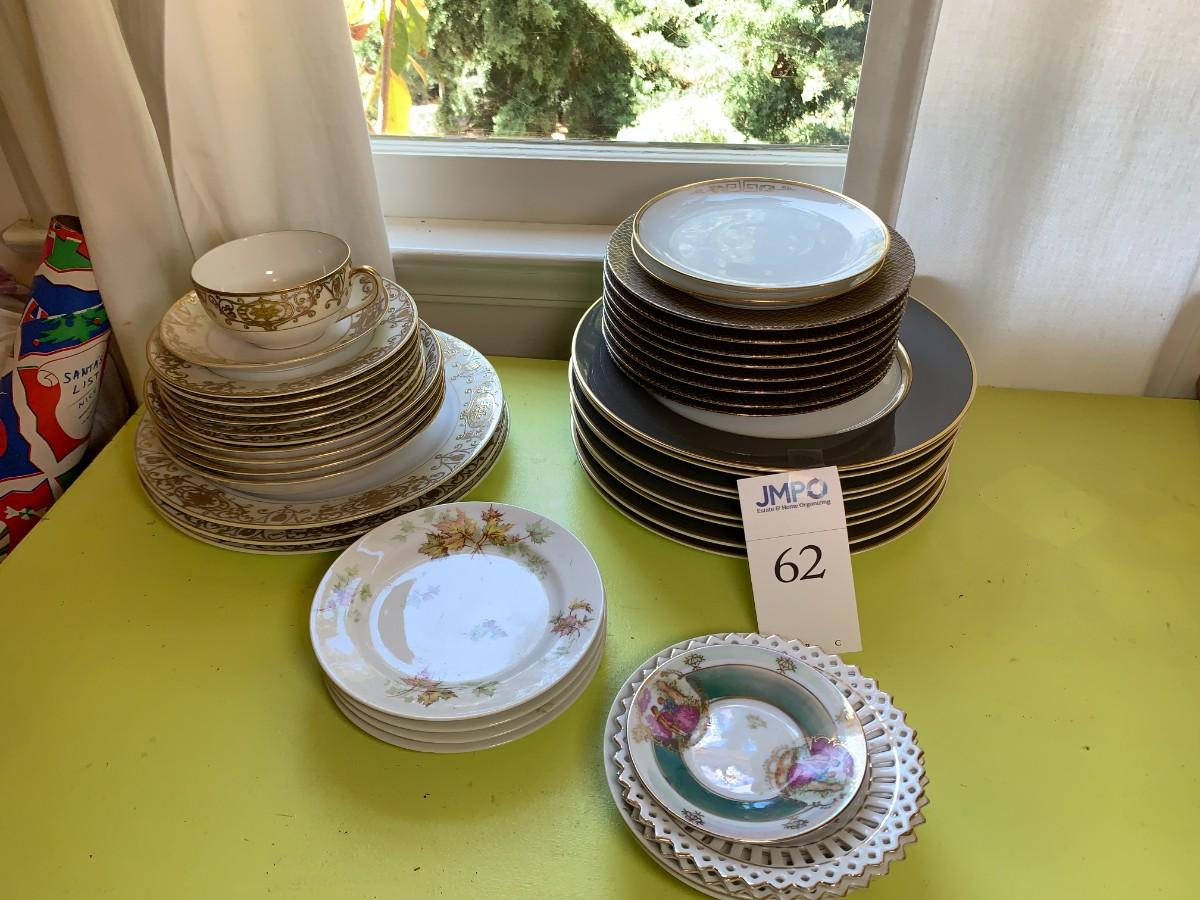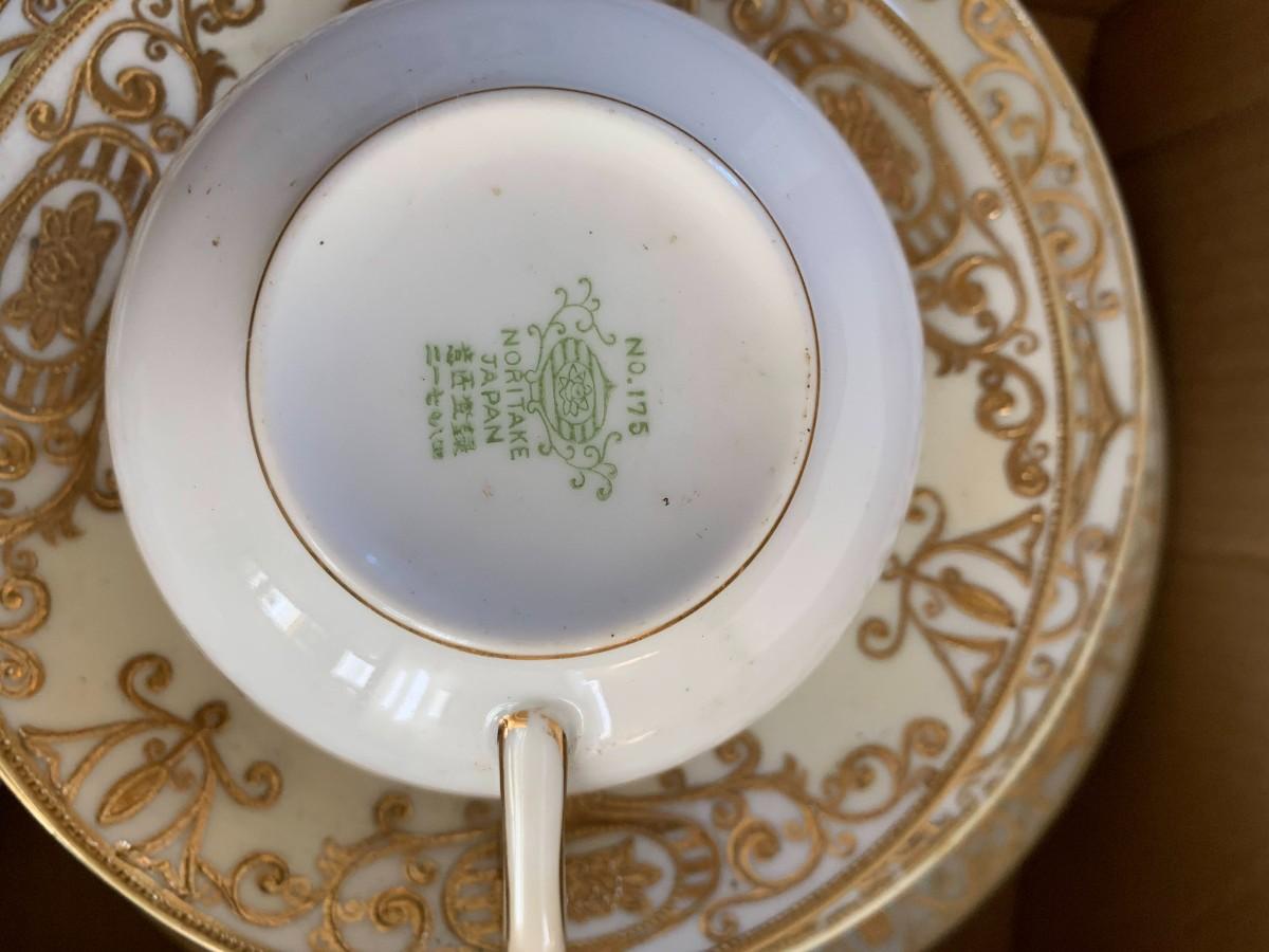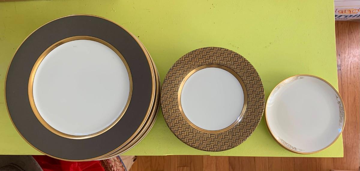 Includes Limoges 2 bowls and 4 plates, leaf pattern. Noritake No.175 set Gold design: 1 tea cup and saucer, six small plates, four bowls, three dinner plates. Fitz and Floyd 8 salad plates, and 8 dinner plates