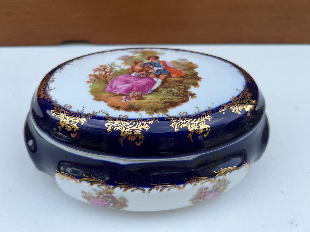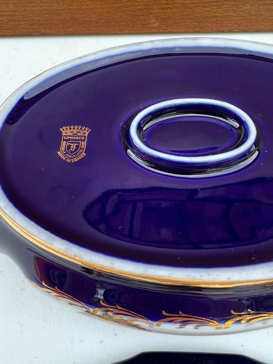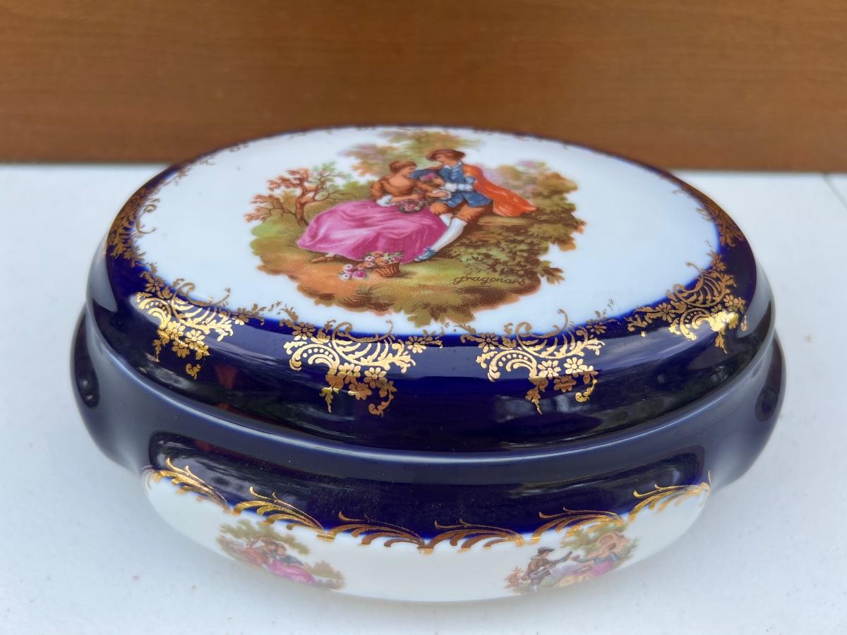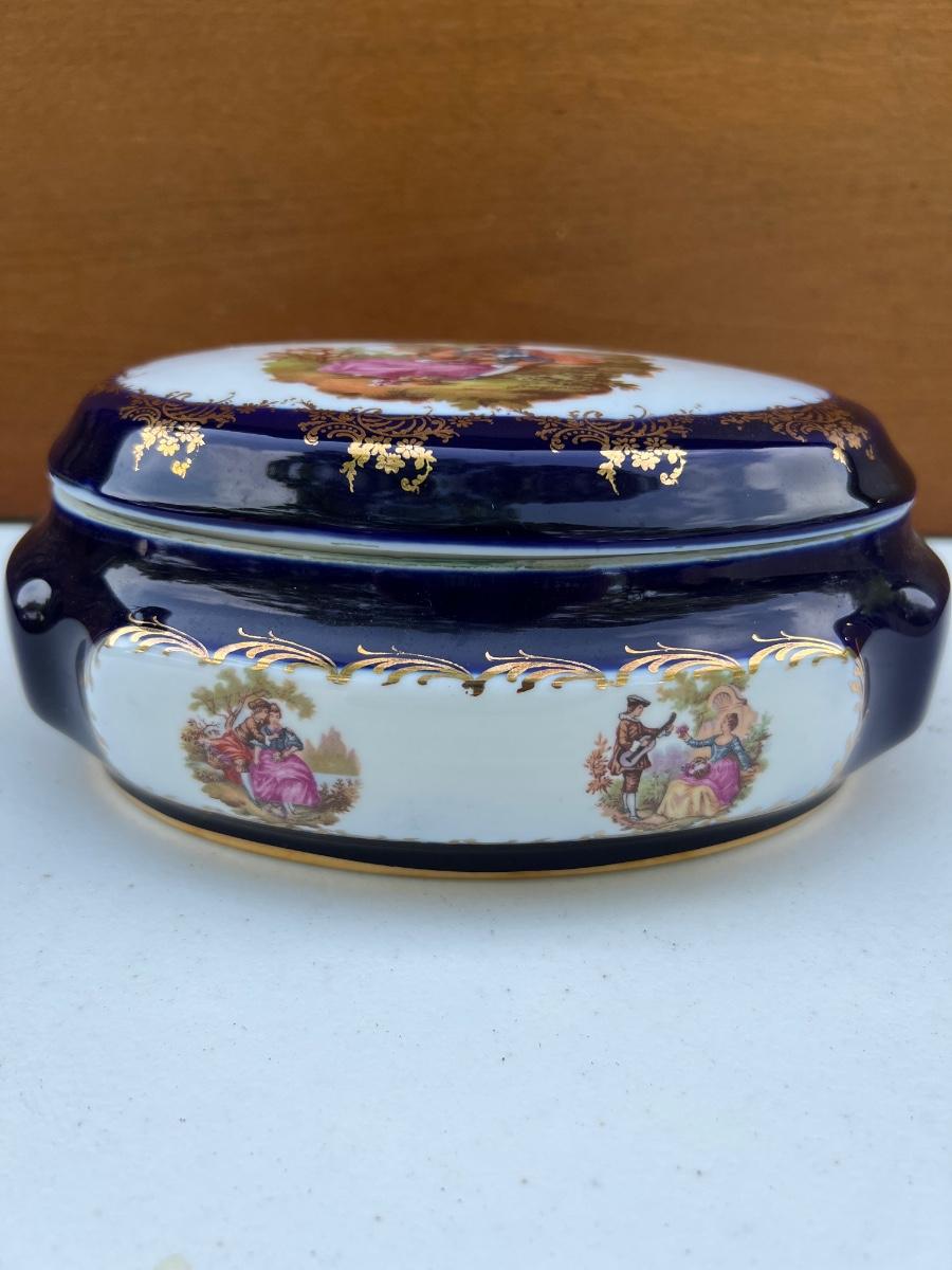 Limoges France Cobalt Royal Blue with Gold Trim oval porcelain trinket box. measures 8 inches long and 3 1/2 inches tall.