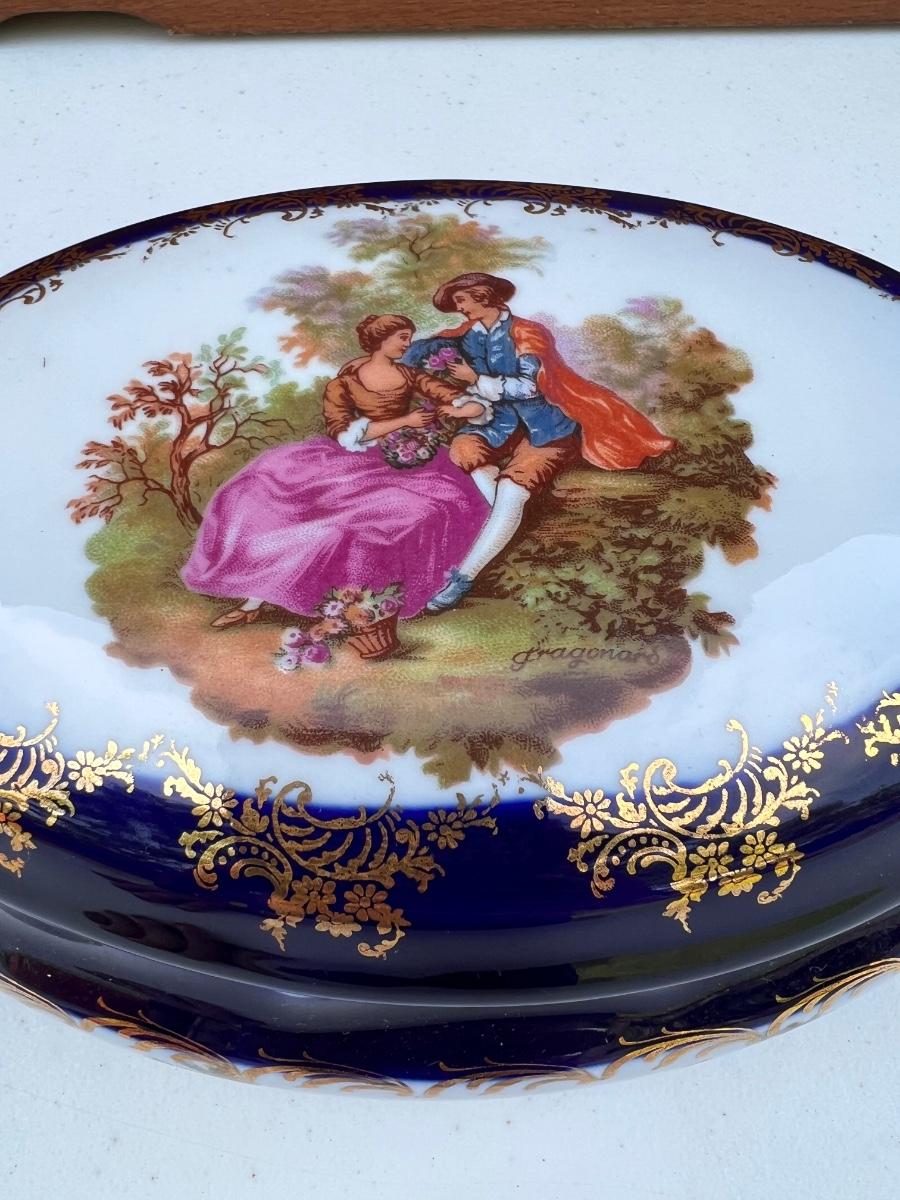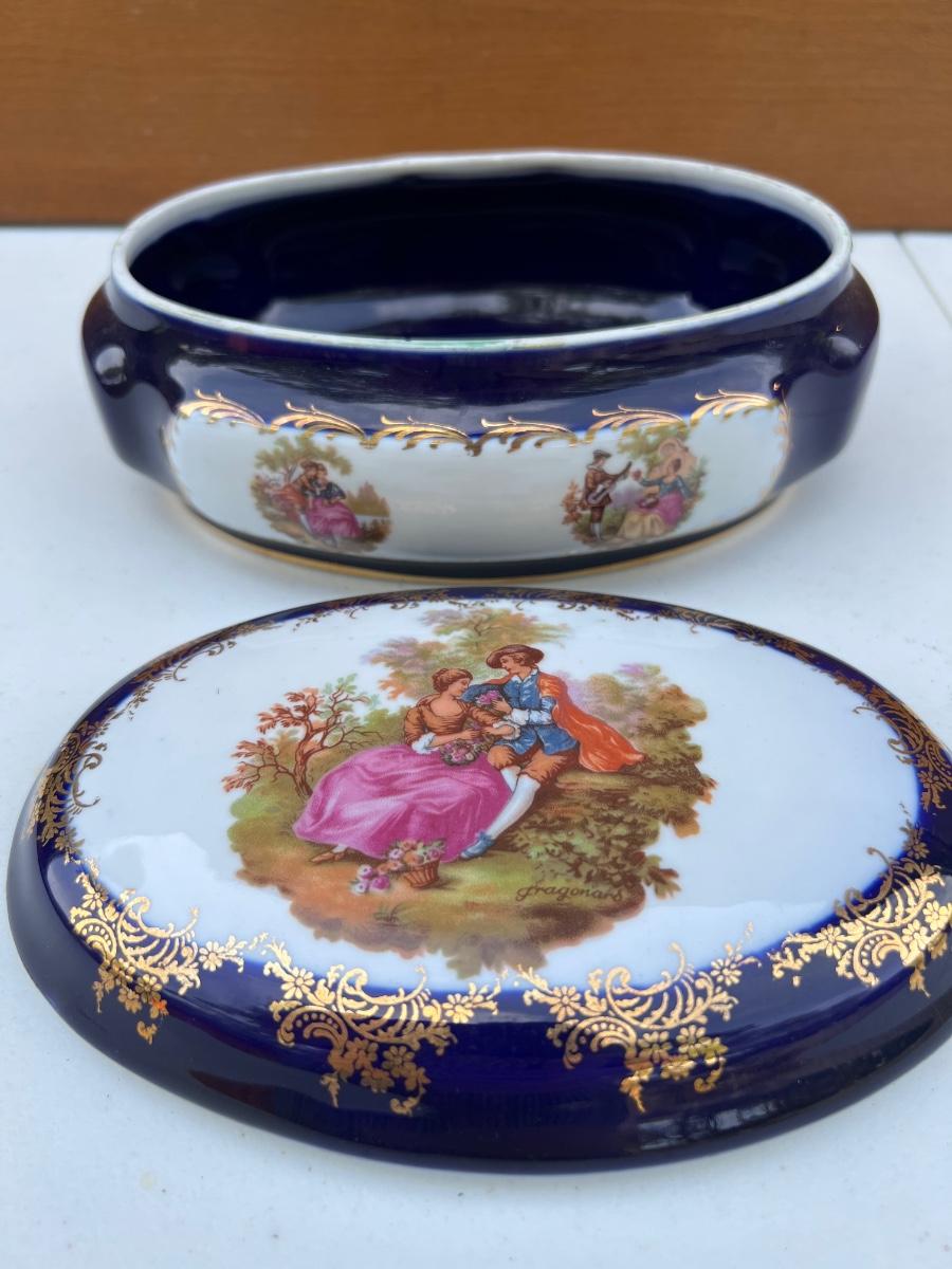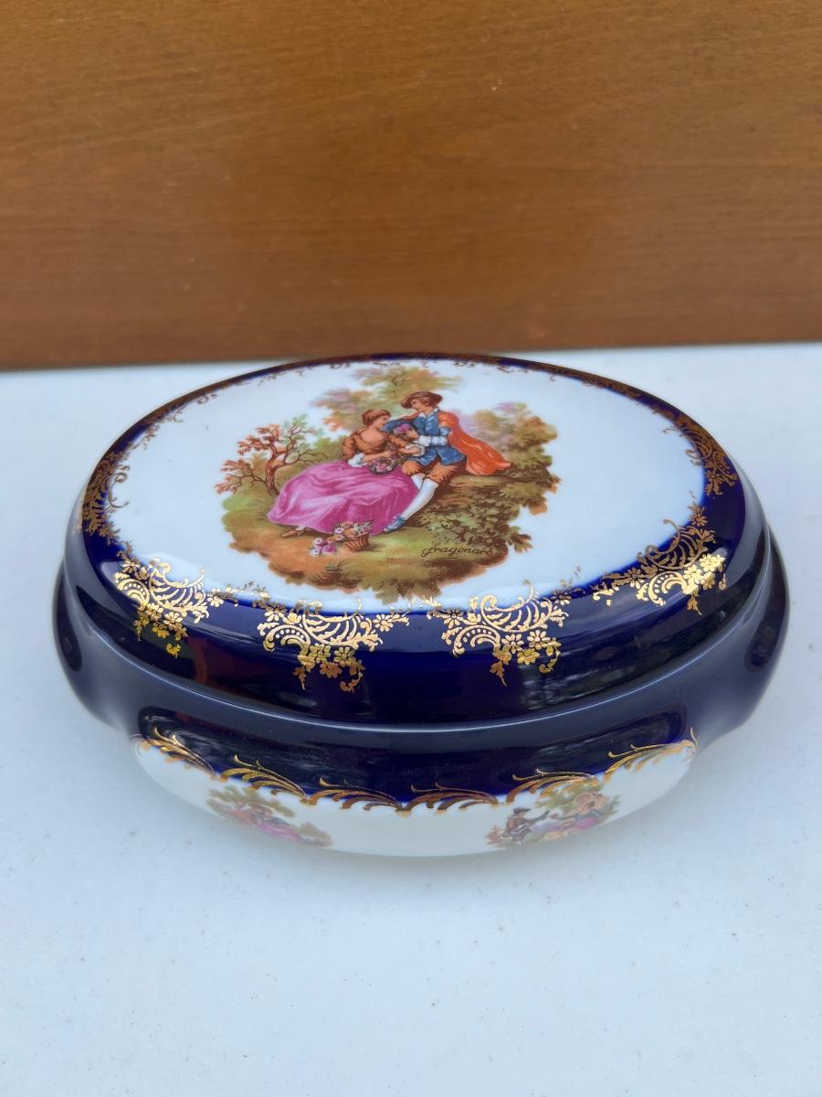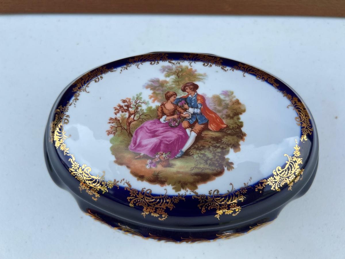 Limoges France Cobalt Royal Blue with Gold Trim oval porcelain trinket box. measures 8 inches long and 3 1/2 inches tall.