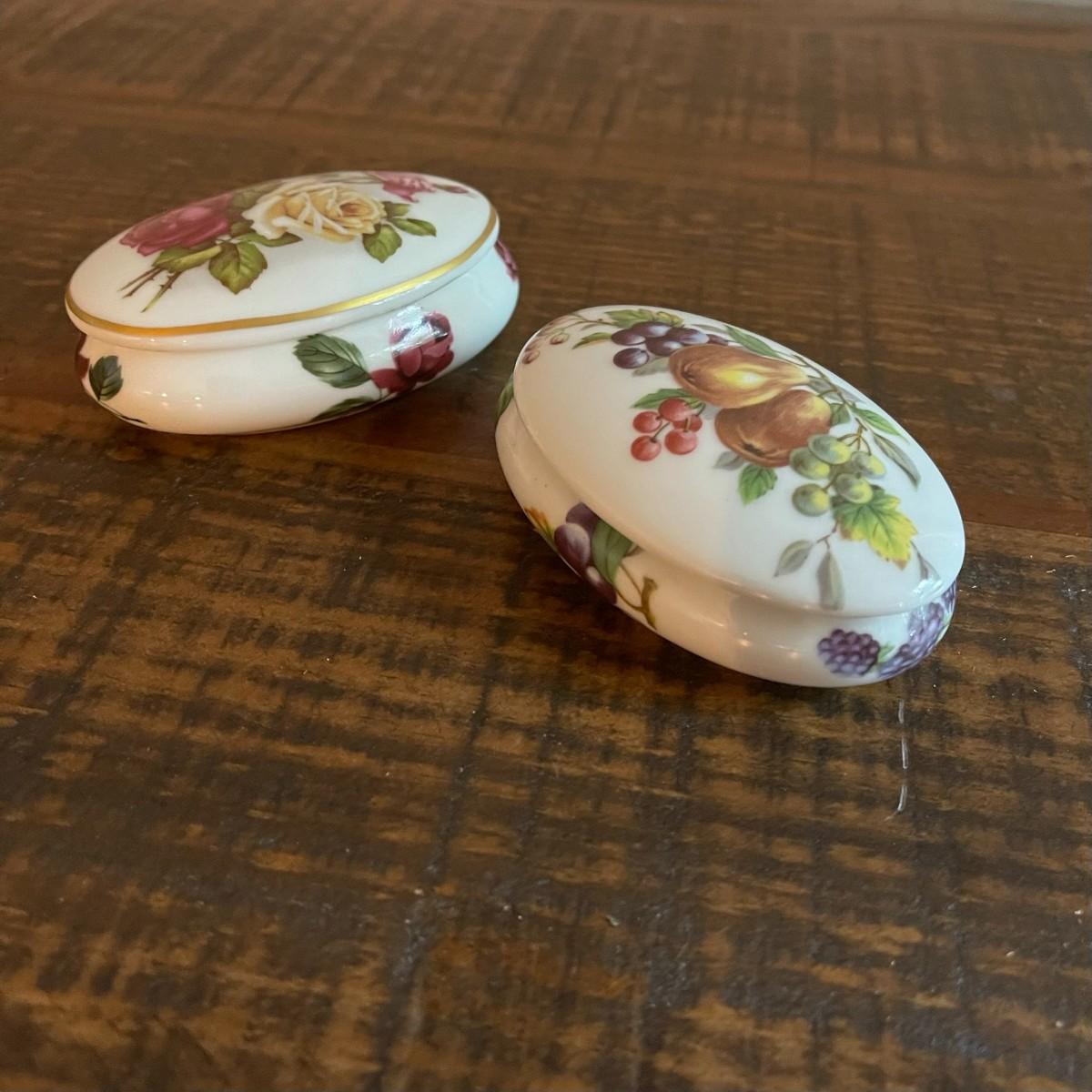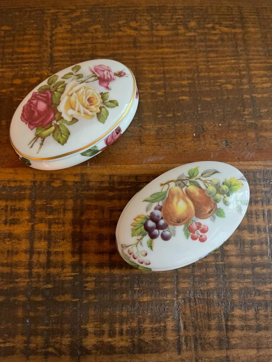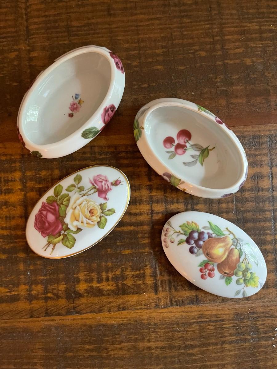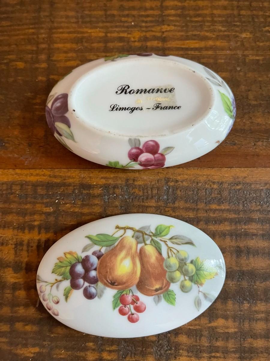 Limoges France, Romance, Porcelain Oval Trinket Boxes, 2, Roses & Fruit. Selling as a pair. The roses pattern has a lid with gold trim and delicate mini rose pattern inside box. The outer part of box has pink roses around the box. The fruit pattern highlights pears and grapes on the lid. The inside of box has cherry pattern. The outer part of box has several fruits around the box.