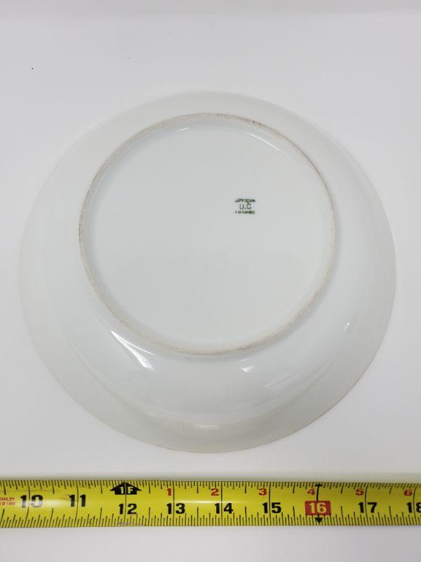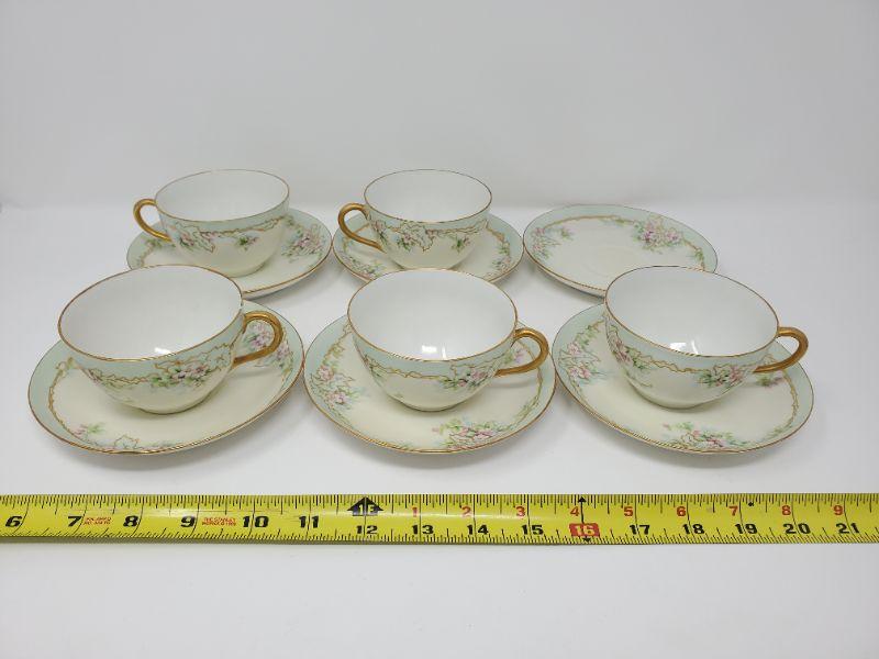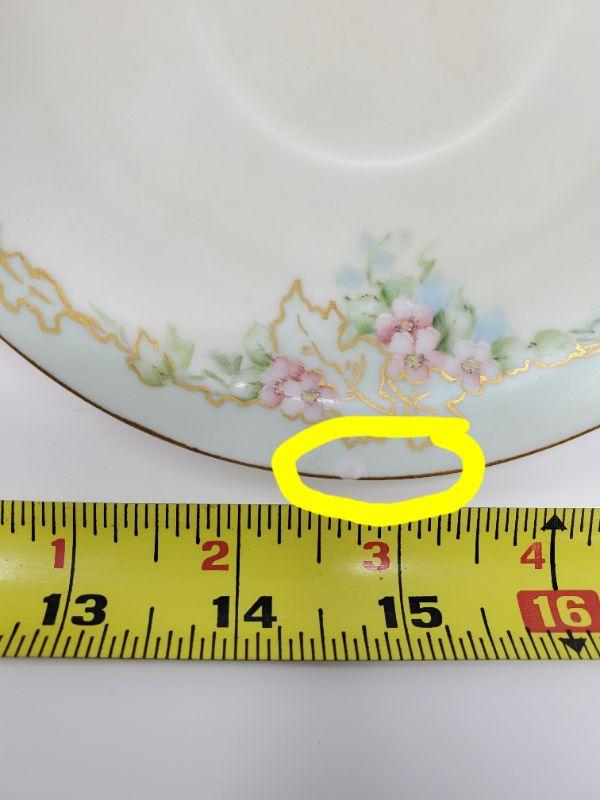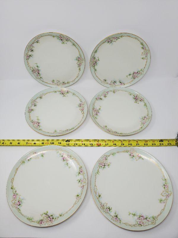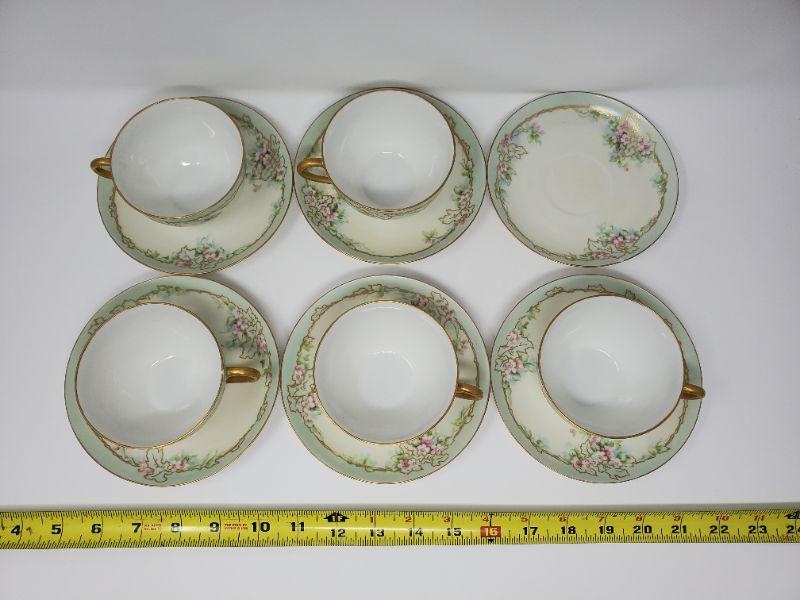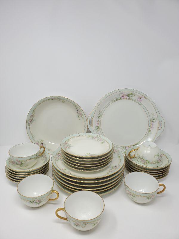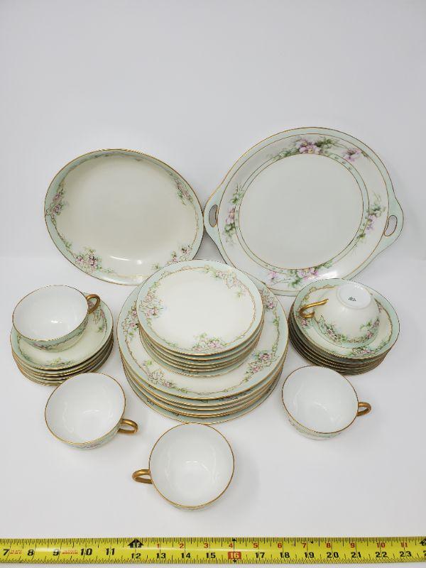 6 dinner plates, 6 smaller plates, 6 small bowls 6 tea cup saucers (*one has a chip), 5 tea cups (one has a chip), 1 serving bowl and 1 serving plate. While there are a few flaws, this set is gorgeous! See photos...
