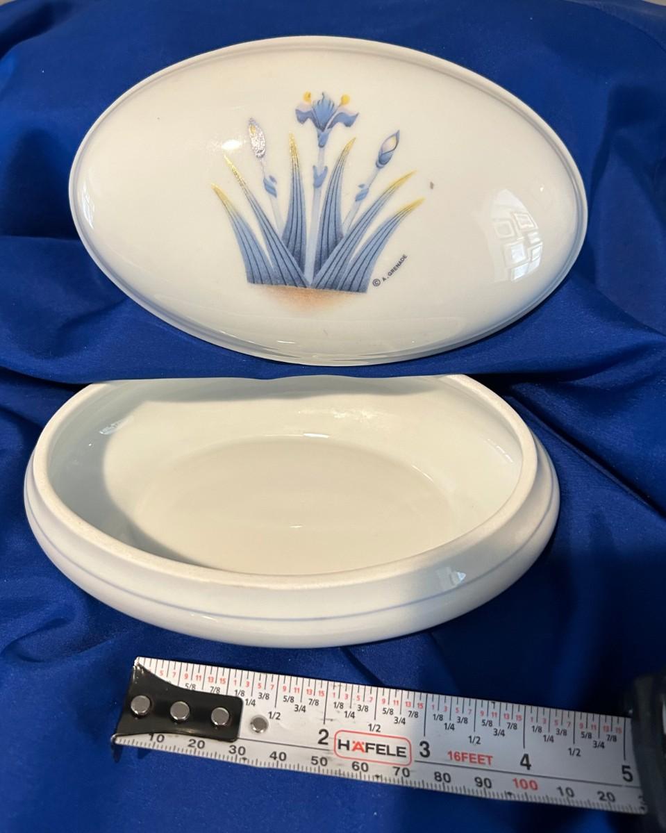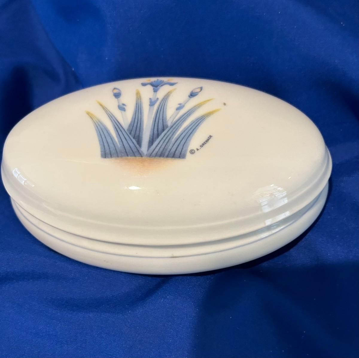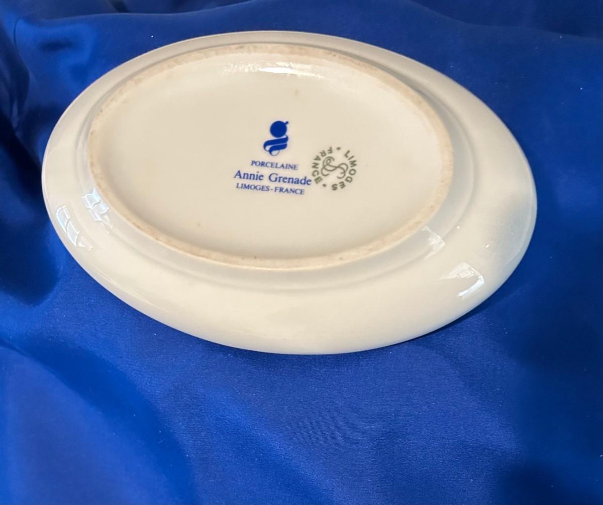 Limoges porecelain 2-piece jewelry box, labeled Annie Grenadi, Limoges, France. A perfect size to accomodate your rings, earrings, bracelet, and necklace. Great gift for summer. Excellent condition. 6 inches by 3.75 inches.