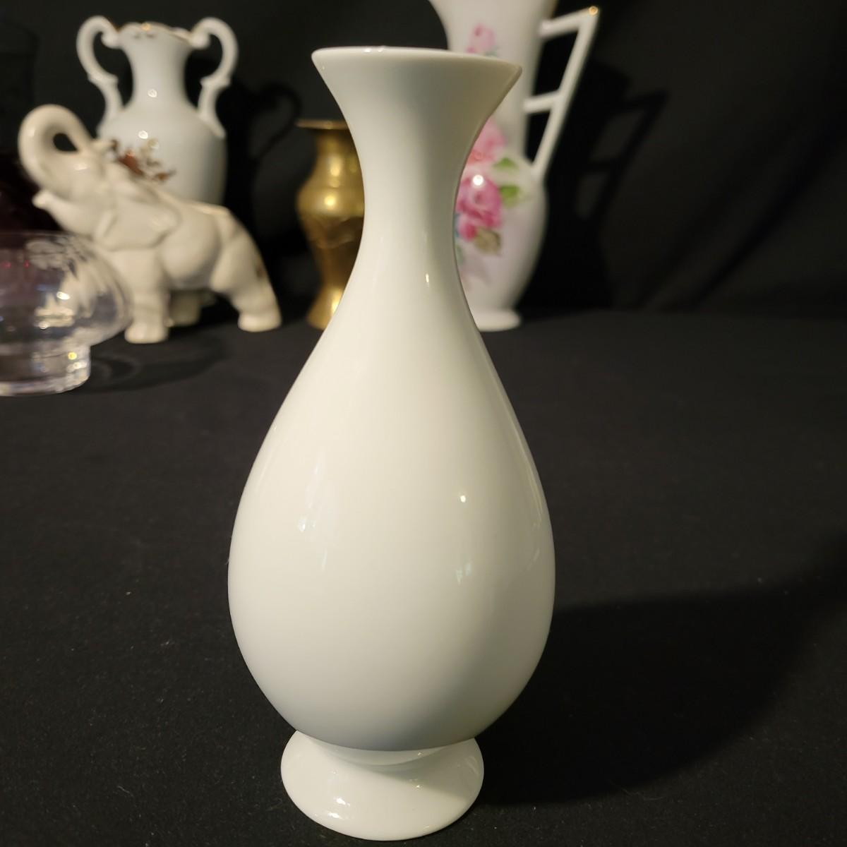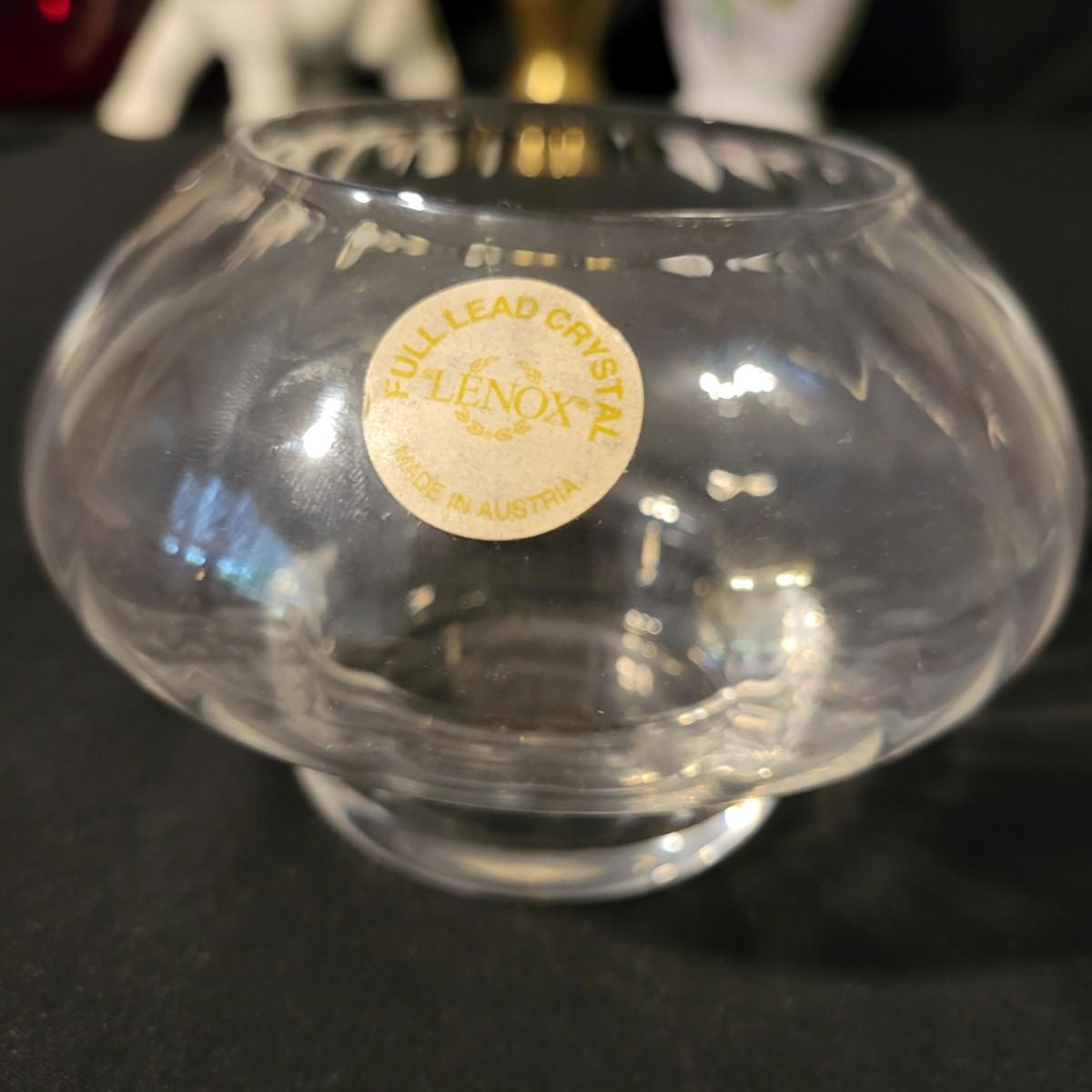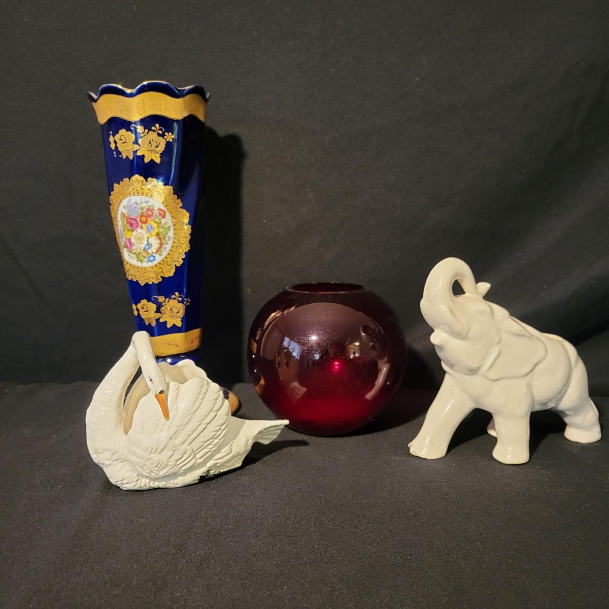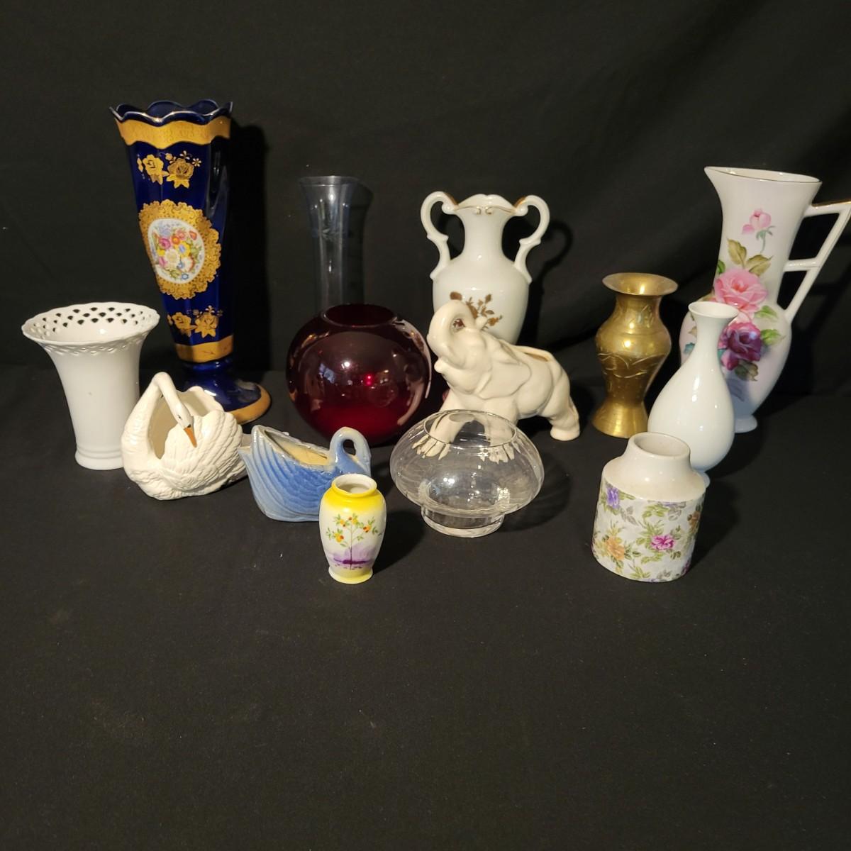 A large assortment of china, glass, ceramic and brass vases in good condition. The red globe vase has two minor chips and the elephant has a chip on its foot. This lot includes a small white bud vase by Limoges and a full leaded crystal piece by Lenox. See attached pictures for full inventory. Largest blue and gold vase measures approximately 4" x 10.5". Local pickup only