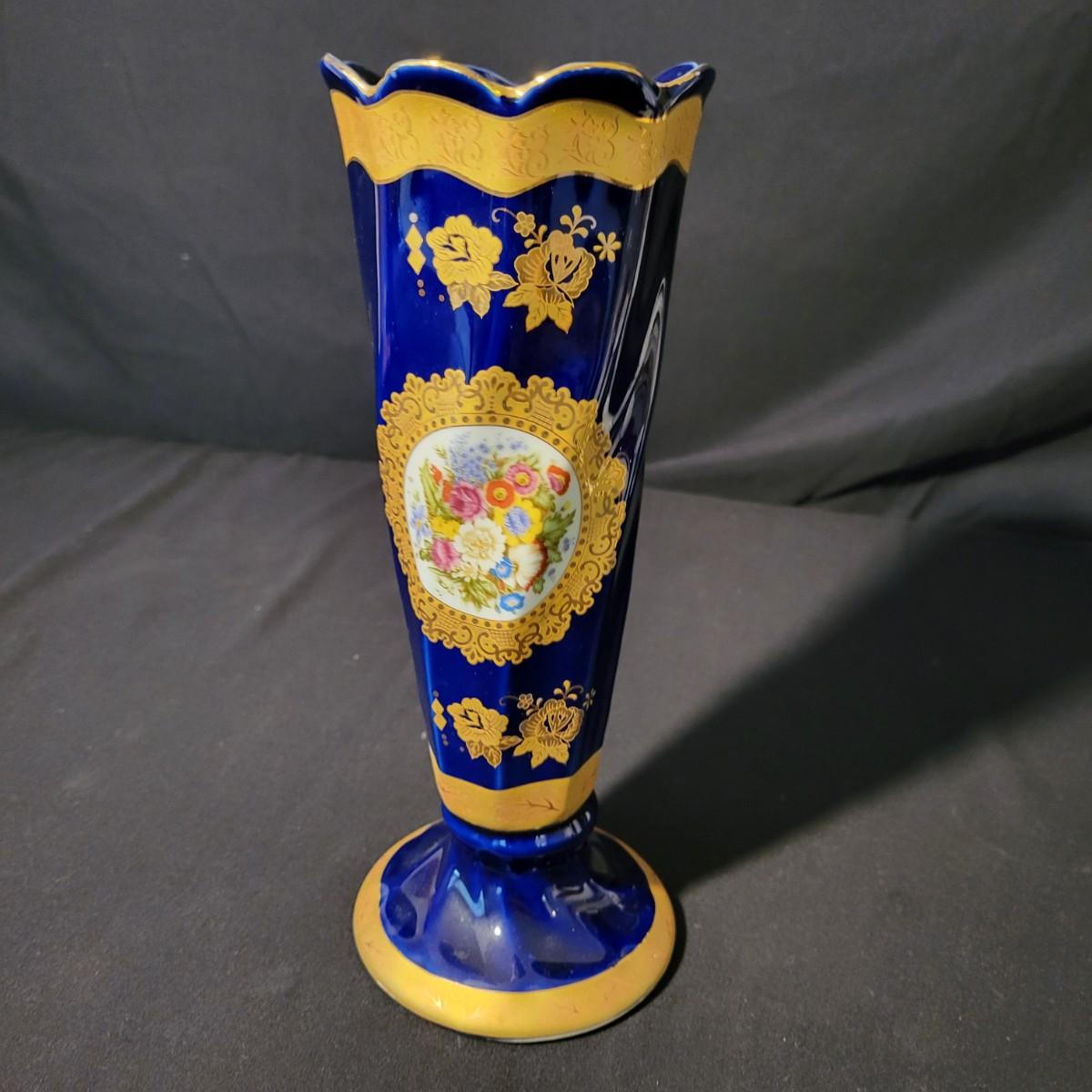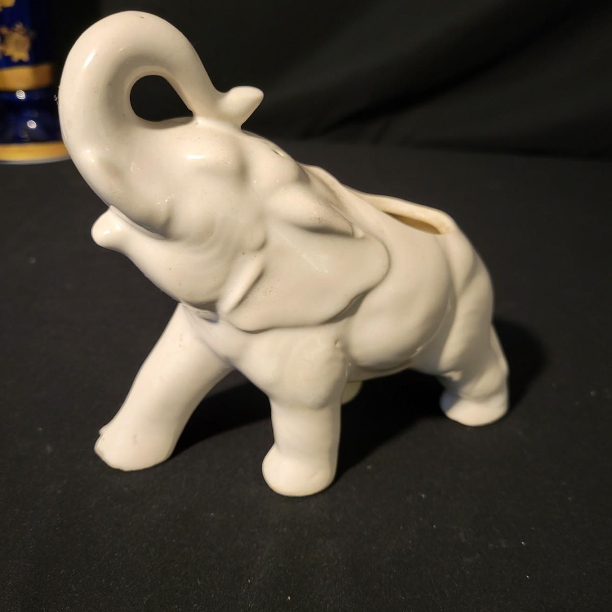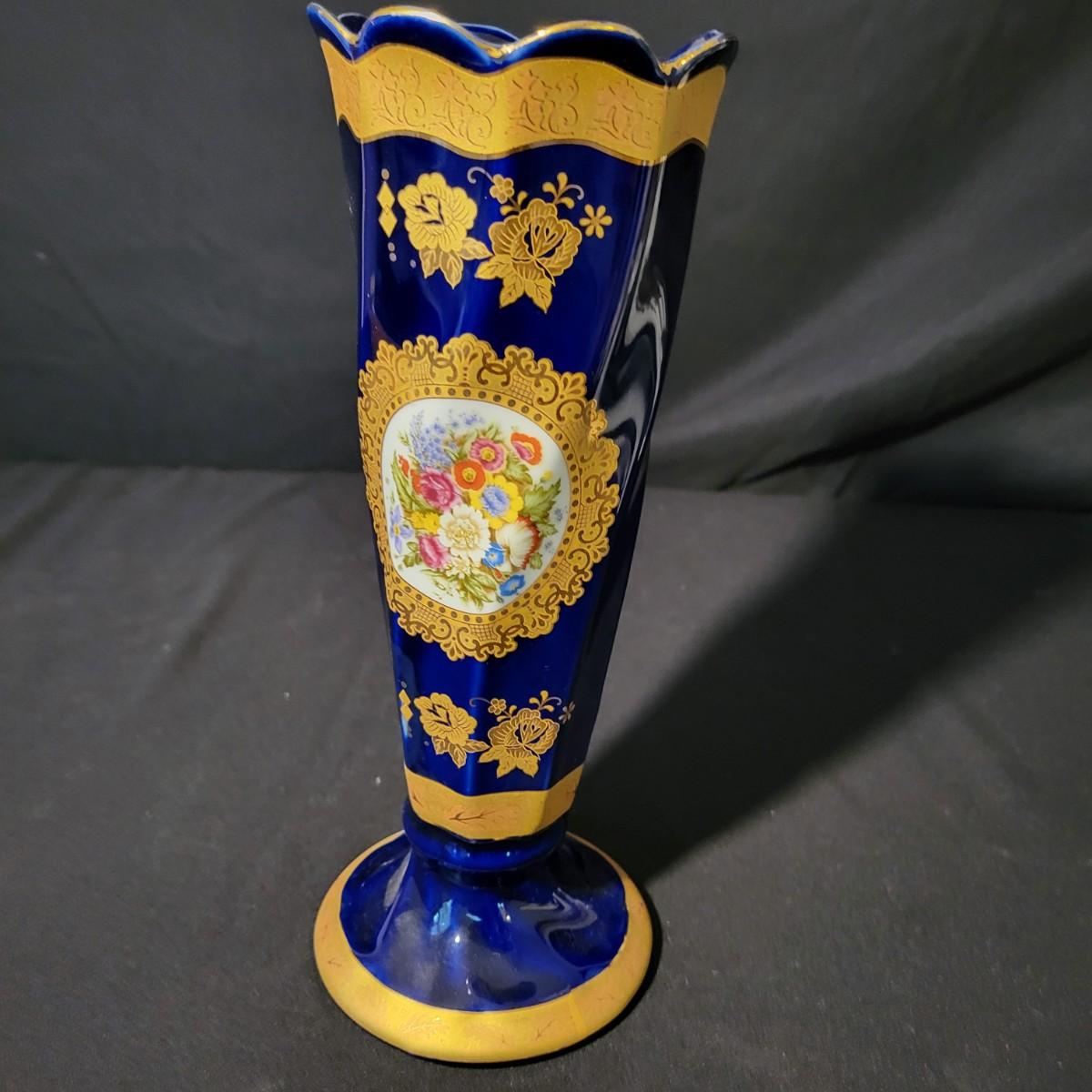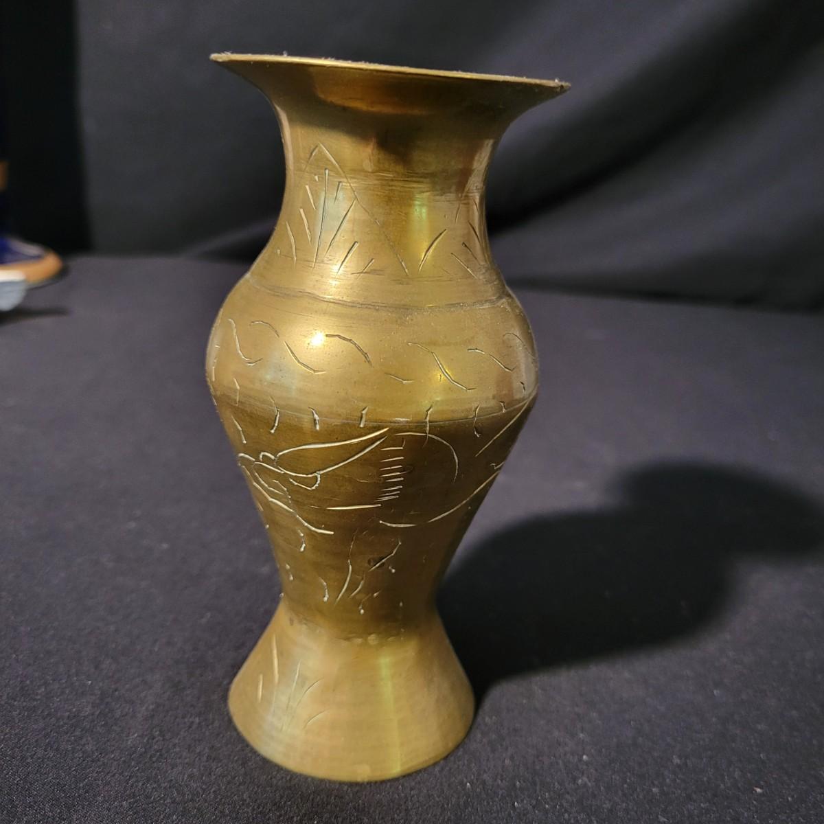 A large assortment of china, glass, ceramic and brass vases in good condition. The red globe vase has two minor chips and the elephant has a chip on its foot. This lot includes a small white bud vase by Limoges and a full leaded crystal piece by Lenox. See attached pictures for full inventory. Largest blue and gold vase measures approximately 4" x 10.5". Local pickup only