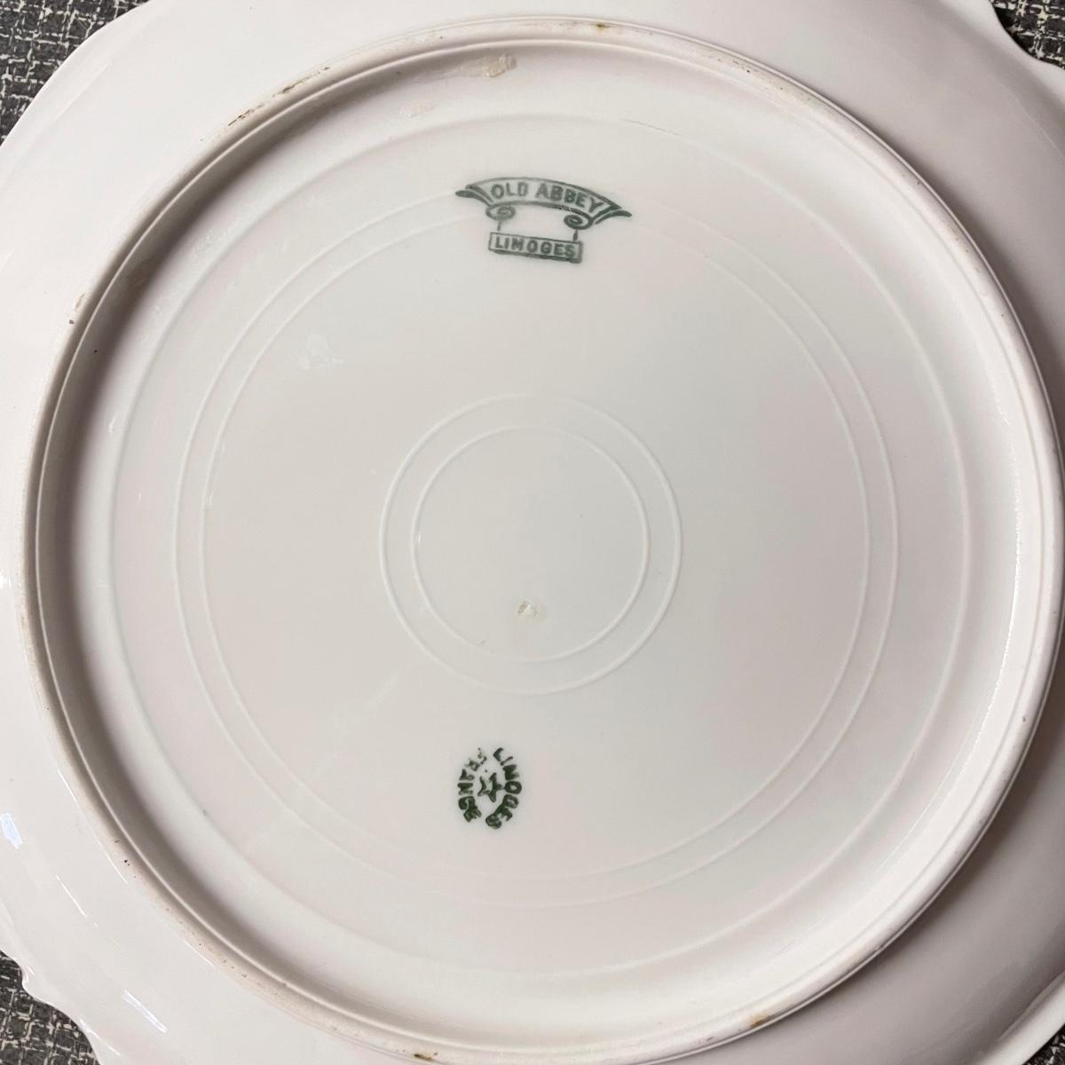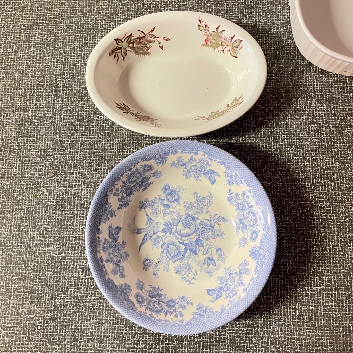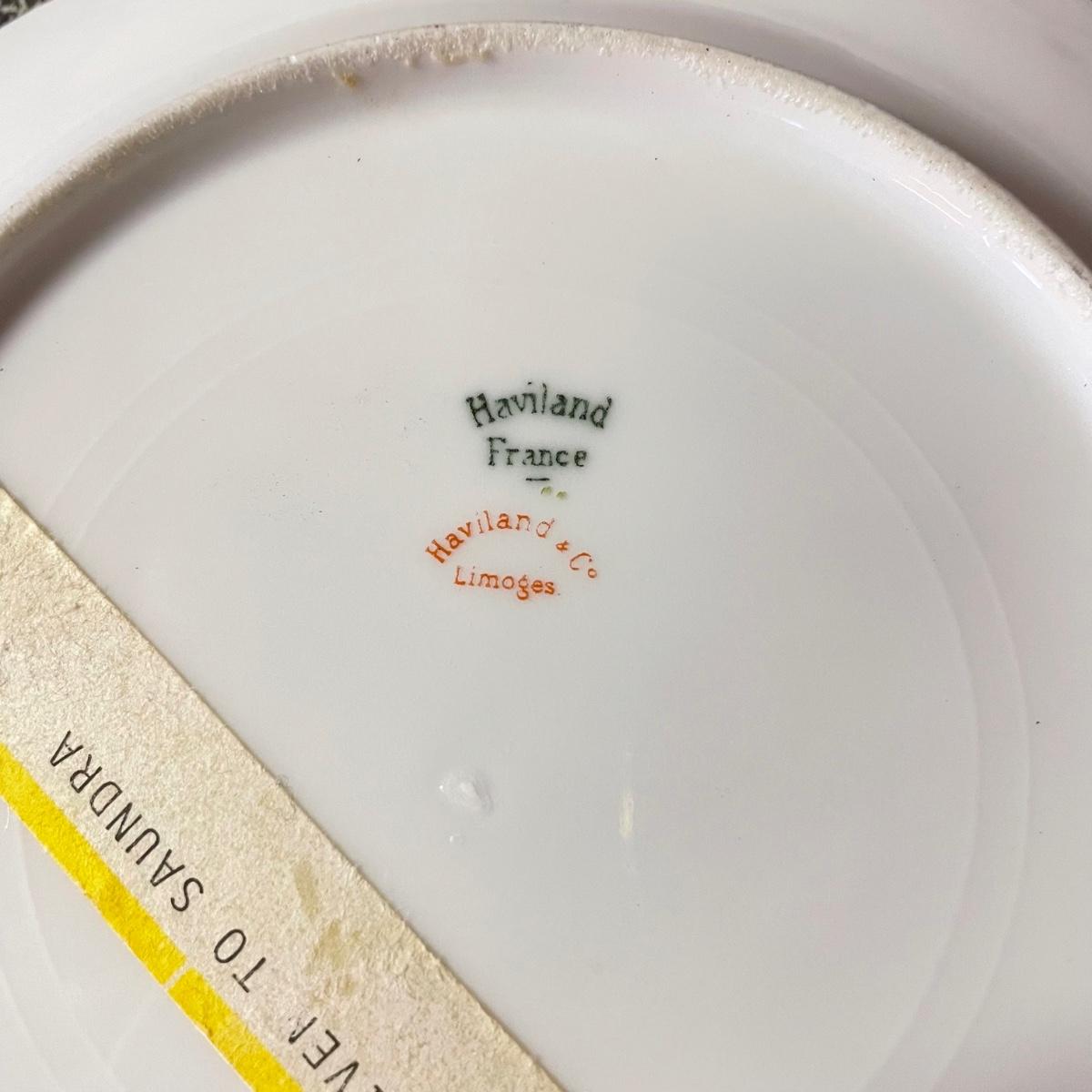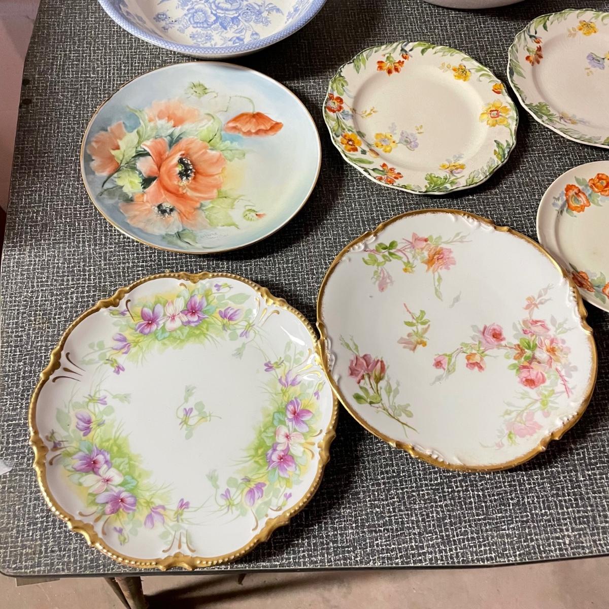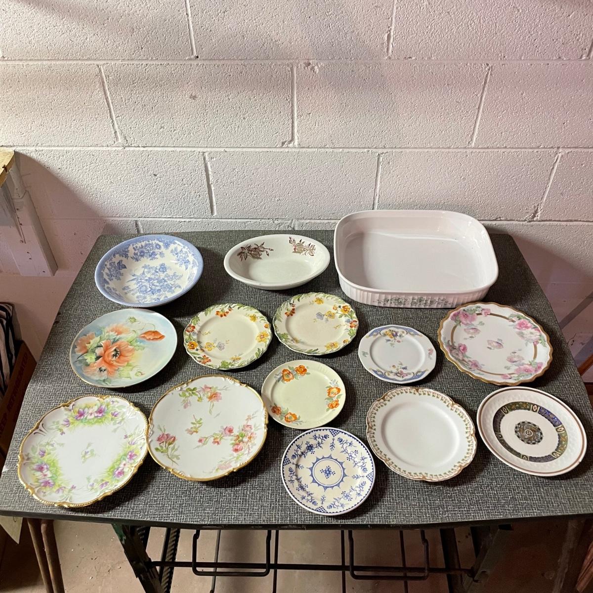Eleven plates of fine china along with three vintage stoneware dishes. Many dishes are marked Limoges, and some chips were noted in photos. See images. The Corning 4.5 liter casserole dish measures 14” x 12”. Shipping available.