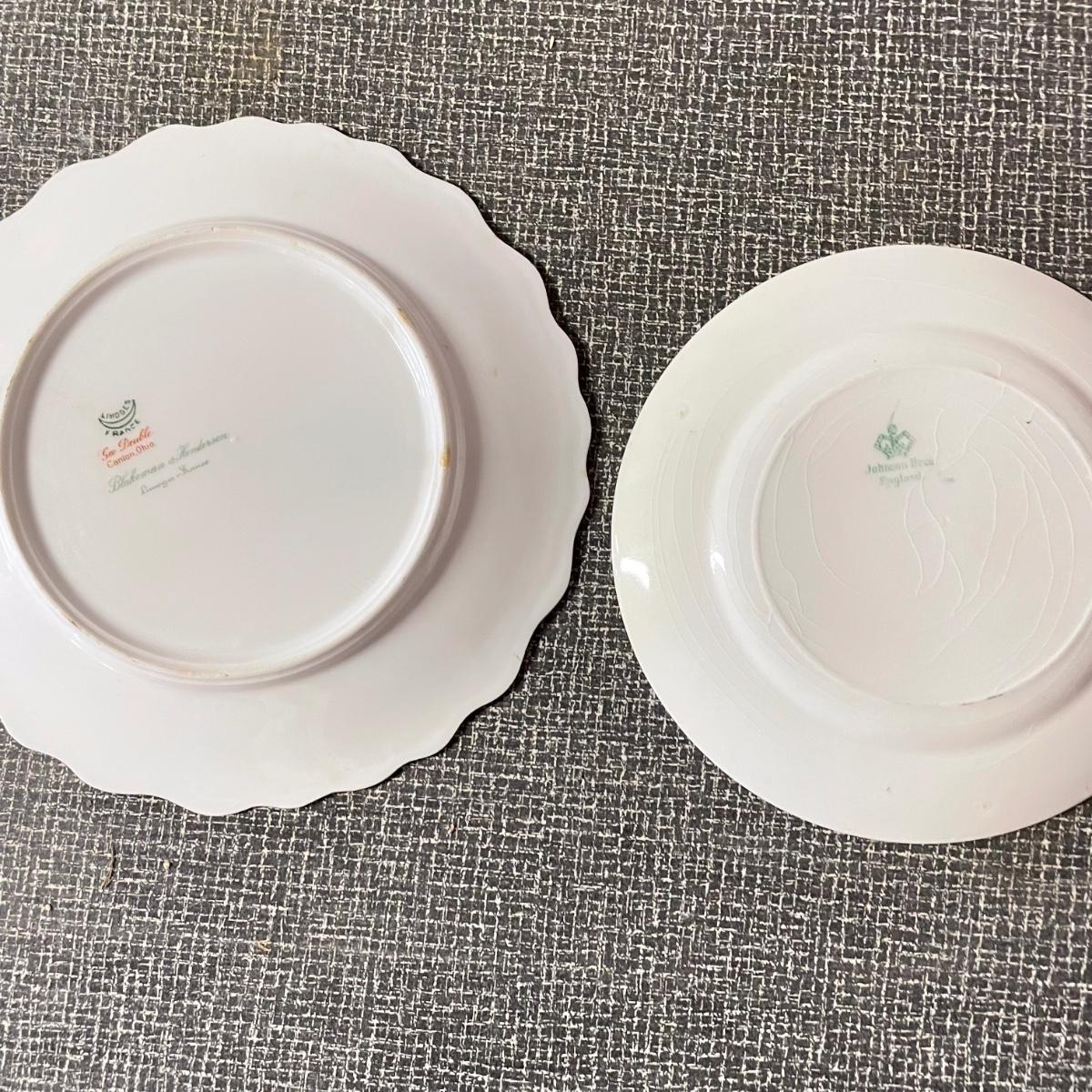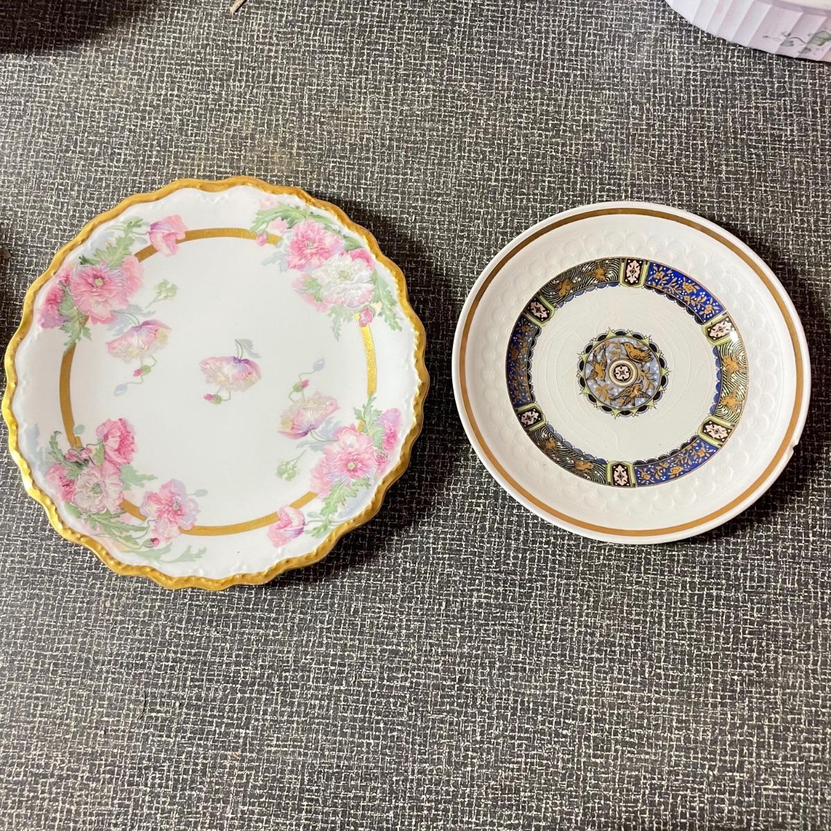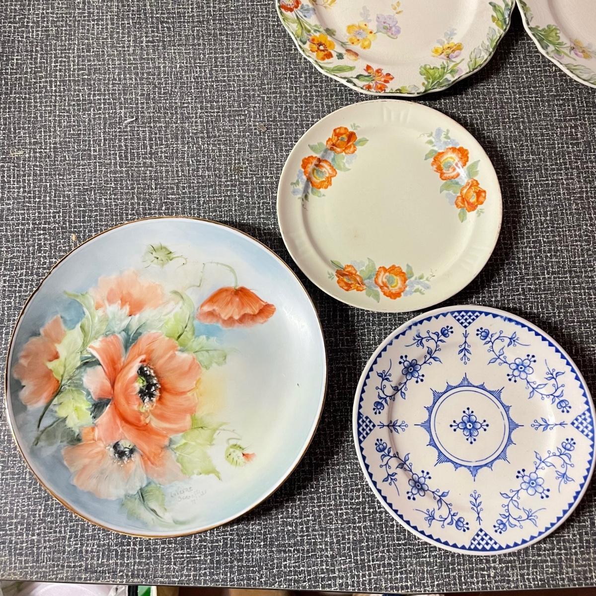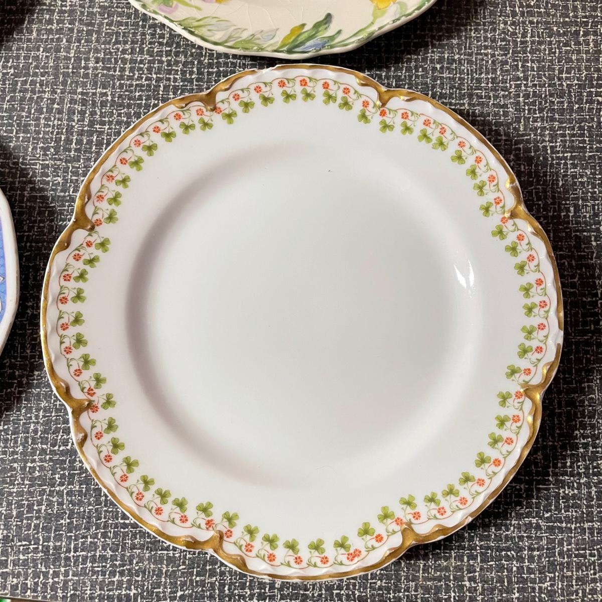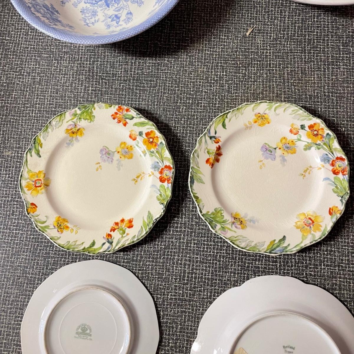 Eleven plates of fine china along with three vintage stoneware dishes. Many dishes are marked Limoges, and some chips were noted in photos. See images. The Corning 4.5 liter casserole dish measures 14” x 12”. Shipping available.