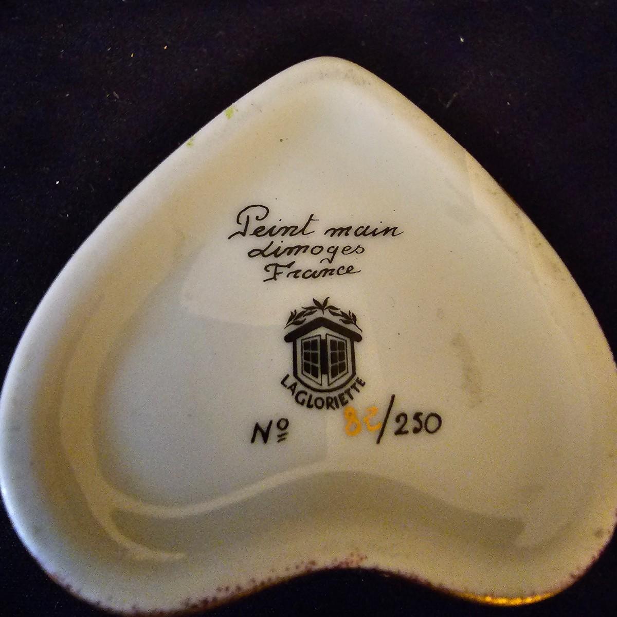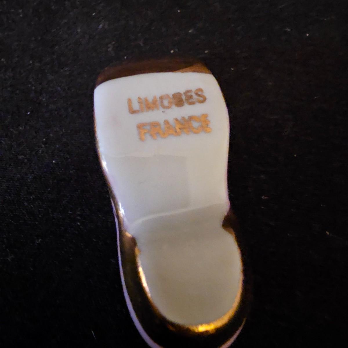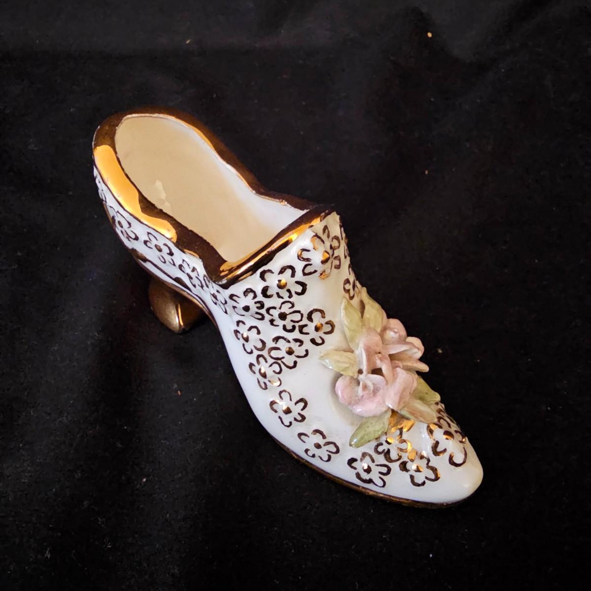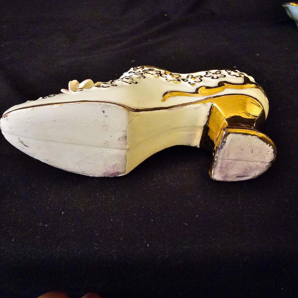 A small collection of fine porcelain items including two Limoges pieces. Heart box is 2.25" x 2.25" x 1.5" h, has hinged lid, is numbered. Tiny pink Limoges shoe is only 1.75" long, has gold accents. Larger white/gold shoe is 4.25", has delicate roses on toe. Round bowl, marked Japan, is 3" dia x 1" h. And round plate/bowl on stand has gold accents, is 5.5" dia. See photos for details. Shipping available.