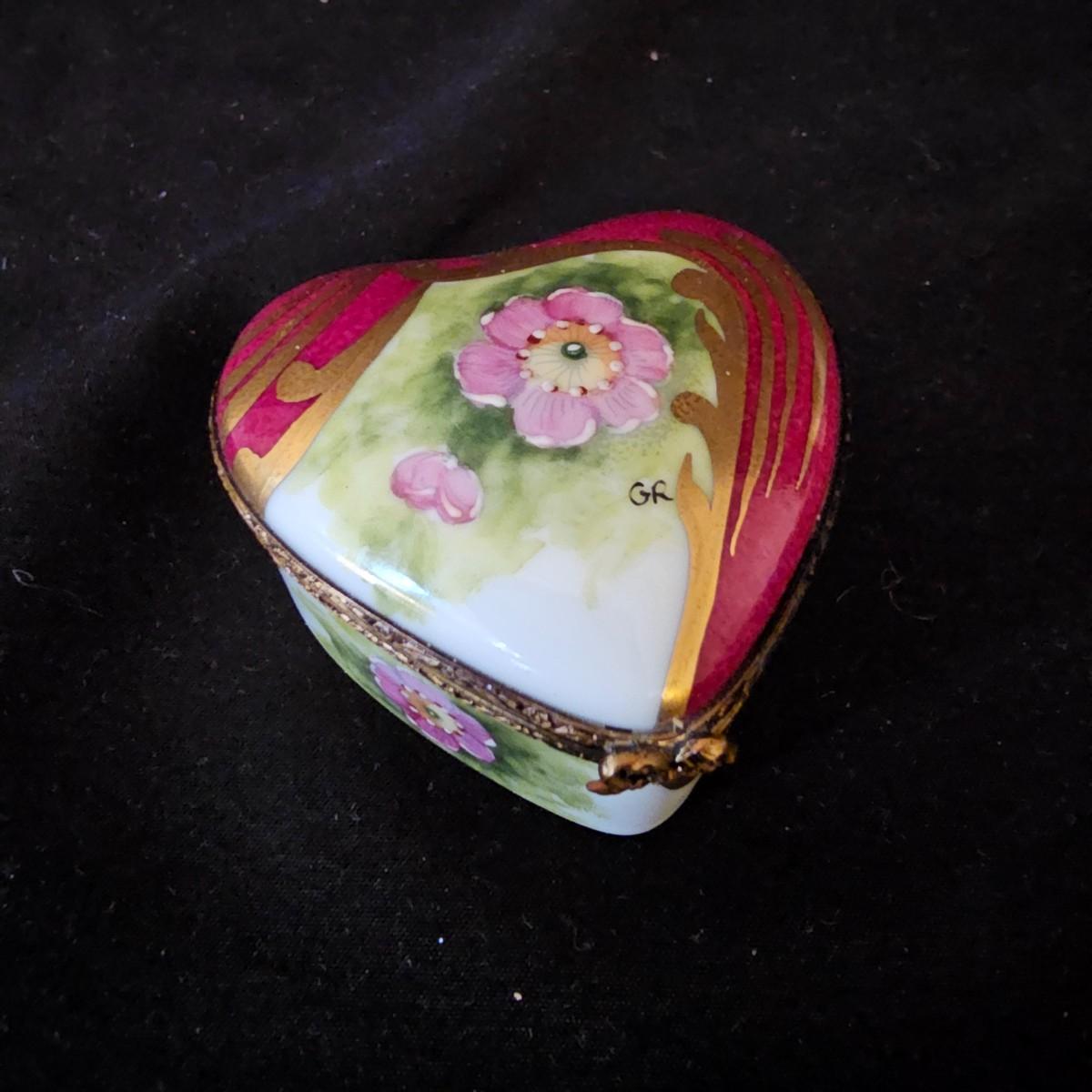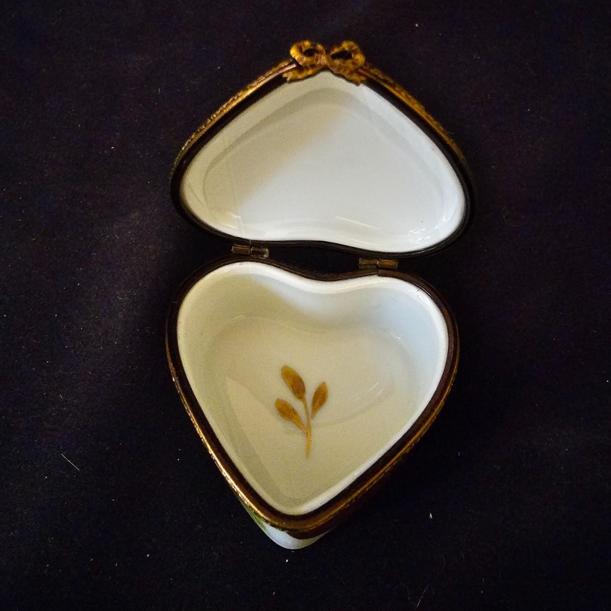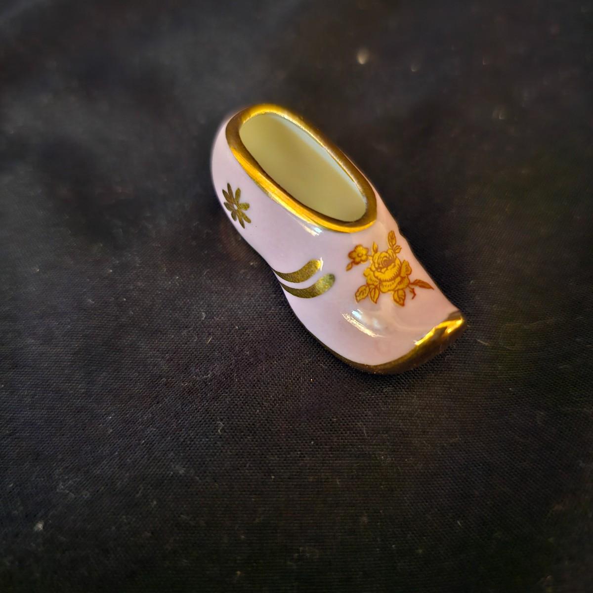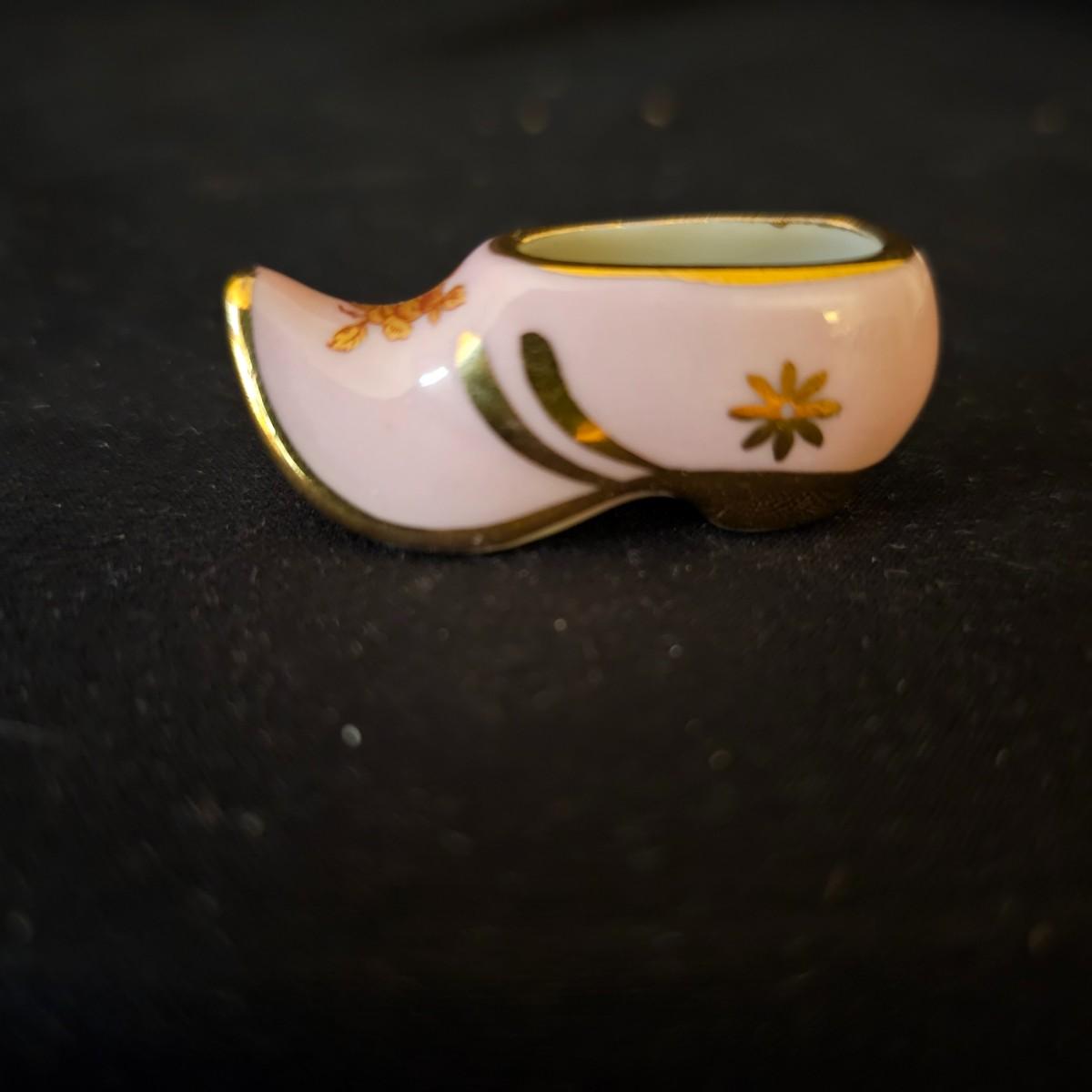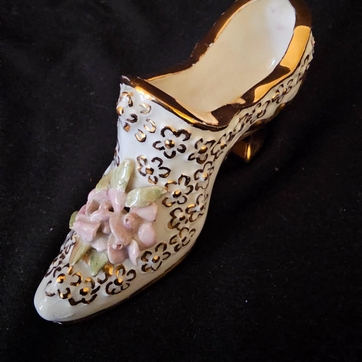 A small collection of fine porcelain items including two Limoges pieces. Heart box is 2.25" x 2.25" x 1.5" h, has hinged lid, is numbered. Tiny pink Limoges shoe is only 1.75" long, has gold accents. Larger white/gold shoe is 4.25", has delicate roses on toe. Round bowl, marked Japan, is 3" dia x 1" h. And round plate/bowl on stand has gold accents, is 5.5" dia. See photos for details. Shipping available.