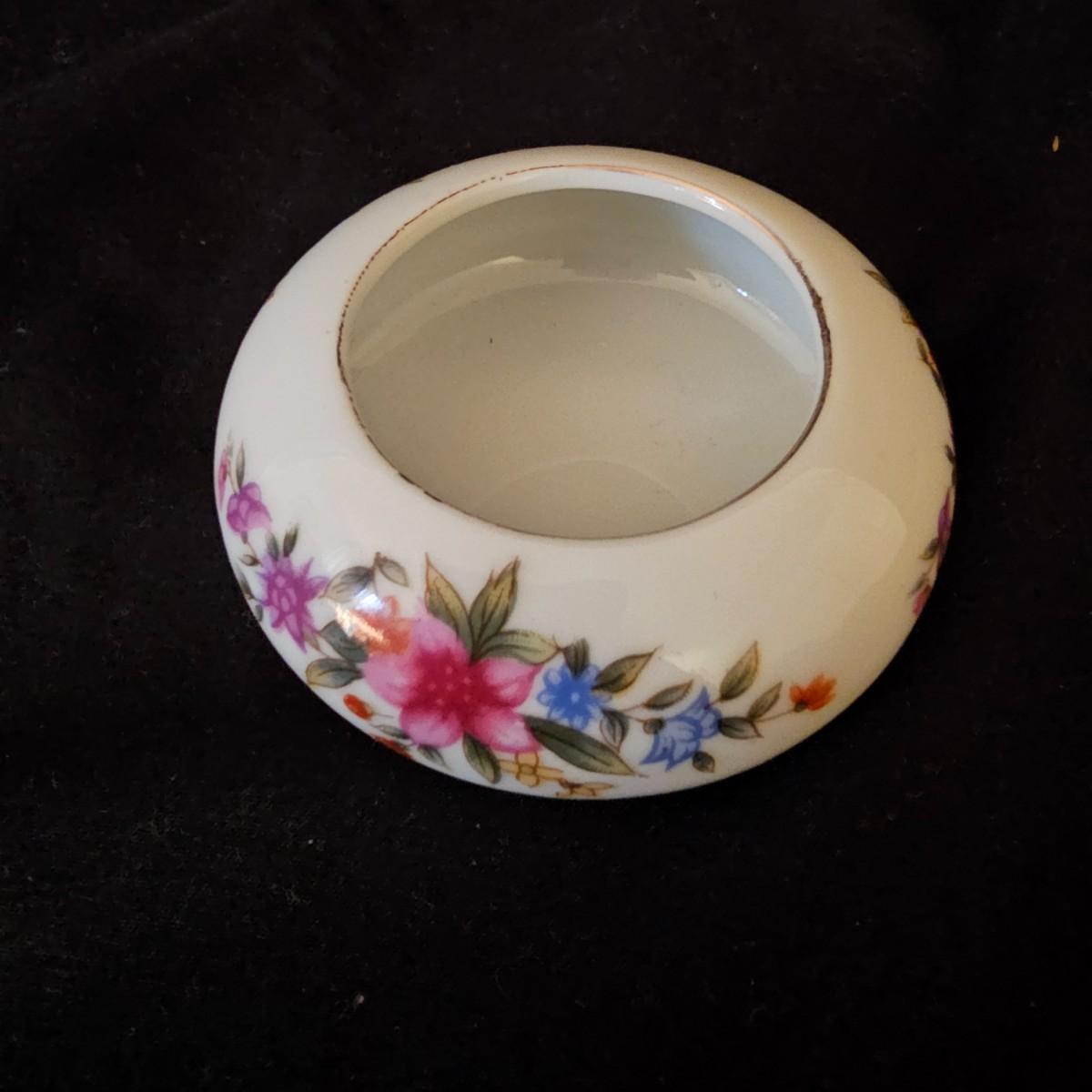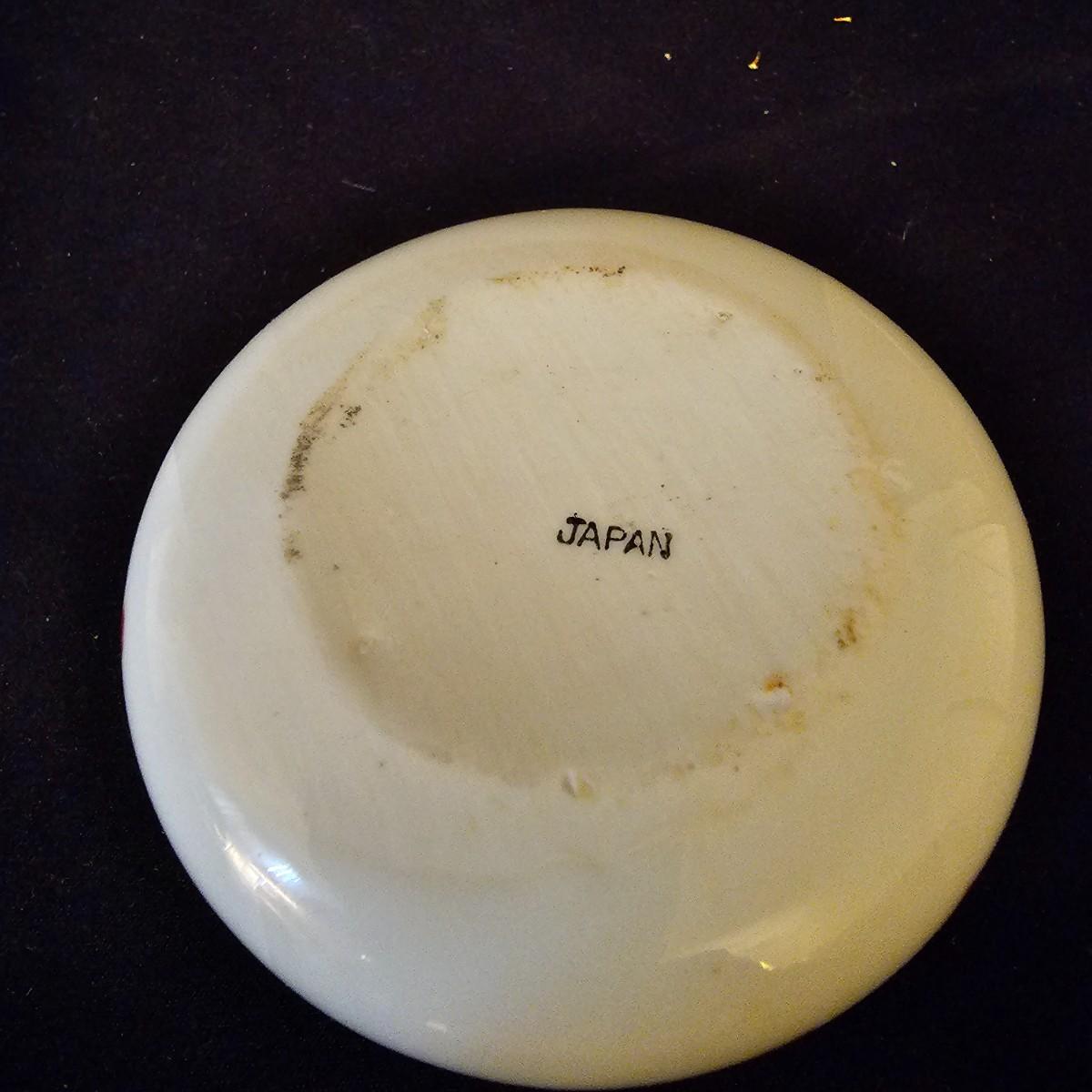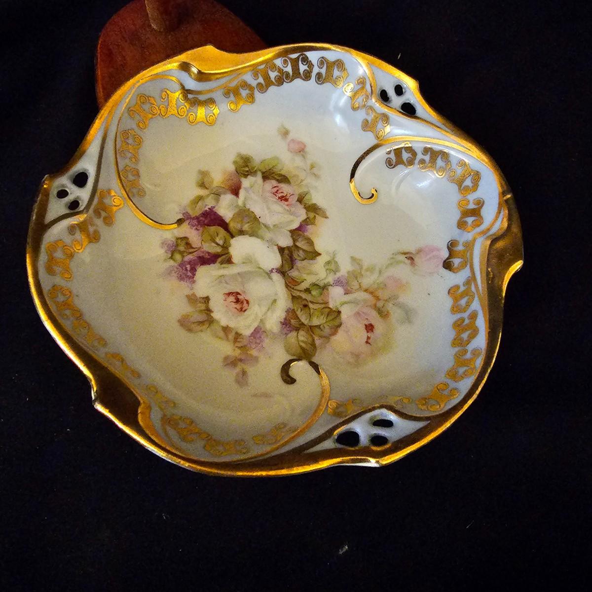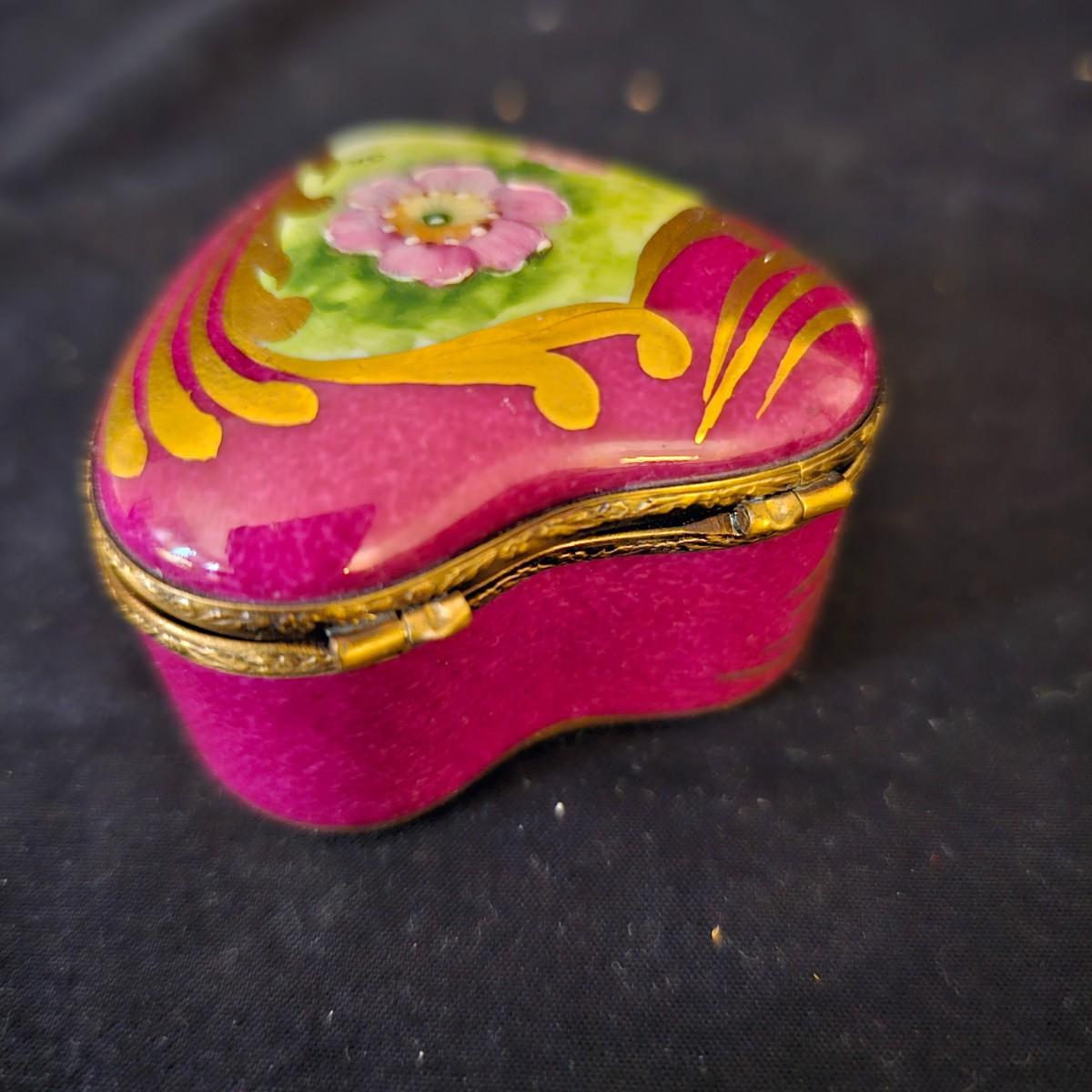 A small collection of fine porcelain items including two Limoges pieces. Heart box is 2.25" x 2.25" x 1.5" h, has hinged lid, is numbered. Tiny pink Limoges shoe is only 1.75" long, has gold accents. Larger white/gold shoe is 4.25", has delicate roses on toe. Round bowl, marked Japan, is 3" dia x 1" h. And round plate/bowl on stand has gold accents, is 5.5" dia. See photos for details. Shipping available.