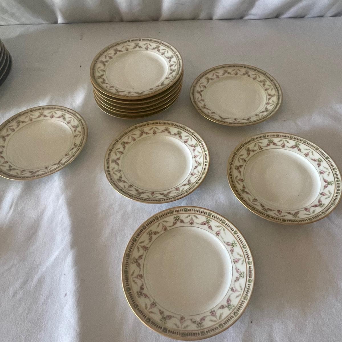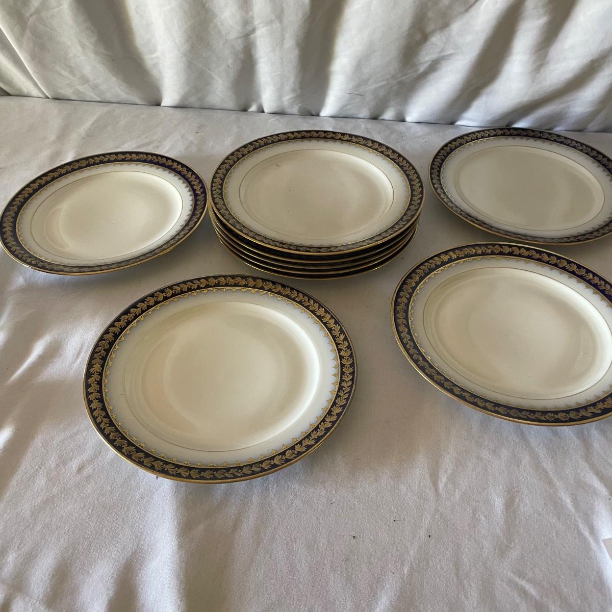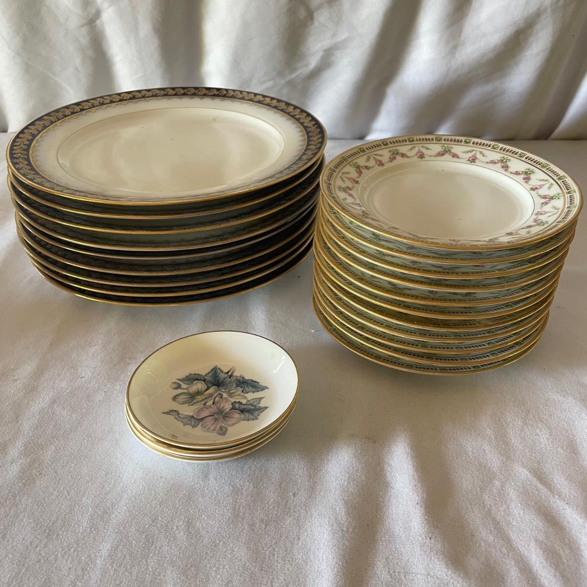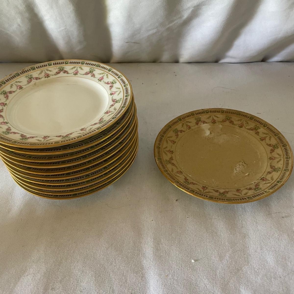 This lot has 9 Limoges gold rimmed dinner plates with just one small chip in one plate. There are 11 Limoges gold rimmed side plates with one that has a lot of discoloration. Lot also includes 3 small gold rimmed Royal Worcester dishes.