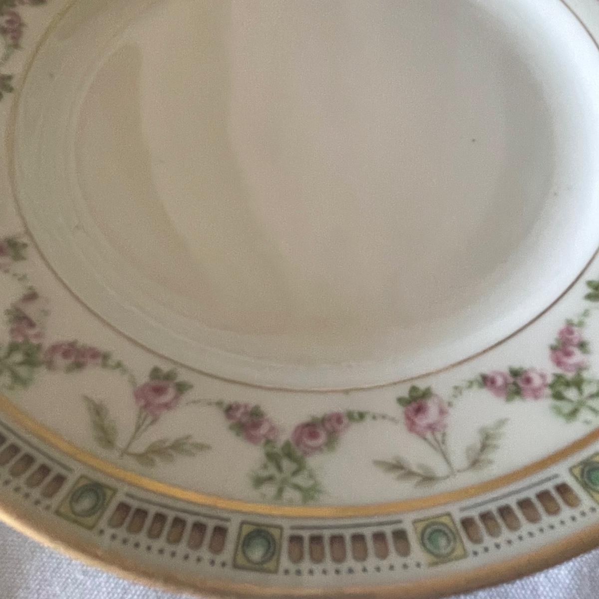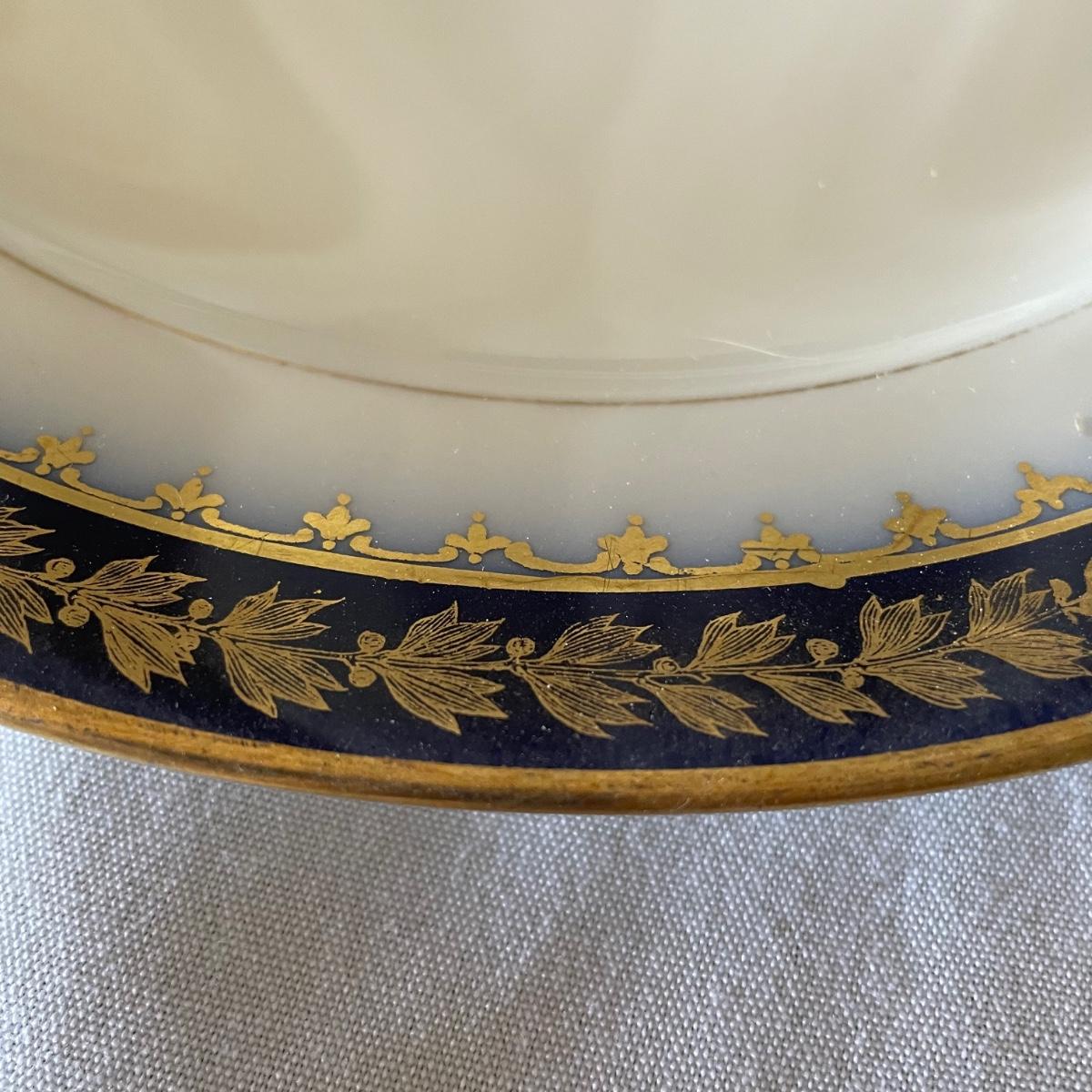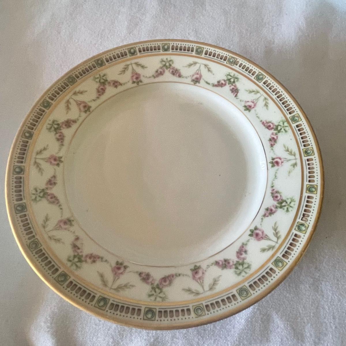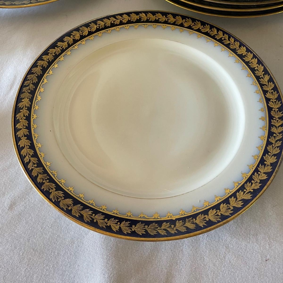 This lot has 9 Limoges gold rimmed dinner plates with just one small chip in one plate. There are 11 Limoges gold rimmed side plates with one that has a lot of discoloration. Lot also includes 3 small gold rimmed Royal Worcester dishes.
