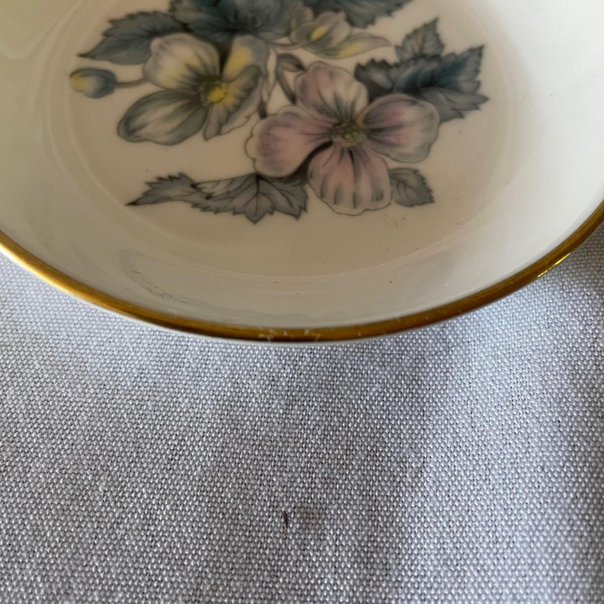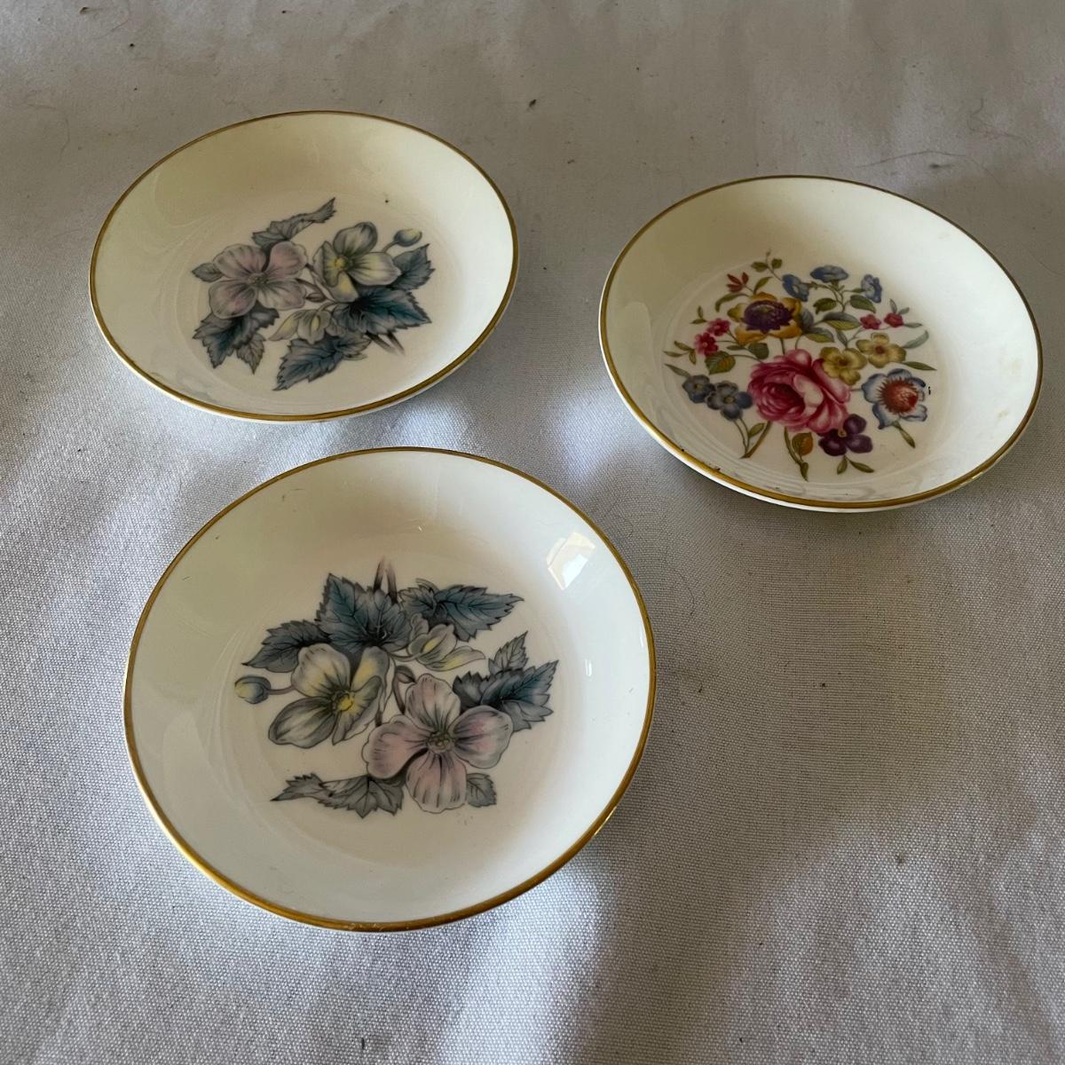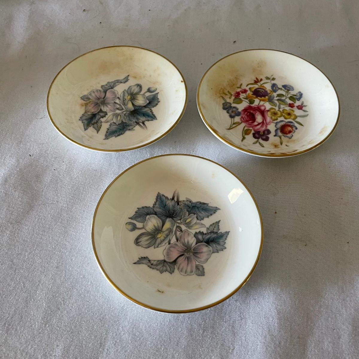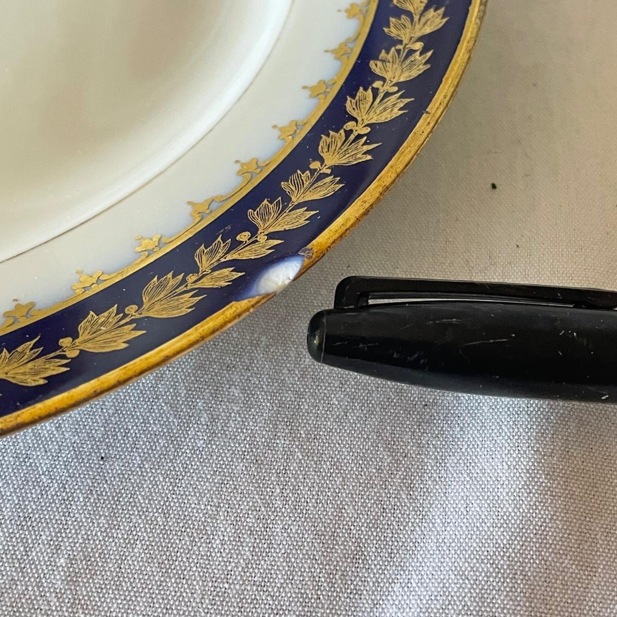 This lot has 9 Limoges gold rimmed dinner plates with just one small chip in one plate. There are 11 Limoges gold rimmed side plates with one that has a lot of discoloration. Lot also includes 3 small gold rimmed Royal Worcester dishes.