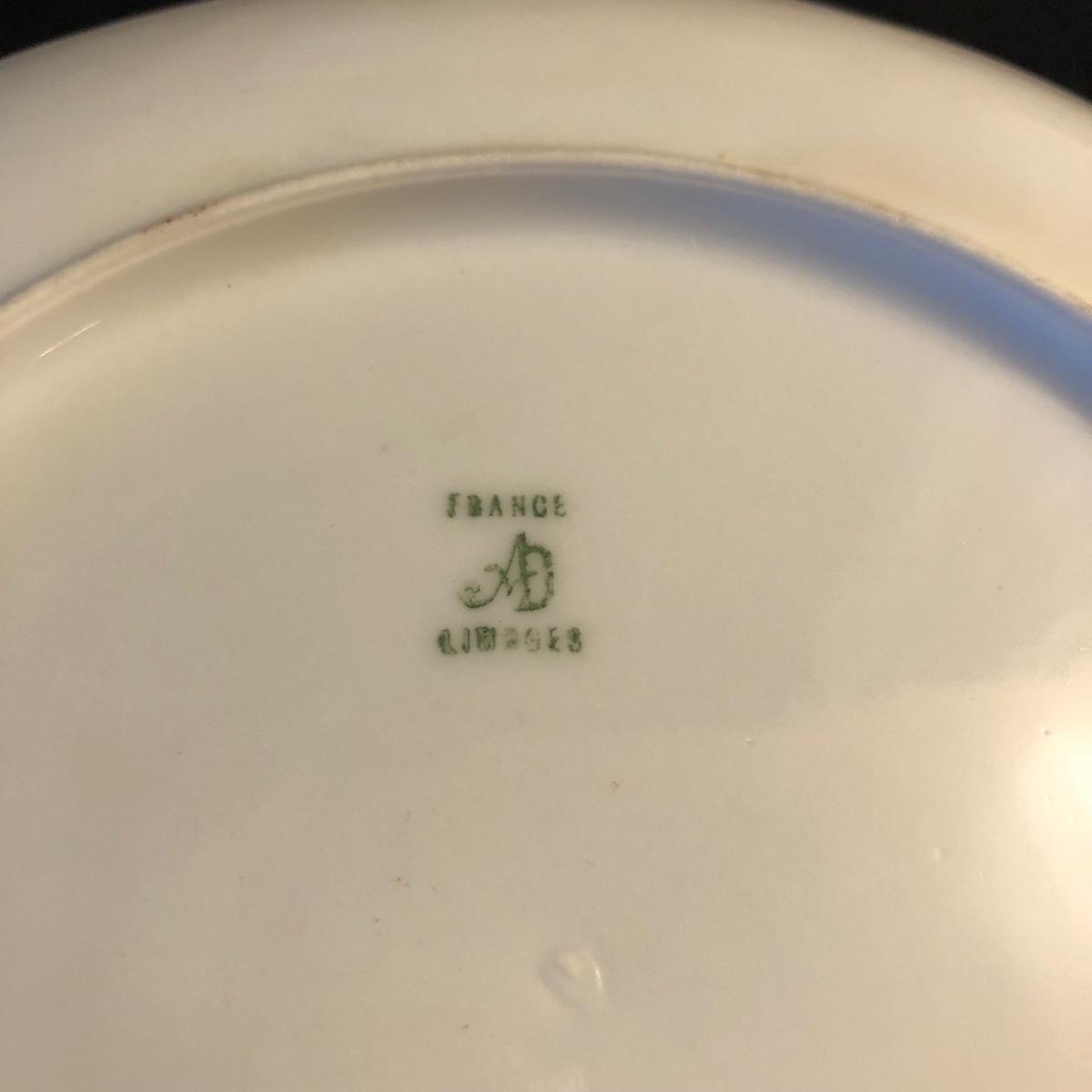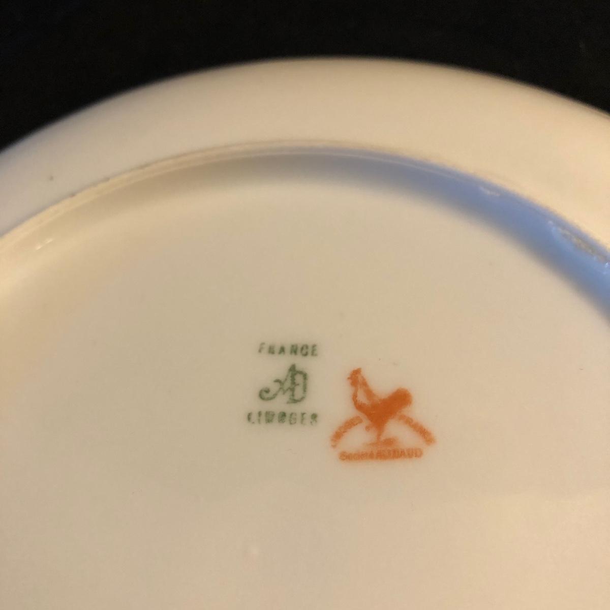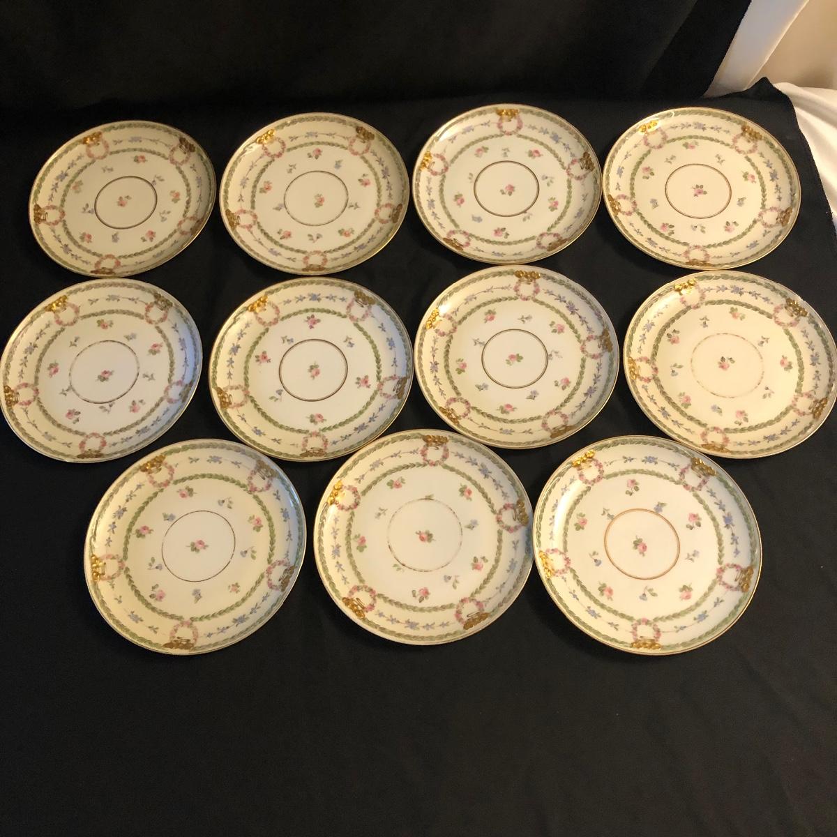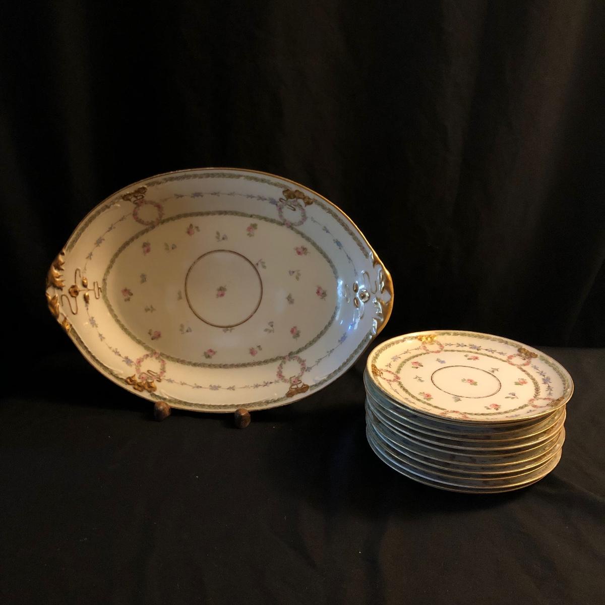 Lot includes a Limoges floral design platter and eleven Limoges desert plates in the same design. Platter measures 11” x 15.5”.