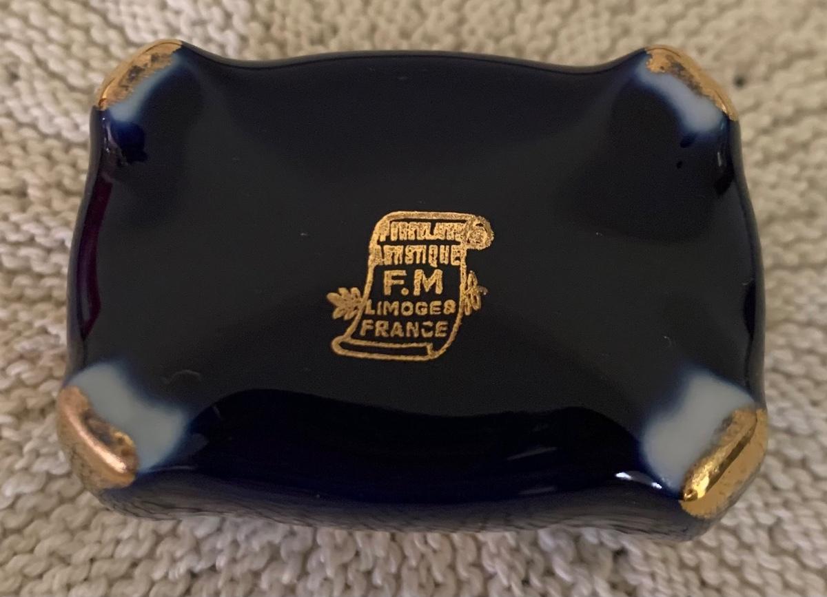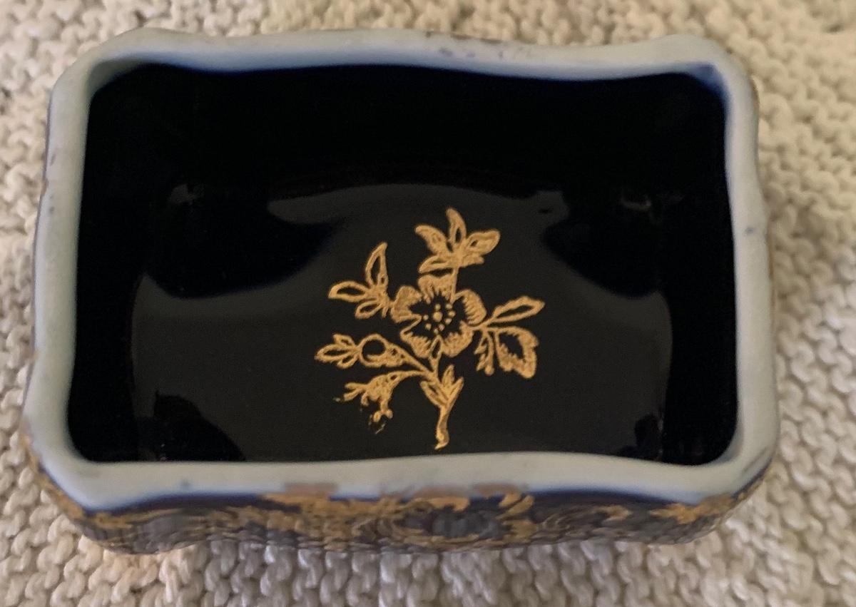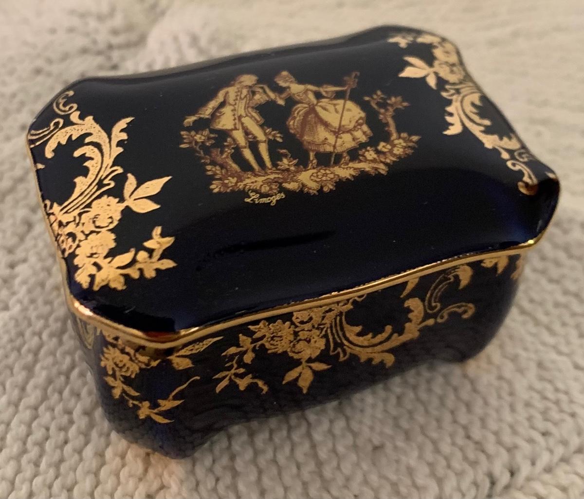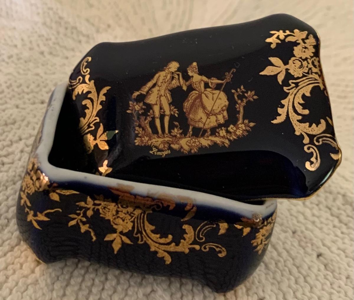 Vintage Limoges porcelain box with gold accents. Colonial courting couple image.