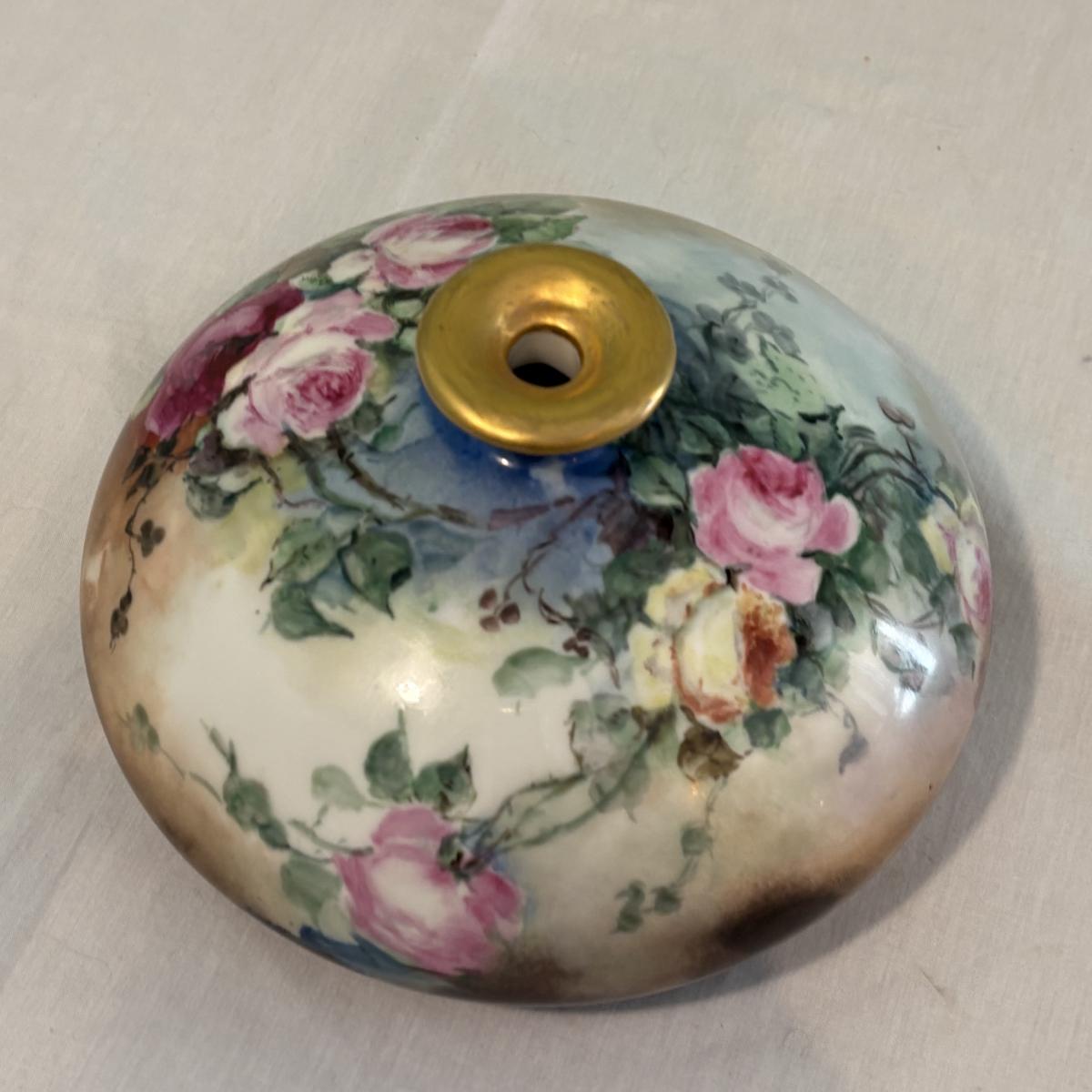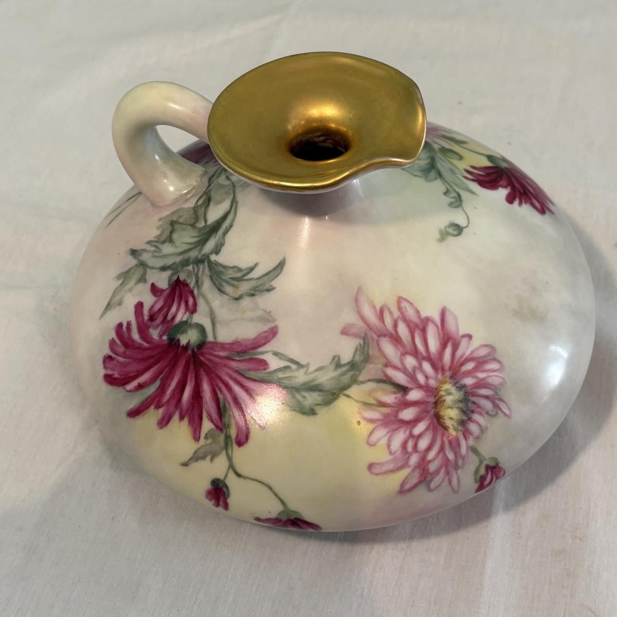 Two porcelain squat vases from the Limoges region of France, they both feature hand paintings of floral motifs with raised gold-gilded rims. They both have a diameter of approximately 10"D, with the taller one standing at ~5"H.