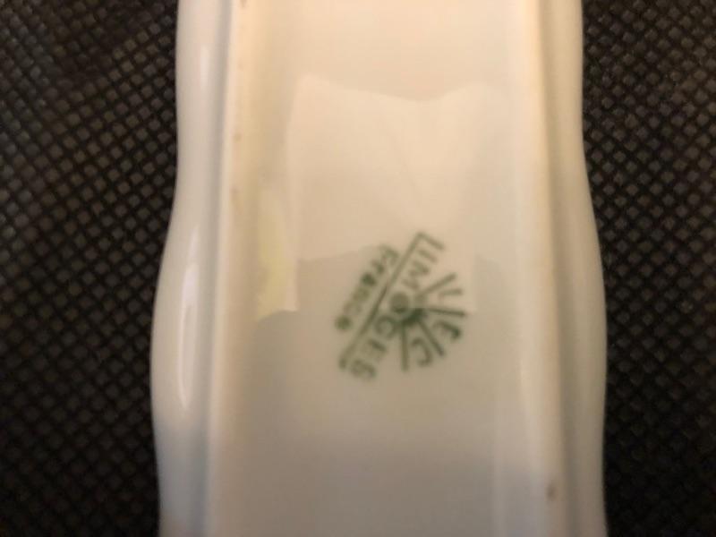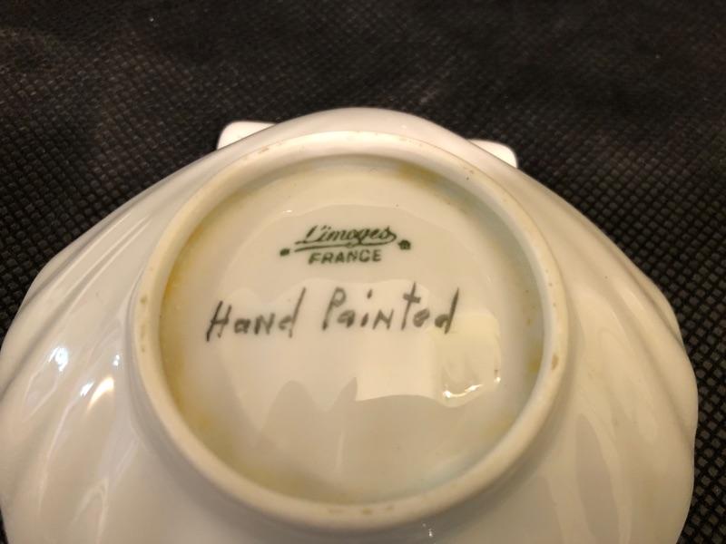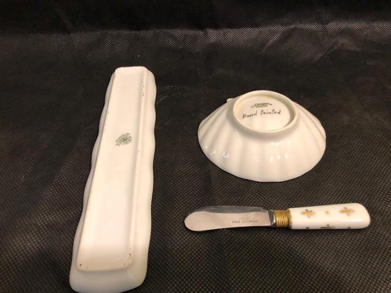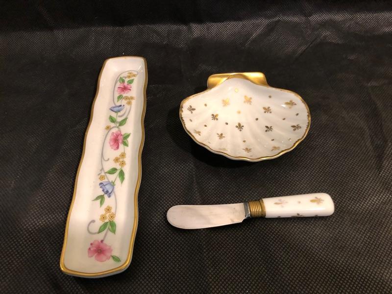 1 set of Limoges caviar dish with matching fleurd’le design along with an floral design olive dish 8in long on olive dish and 4in wide on caviar dish