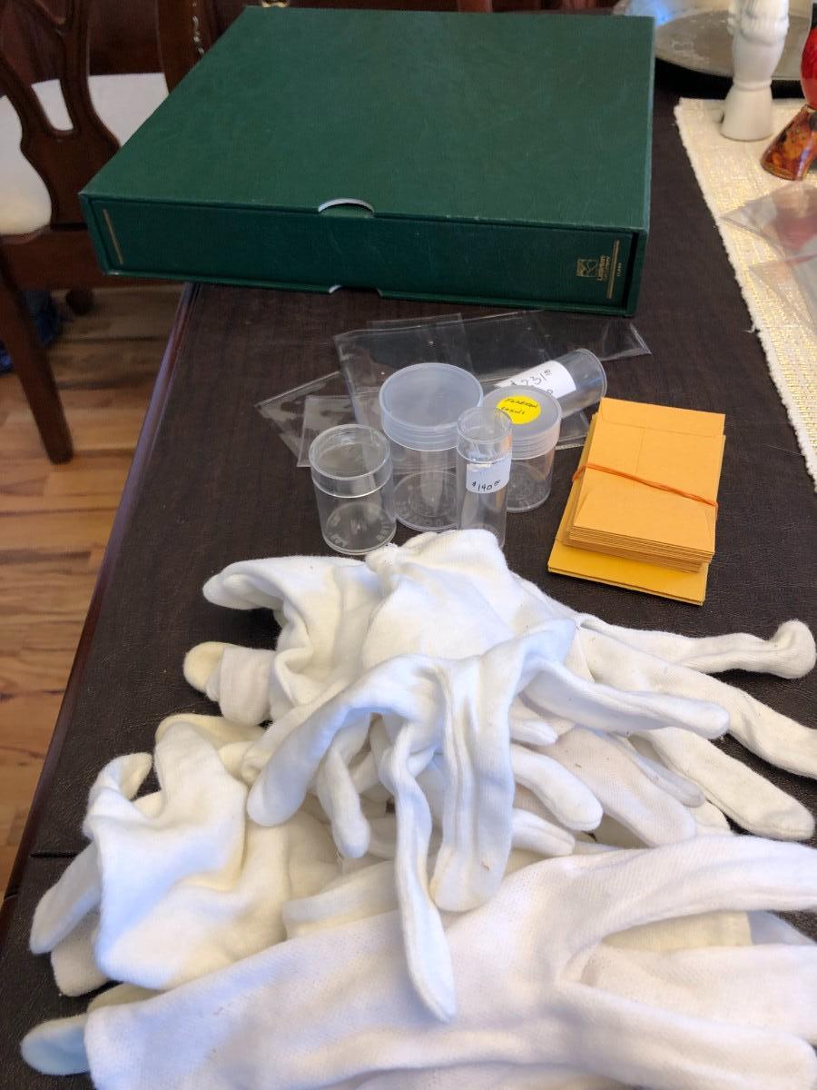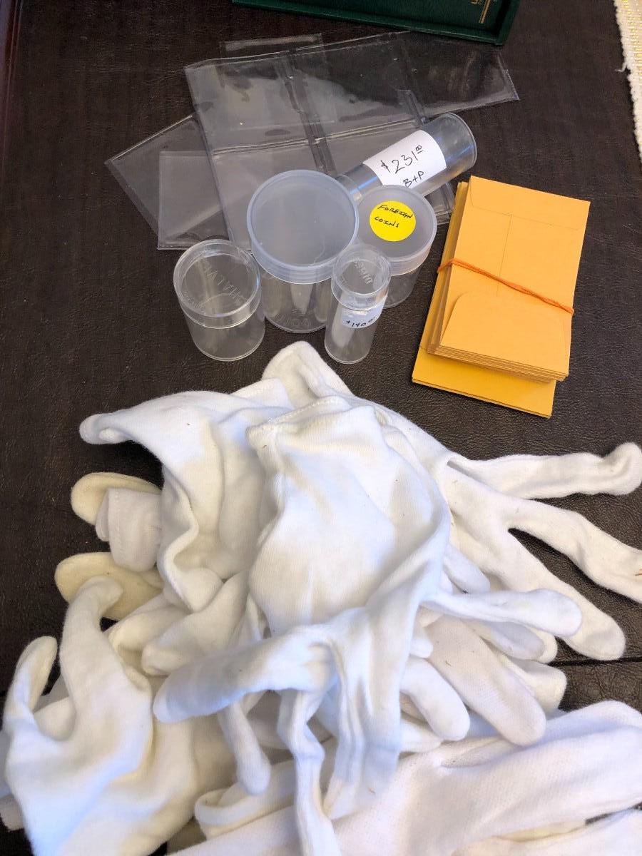 LIKE NEW ARCHIVAL QUALITY ALBUM WITH SLIP CASE AND VARIOUS COIN HANDLING GLOVES AND COLLECTING SUPPLIES
