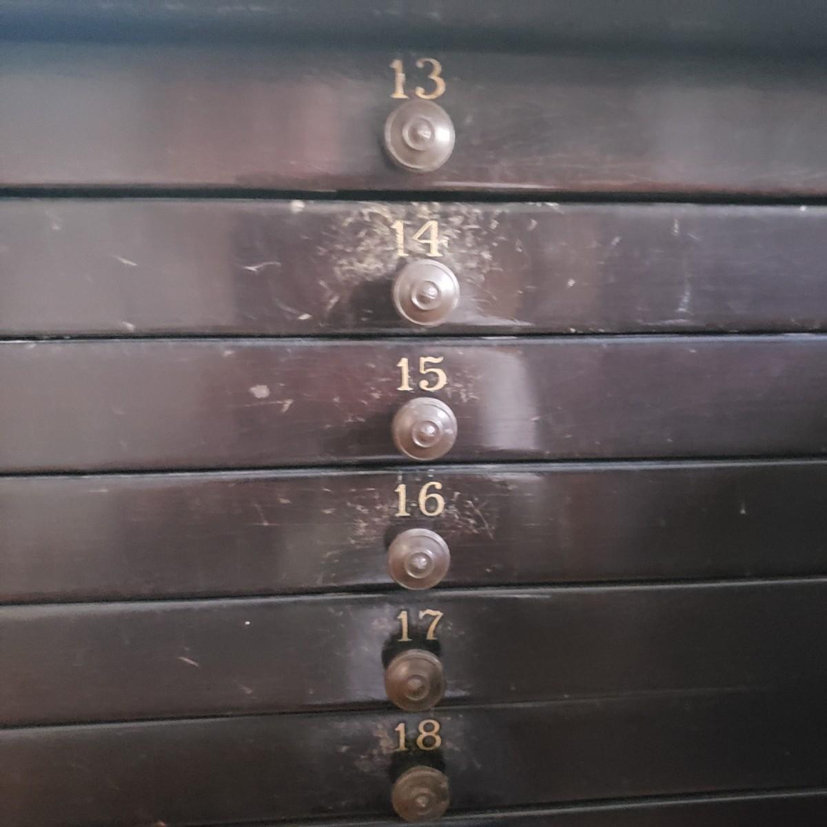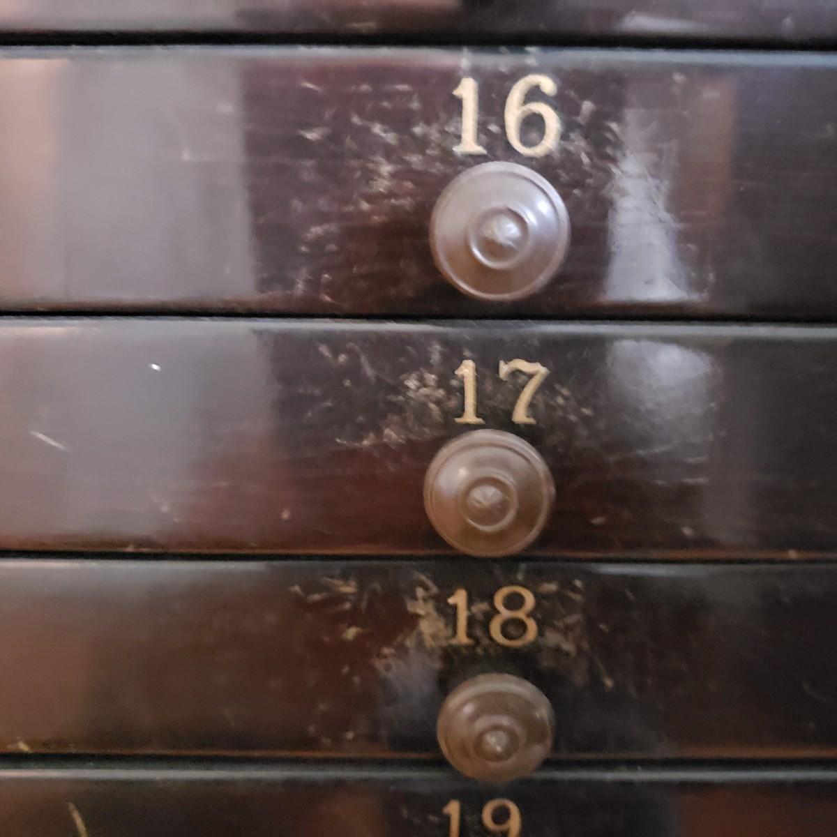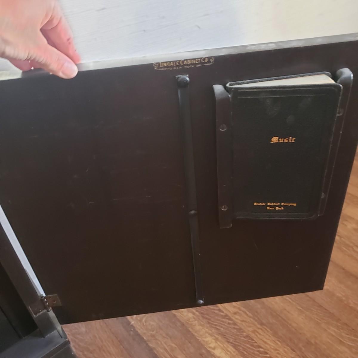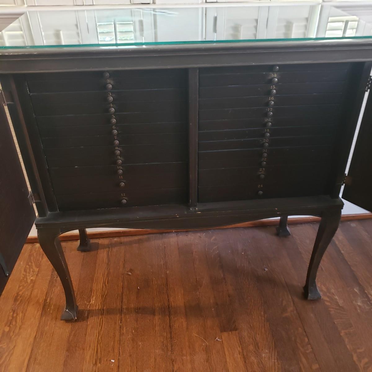 This is a Tindale Cabinet Company sheet music cabinet. The cabinet measures 38" x 16" x 38"H. The two doors open to 24 smaller drawers with open flow design. The cabinet comes with a thick glass topper for protection. The cabinet has some blemishes, yet for it's age it appears to be sturdy.