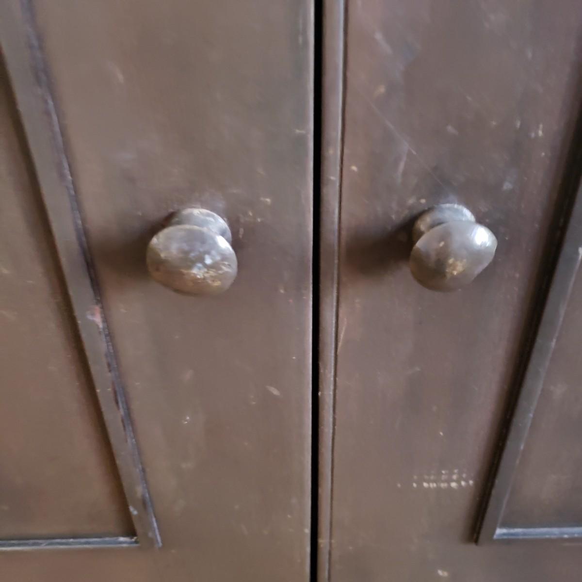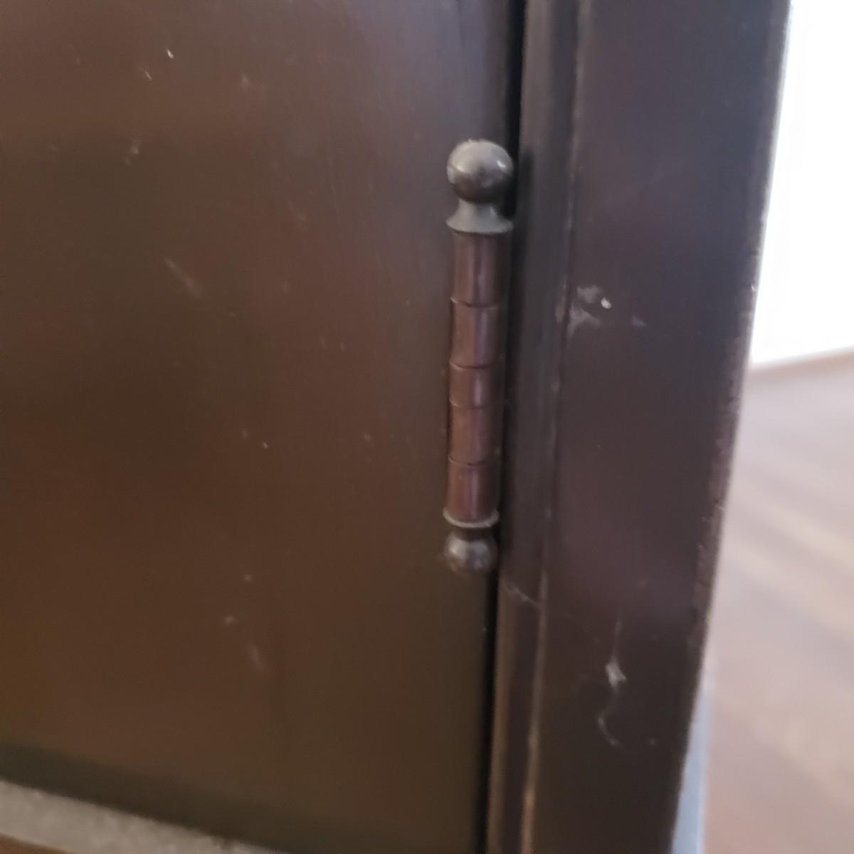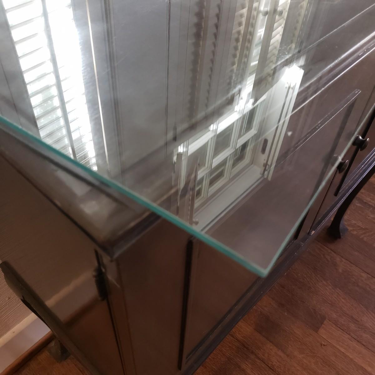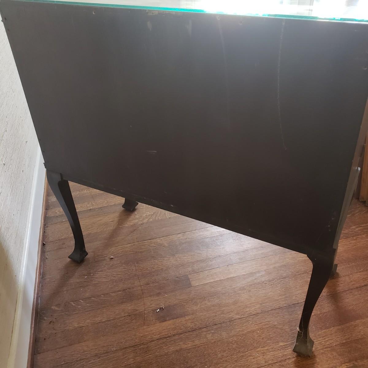 This is a Tindale Cabinet Company sheet music cabinet. The cabinet measures 38" x 16" x 38"H. The two doors open to 24 smaller drawers with open flow design. The cabinet comes with a thick glass topper for protection. The cabinet has some blemishes, yet for it's age it appears to be sturdy.
